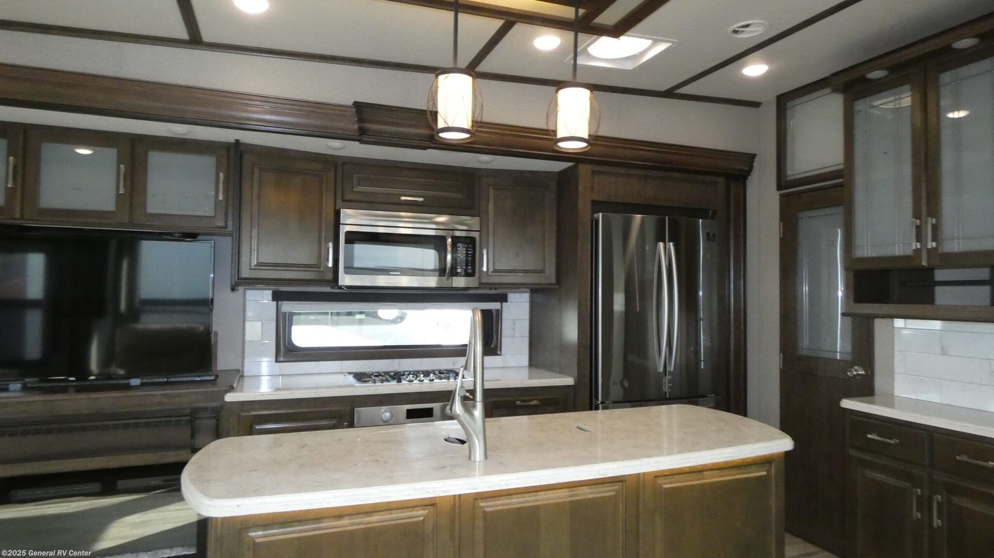Experience the pinnacle of luxury and comfort with the 2020 Grand Design Solitude 310GK. This exquisite fifth wheel is designed to be your home away from home, offering a spacious and inviting layout perfect for both relaxing and entertaining. As you enter, you'll be greeted by a stunning rear living area featuring a tri-fold sofa and theater seating, ideal for cozy evenings by the fireplace. The center kitchen is a chef's dream, equipped with a full-size refrigerator and a three-burner cooktop, ensuring you have everything you need to create culinary masterpieces on the road. The Solitude 310GK doesn't just promise comfort; it delivers it with style. The front bedroom boasts a luxurious queen bed, with an optional king, surrounded by ample storage and a flip-top dresser with a built-in LED TV for your entertainment. The center bathroom is thoughtfully designed with a shower skylight, providing a refreshing experience. With two powered retractable awnings and a pull-out kitchen option, you can easily extend your living space outdoors, making the most of your adventures. With its impressive cargo capacity and generous water tanks, the Solitude 310GK ensures you're well-prepared for extended journeys. Discover this incredible RV at your nearest General RV dealership and start planning your next getaway!
