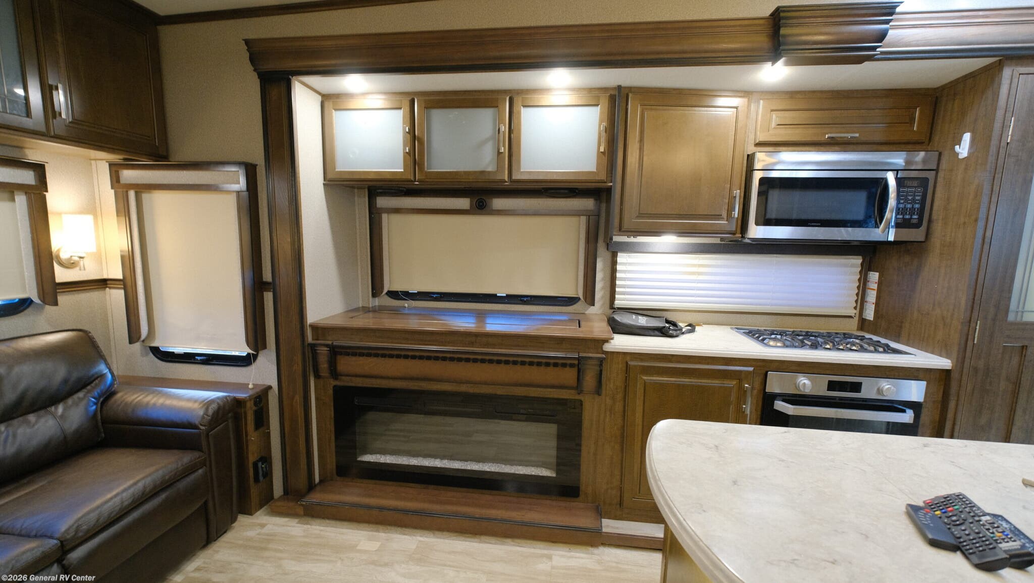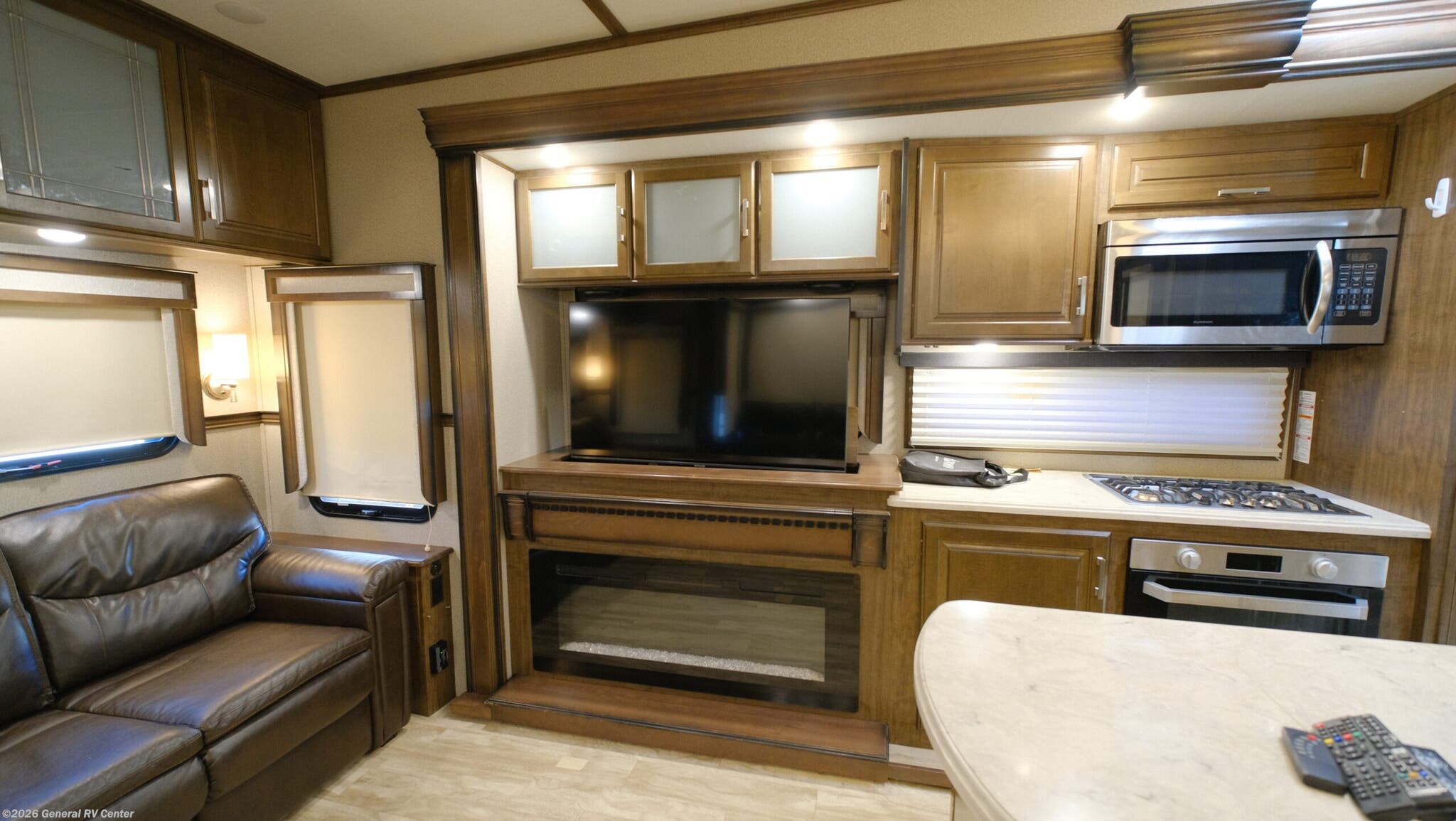 Discover the 2020 Grand Design Solitude 373FB, where luxury meets functionality in a stunning 41-foot fifth wheel. This remarkable RV invites you to enjoy a spacious retreat with its thoughtfully designed floorplan. The rear living area, featuring plush theatre seating and a tri-fold sofa, is perfect for relaxing after a day of adventure. The entertainment center, complete with a telescoping TV and cozy fireplace, sets the stage for unforgettable movie nights or quiet evenings in. The center kitchen is a culinary delight, equipped with a full-size refrigerator, three-burner cooktop, and ample pantry space. Enjoy meals at the free-standing dinette while taking in the views from the surrounding windows. The front bedroom offers a tranquil escape with a queen bed, optional king upgrade, and abundant storage, including a flip-top dresser and LED TV. The adjacent spacious bath, with a shower and skylight, ensures comfort and convenience, while washer/dryer prep adds a touch of home. Outside, dual powered awnings provide shade and shelter, enhancing your outdoor living experience. With a generous cargo capacity and robust water tanks, the Solitude 373FB is ready for extended journeys. Visit your nearest General RV dealership to explore this exceptional model and make it your own.