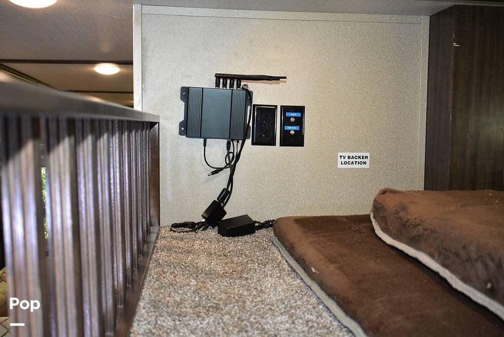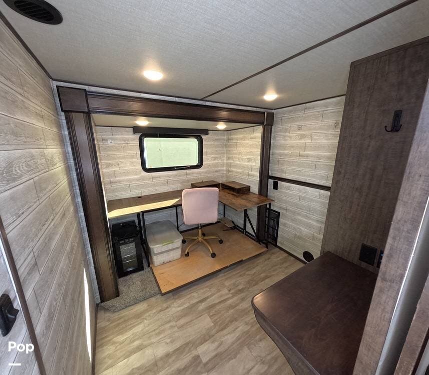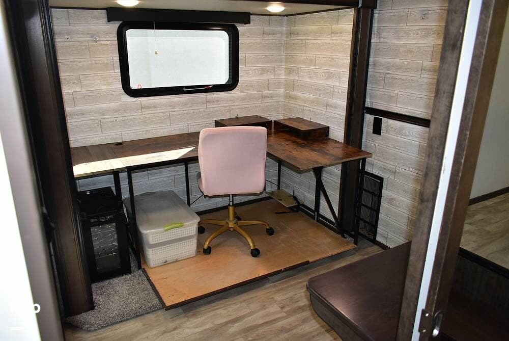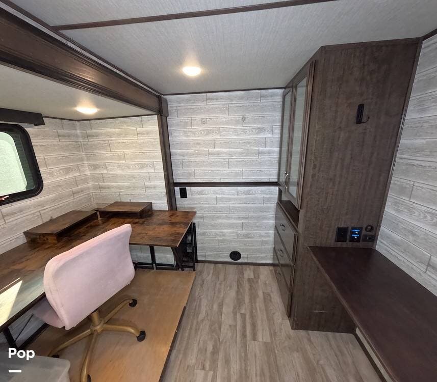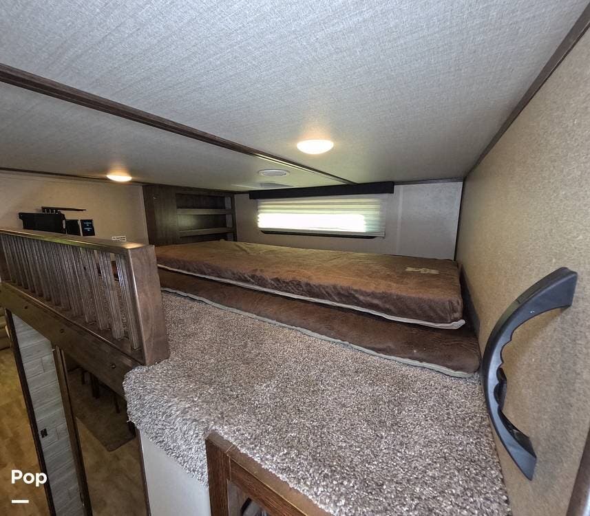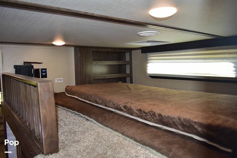 The floor plan is highlighted by a mid-bunk room that can be used as a private office or extra bedroom, plus a cozy loft above, ideal for kids or additional storage. With sleeping accommodations for up to eight, thanks to multiple convertible beds, this RV easily hosts friends and family for getaways or full-time living.