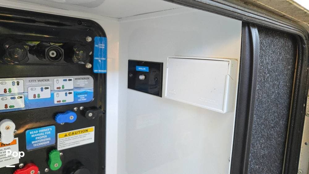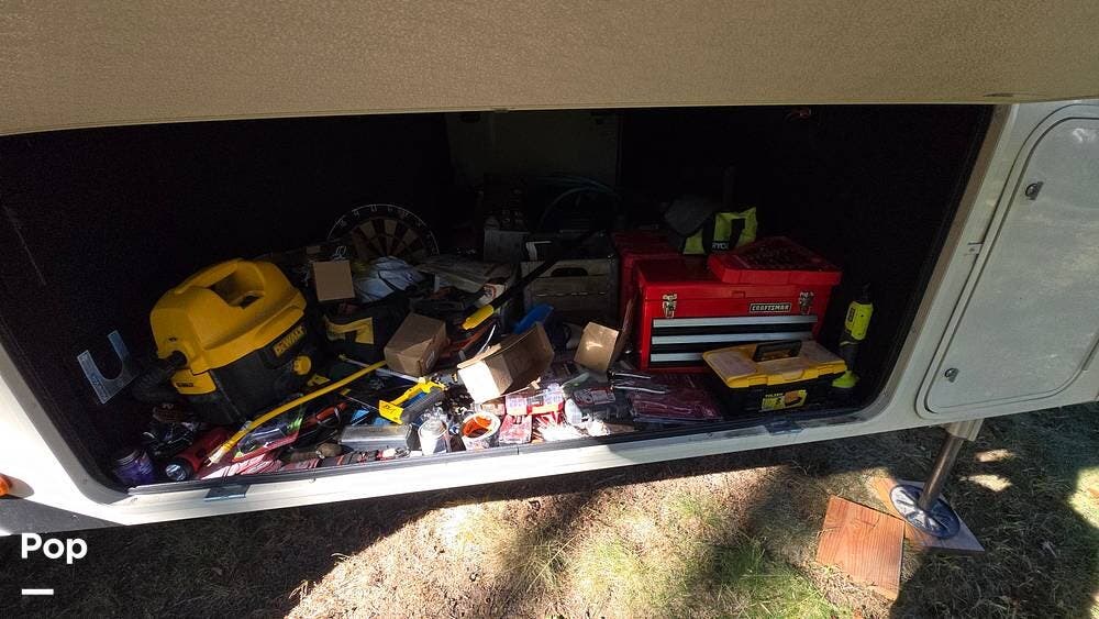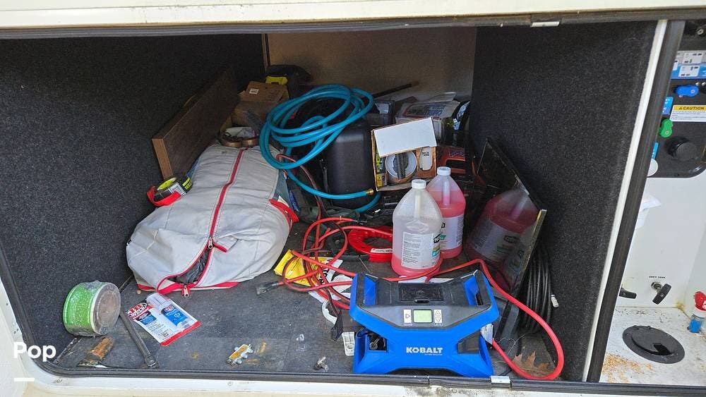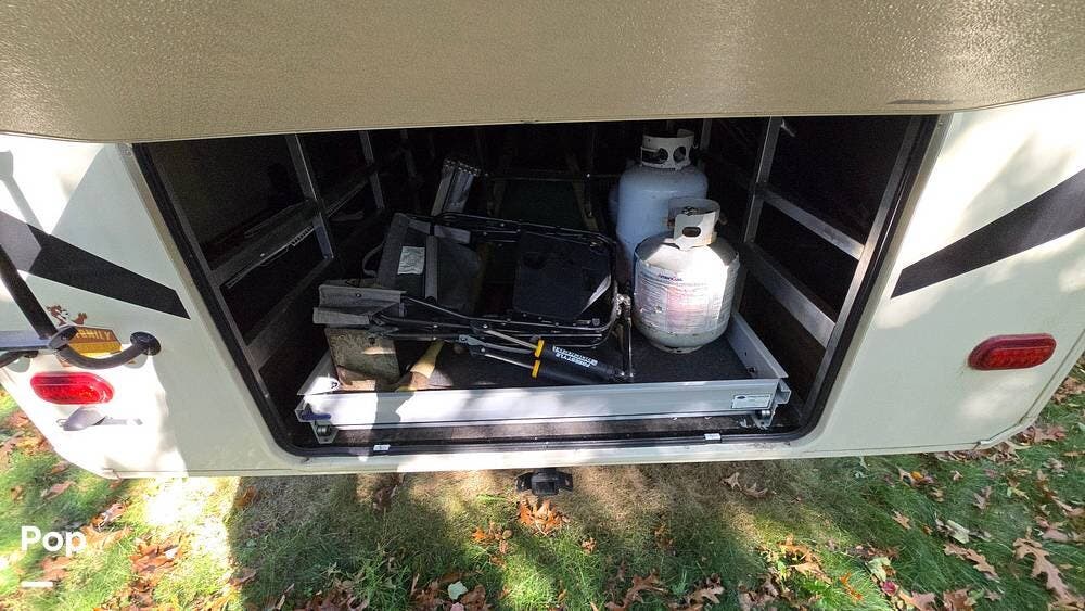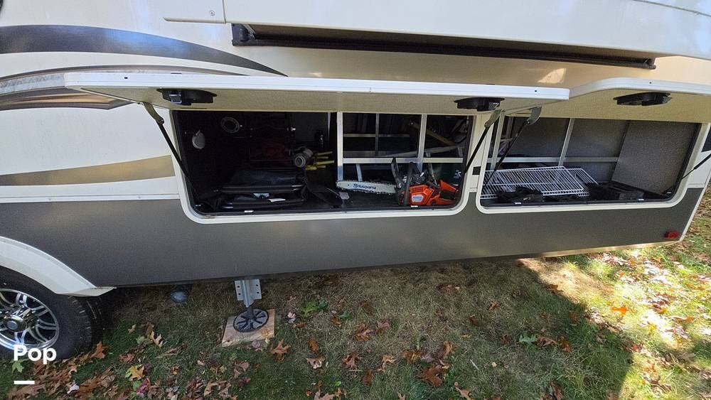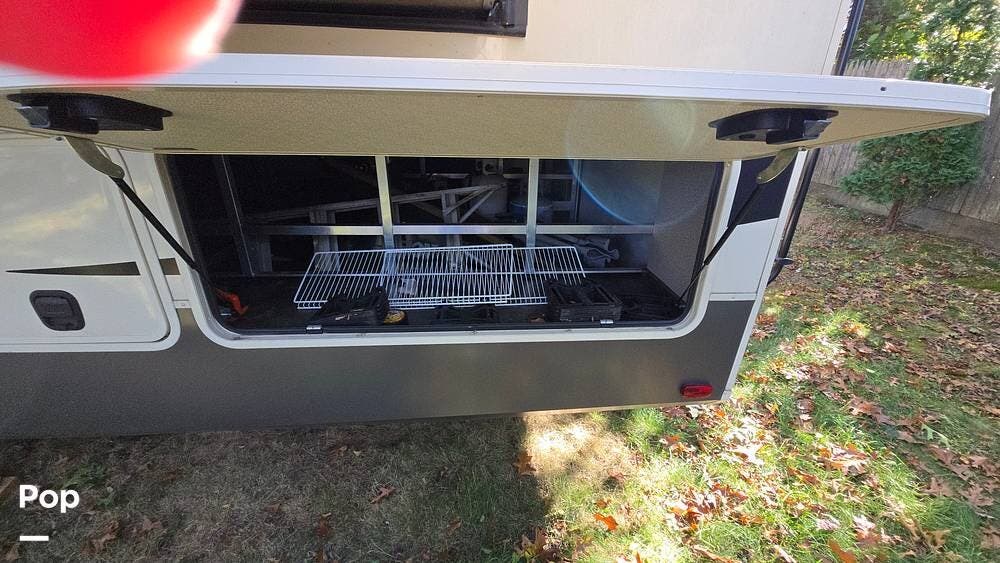 Outside, you'll appreciate features like the frameless tinted windows, heavy-duty suspension, and oversized outdoor storage compartments with a sliding tray for easy access to gear.