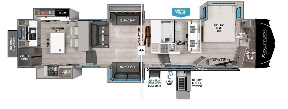 Step inside and you'll find five slide-outs that create a spacious, open floor plan that invites relaxation and communal living. With an interior that sleeps up to six people, the Solitude 390RK features a rear kitchen layout opposite the living area, making this one of the most thoughtful floorplans in its class.