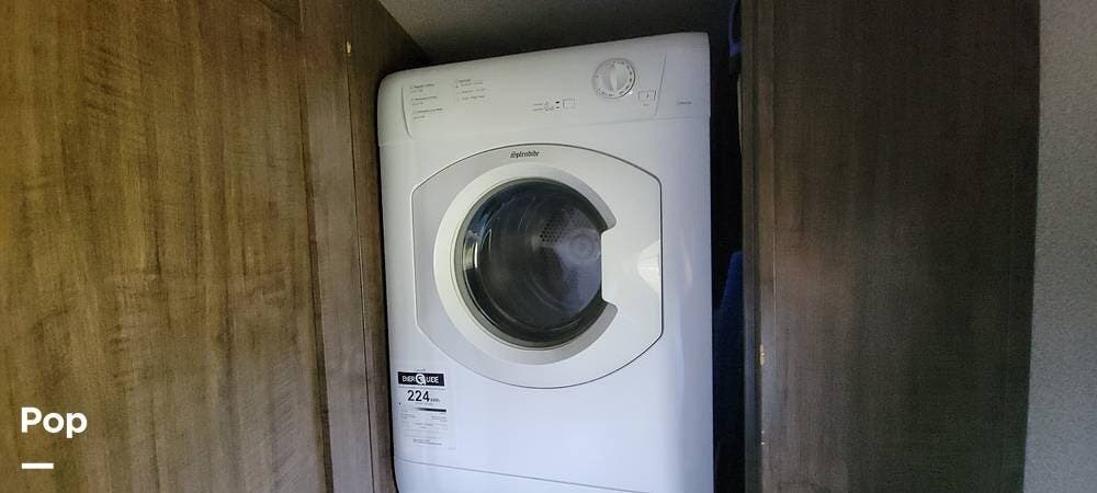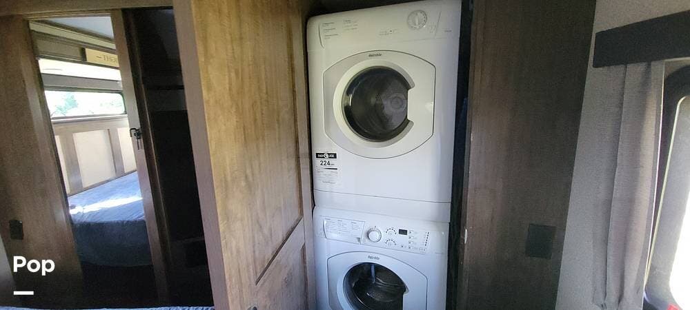 The same can be said for the bedroom. There's a lot of room thanks to the slide. Two closets, one with a Splendide washer and dryer, a dresser for even more storage, and another television.