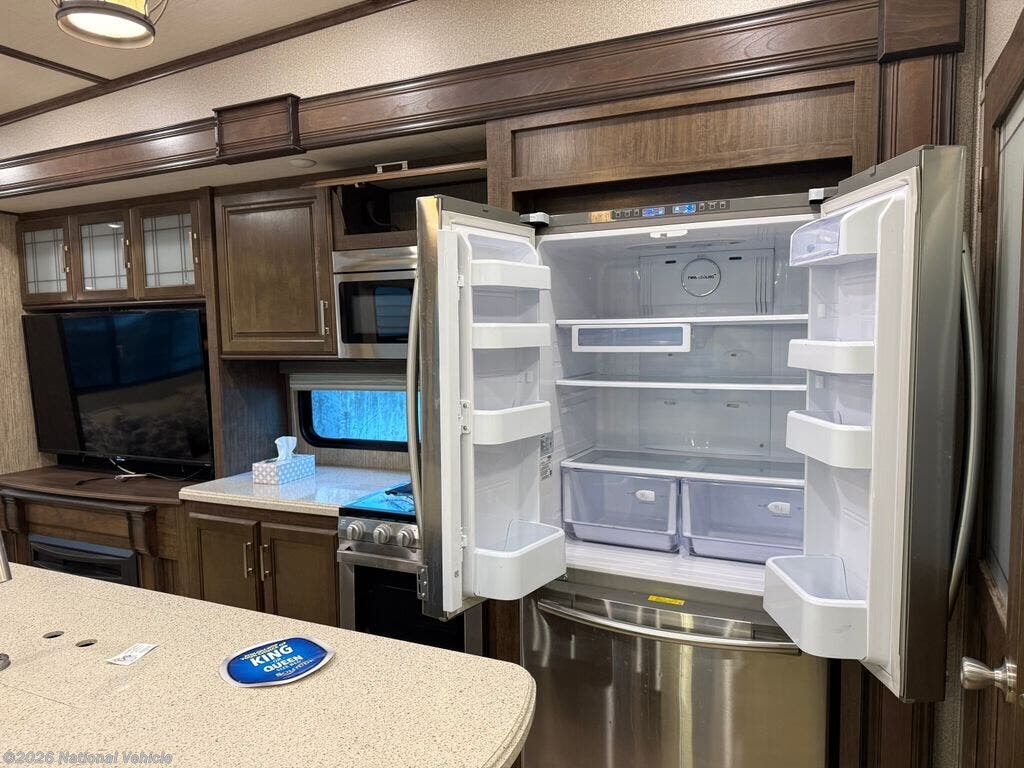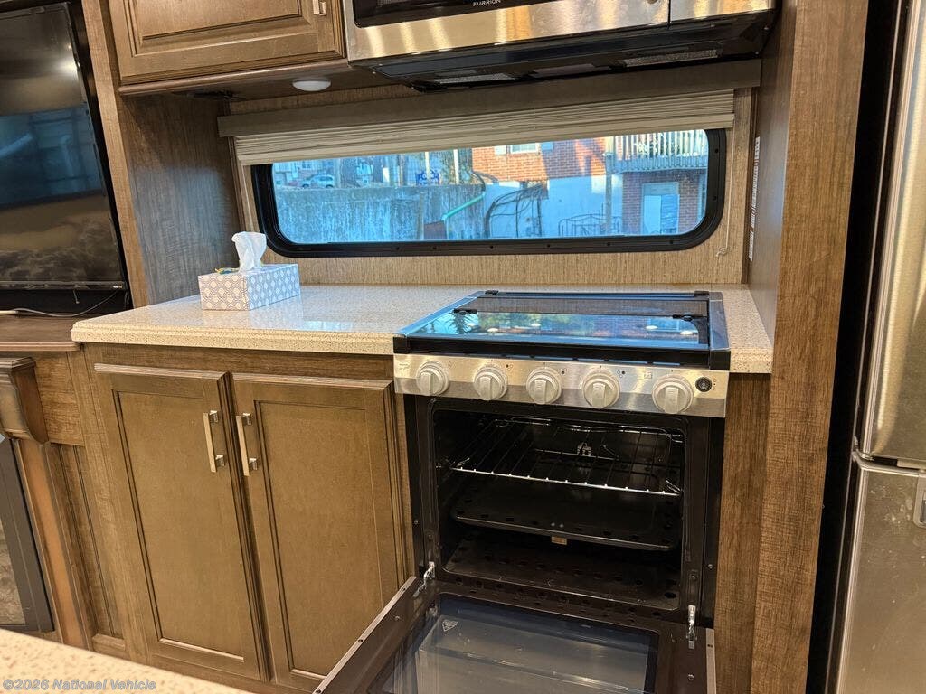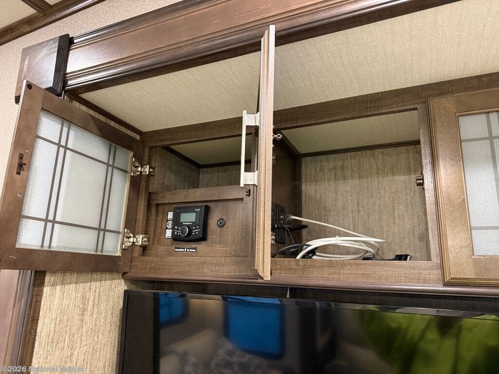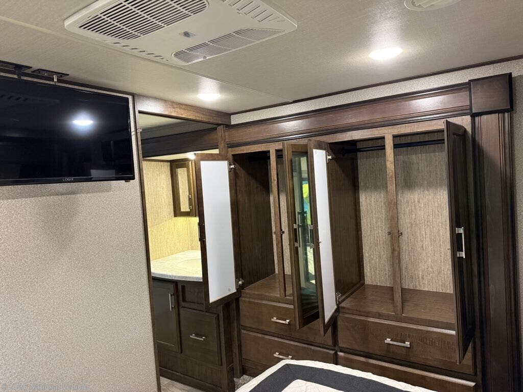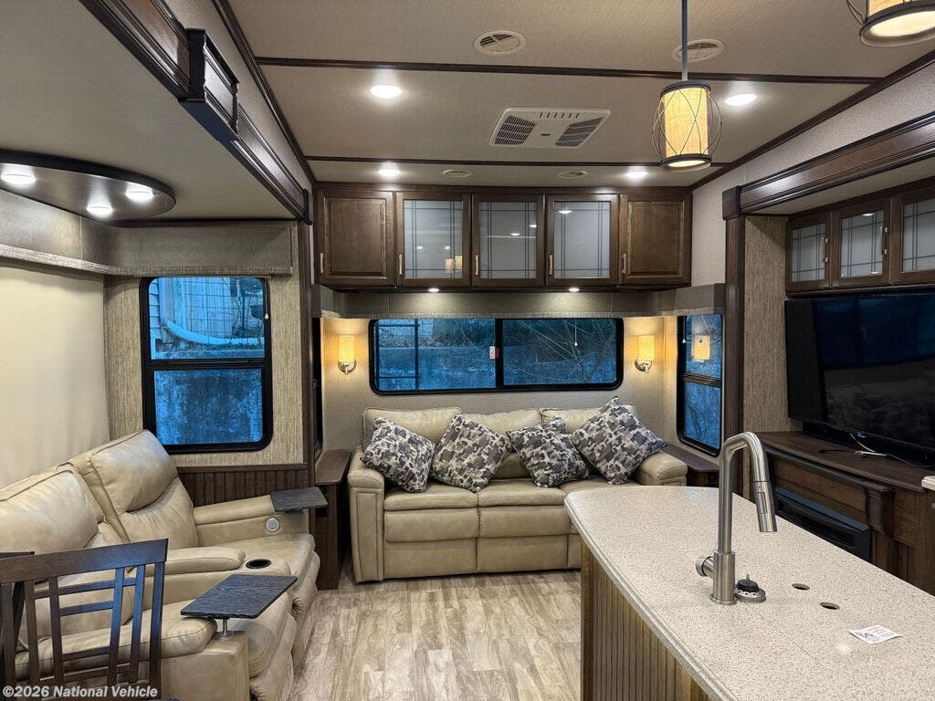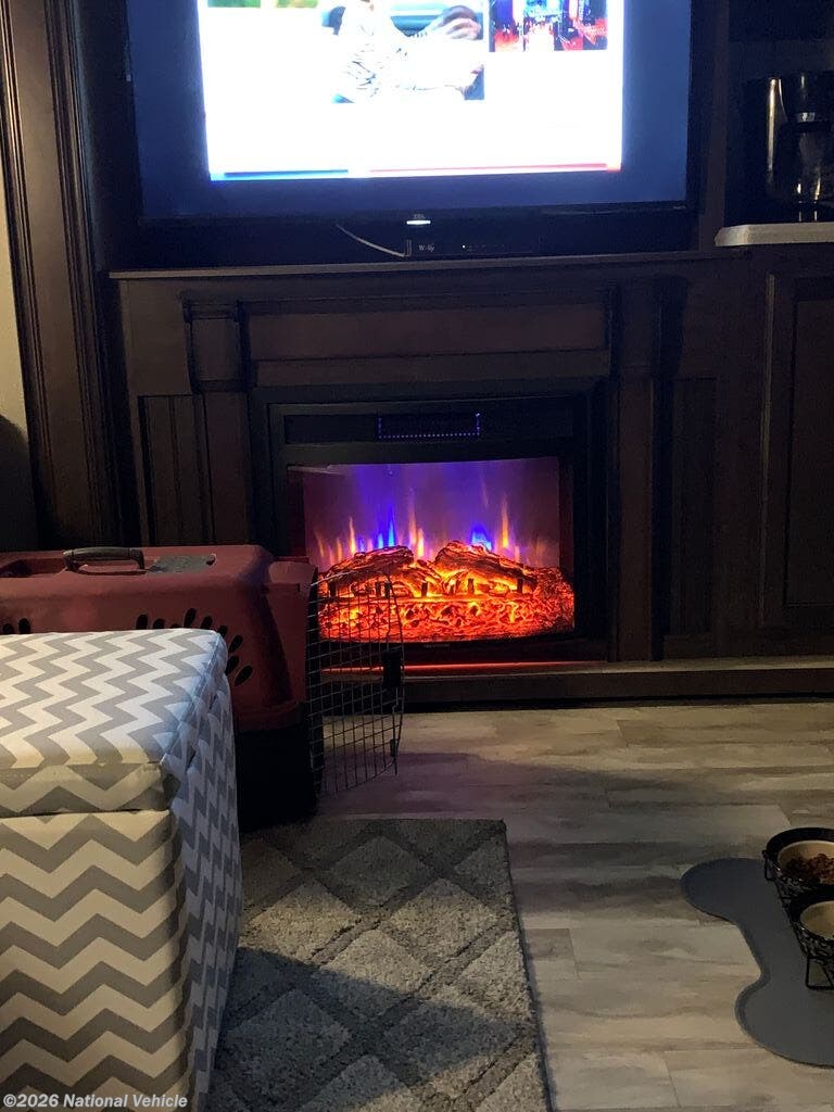 Inside, the S-Class Residential Living Package shines with premium furnishings, stylish roller shades, and a warm, upscale ambiance. The living area features a cozy fireplace and dual TVs, making it ideal for entertaining or unwinding after a day of adventure. The kitchen is beautifully appointed with a convection microwave oven, generous storage, and residential-style finishes.