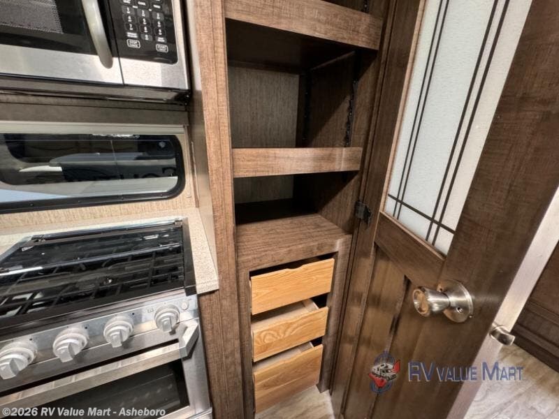 This Solitude S-Class fifth wheel will have you daydreaming about all the places you will visit, and maybe change you into a full-timer once you see all the amenities. Of course your sleeping accommodations are very important to you, the front master suite offers a queen bed or choose an optional king size if you prefer. And your spouse will surely love having their own sink in the bathroom, and plenty of clothing storage in the bedroom. The cook will enjoy using the professional grade stainless steel cooktop and convection microwave, the oversized pantry, the hutch, the stainless steel 12 cu. ft. four door refrigerator, plus the kitchen island. Everyone can relax in the rear living area on the tri-fold sofa or on the theatre seats for a massage. There are many more features to enjoy such as the fireplace, and options to add like a washer and dryer and/or a residential refrigerator. Start your plans now!