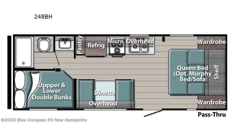 This travel trailer with double bunk beds will be the perfect family travel trailer since it can sleep seven people each night. Mom and dad will appreciate the queen bed up front with dual wardrobes for their things. If you're needing more seating space, you can choose the optional Murphy bed and sofa in place of the queen bed. The kitchen includes a three burner gas range, a microwave oven, plus a pantry for snacks.