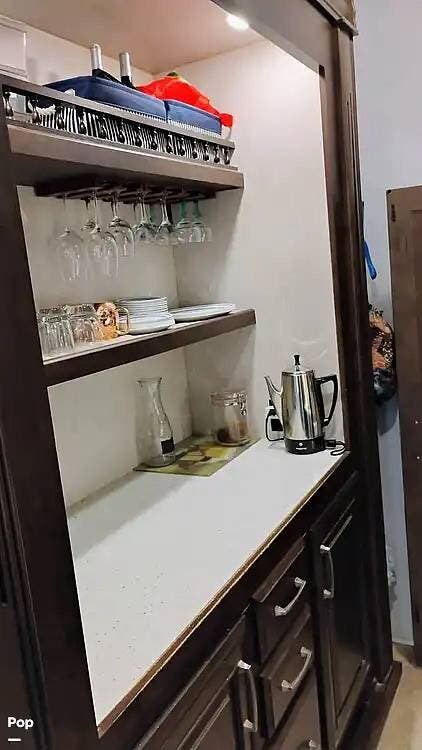 There is also a massive storage cabinet with extra counter space for a coffee or beverage bar.