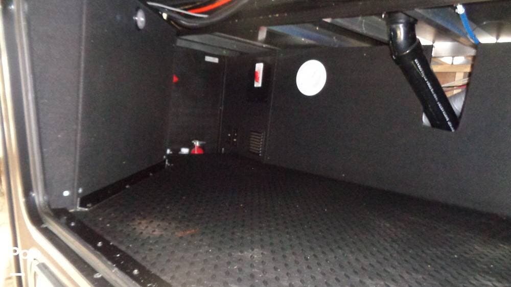 The main cabin features a dinette table with a bench, pull-out stools at the kitchen bar, a fireplace, a TV and stereo system with indoor/outdoor speakers, surround sound, a CD/DVD player, and ample overhead storage. The original couch has been removed and can be set up with recliners, a sofa bed, or other desired features.