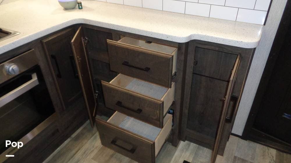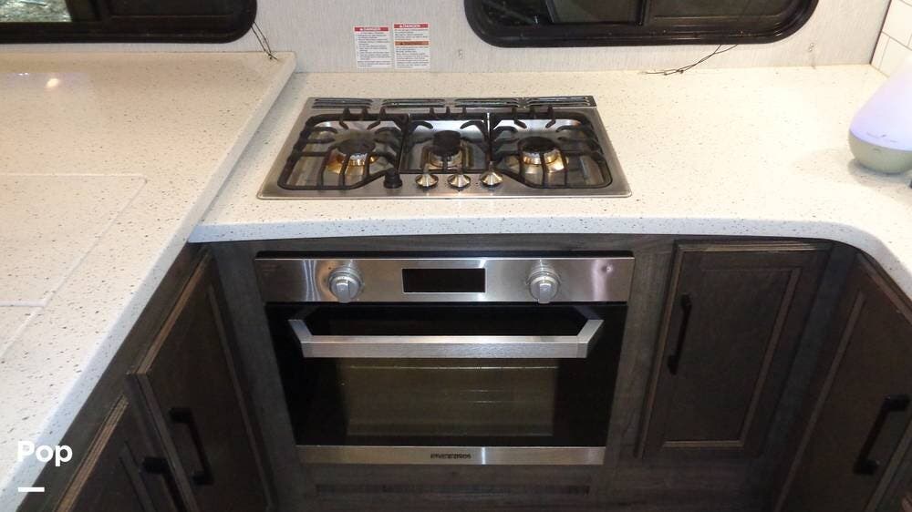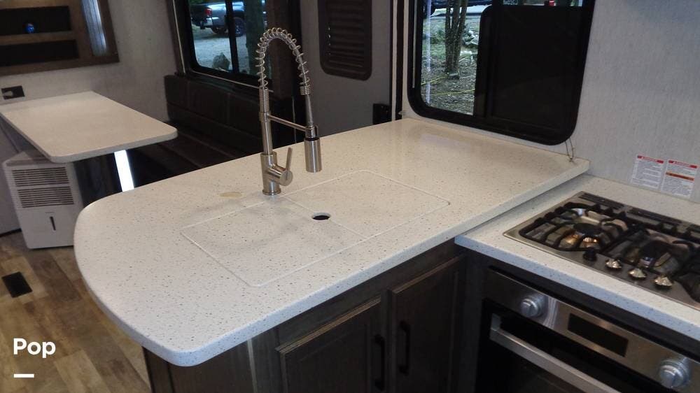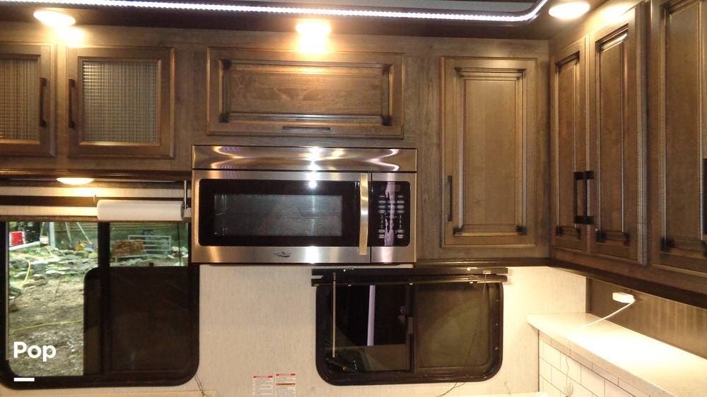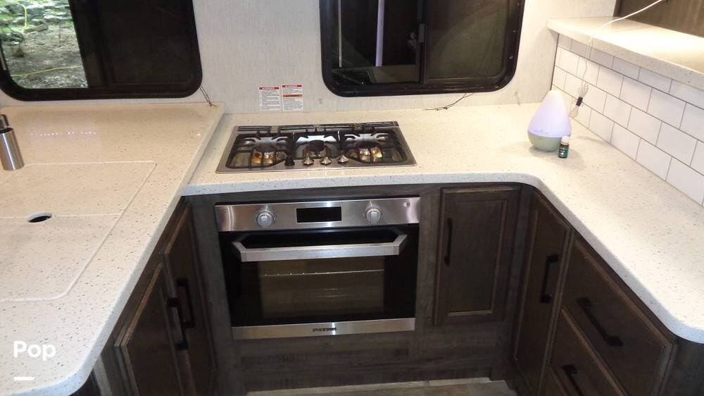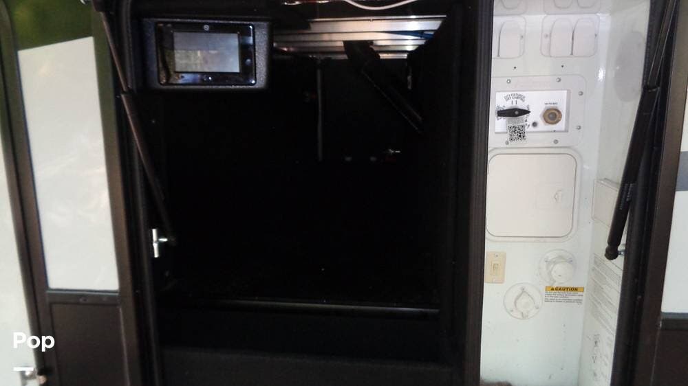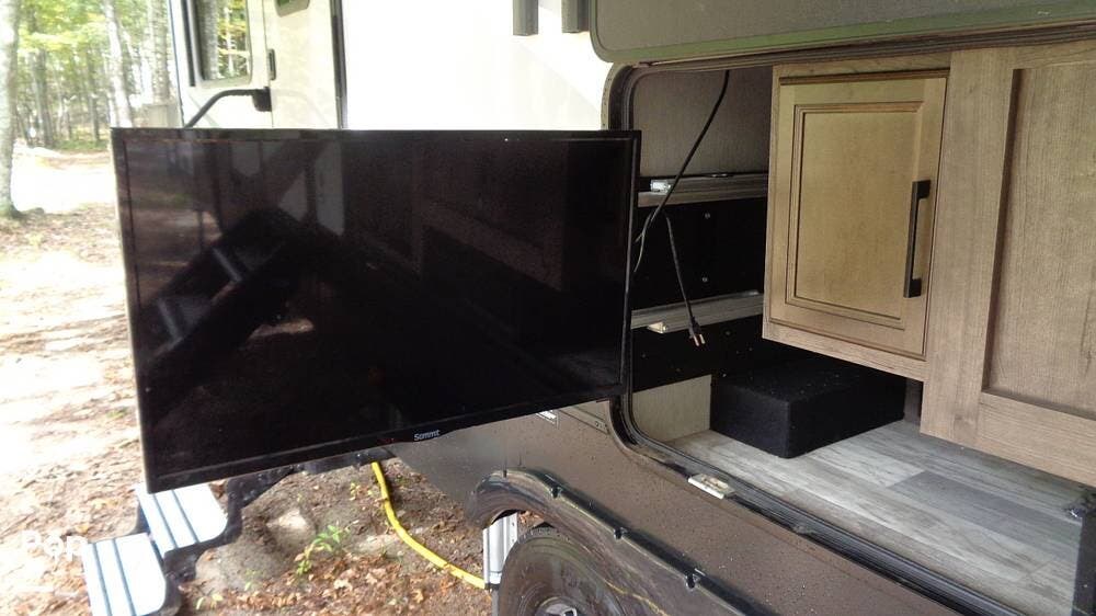 The features continue to the exterior, where an outdoor kitchen is equipped with a mini fridge, a two-burner stove, storage, and a slide-out flat-screen TV. With 3 exterior awnings, there are multiple options for folks to enjoy the outdoors. The RV is also equipped with a 5500-watt Onan generator to keep the fun going, however far off the grid you might wander.