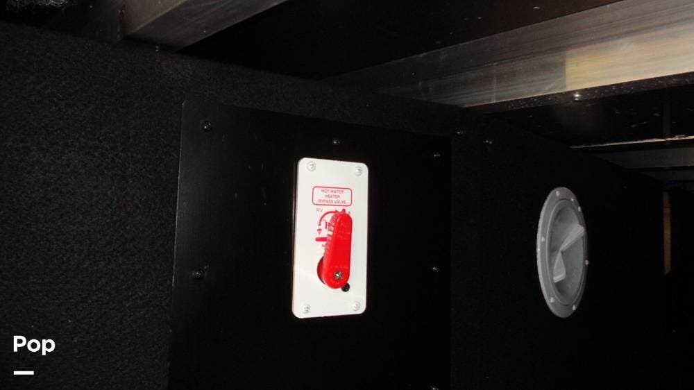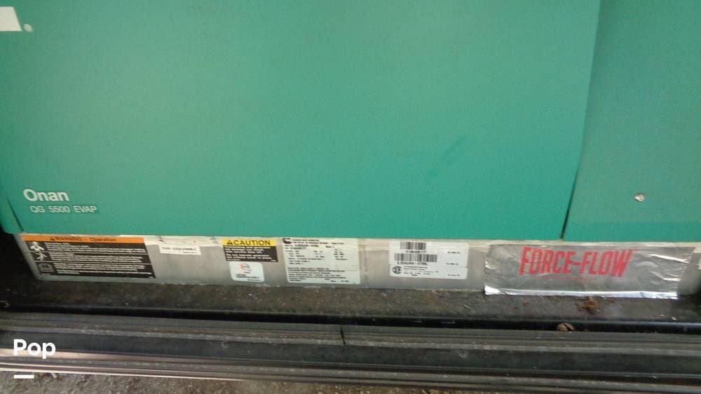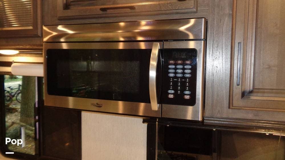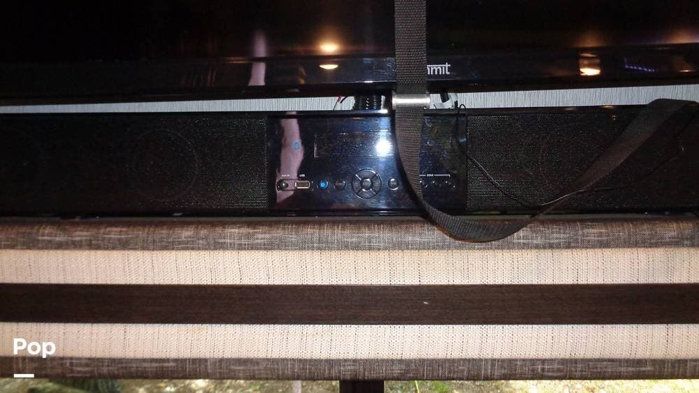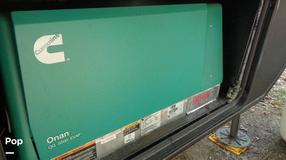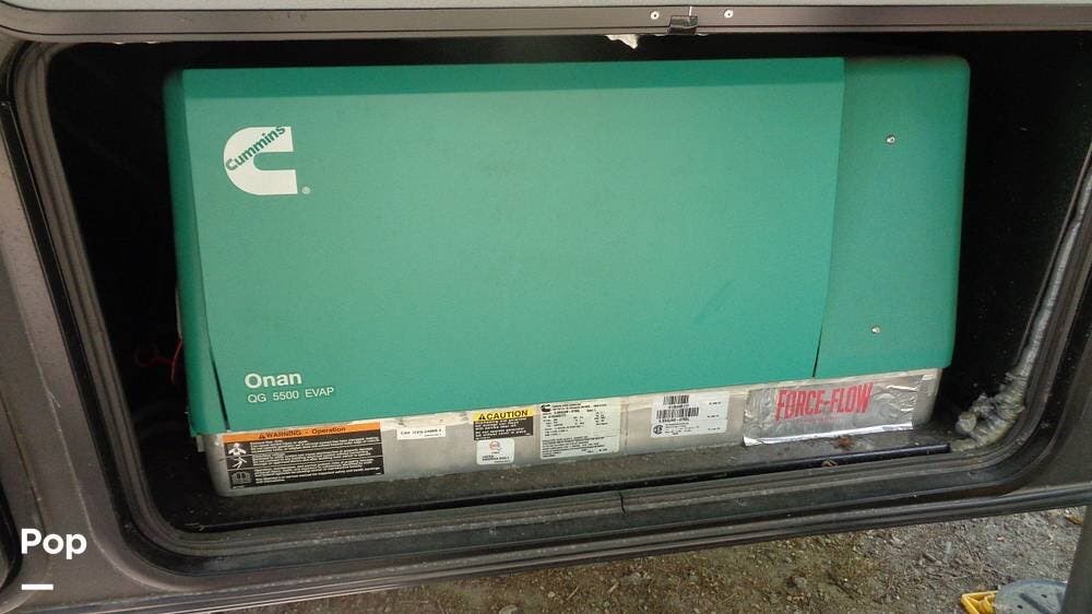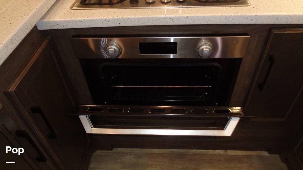 The features continue to the exterior, where an outdoor kitchen is equipped with a mini fridge, a two-burner stove, storage, and a slide-out flat-screen TV. With 3 exterior awnings, there are multiple options for folks to enjoy the outdoors. The RV is also equipped with a 5500-watt Onan generator to keep the fun going, however far off the grid you might wander.
