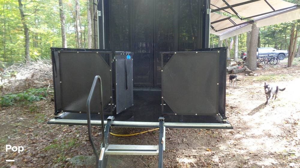 The 13' multi-purpose garage with a half bath and TV, a drop-down queen bed, and a split bench seat/bed with a dinette table. There is also a separate entrance and a loft for additional sleeping or storage. This area has AC, plenty of windows for natural light, and sliders opening to the ramp/deck platform.