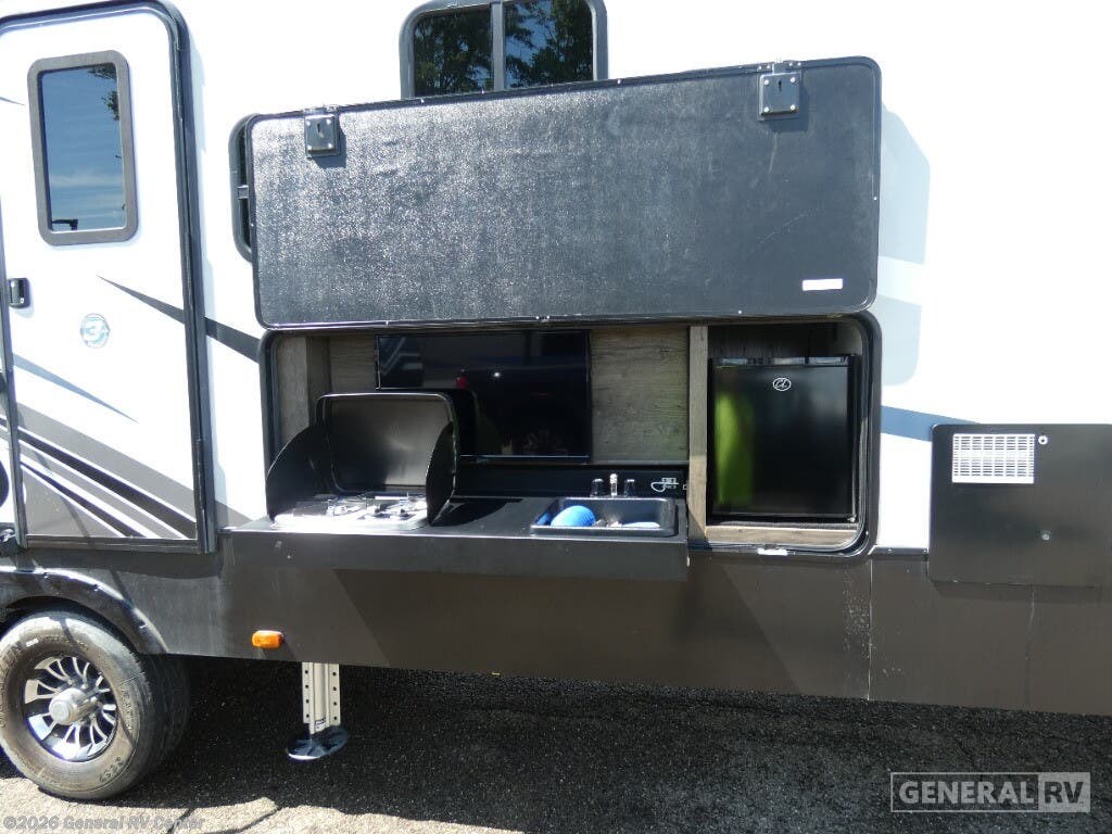Discover the 2020 Heartland Cyclone CY 4007, a stunning blend of luxury and functionality designed to elevate your RV adventures. This spacious toy hauler offers a remarkable 13-foot garage, perfect for bringing along your favorite outdoor toys. With its ability to sleep up to nine people comfortably, thanks to a king bed, queen bed, and convertible sleeping options, it's perfect for family trips or a getaway with friends. The interior is thoughtfully laid out with a center kitchen and living area, ensuring a seamless flow throughout the space. The kitchen is equipped with a full-size refrigerator and a three-burner cooktop, making meal preparation a breeze. The Cyclone CY 4007 doesn't just excel indoors; it extends its charm outdoors with a 19-foot powered retractable awning and a convenient outside kitchen, perfect for those warm, sunny days. The front bedroom offers a cozy king bed, complete with a fireplace for those chilly nights. An automatic heater ensures comfort throughout your journey, while the ample water capacities mean longer stays without the need for frequent refills. With a robust GVWR of 20,000 lbs and a cargo capacity of over 3,300 lbs, this RV is ready for any adventure you throw its way. To explore this remarkable RV further, visit your nearest General RV dealership location.