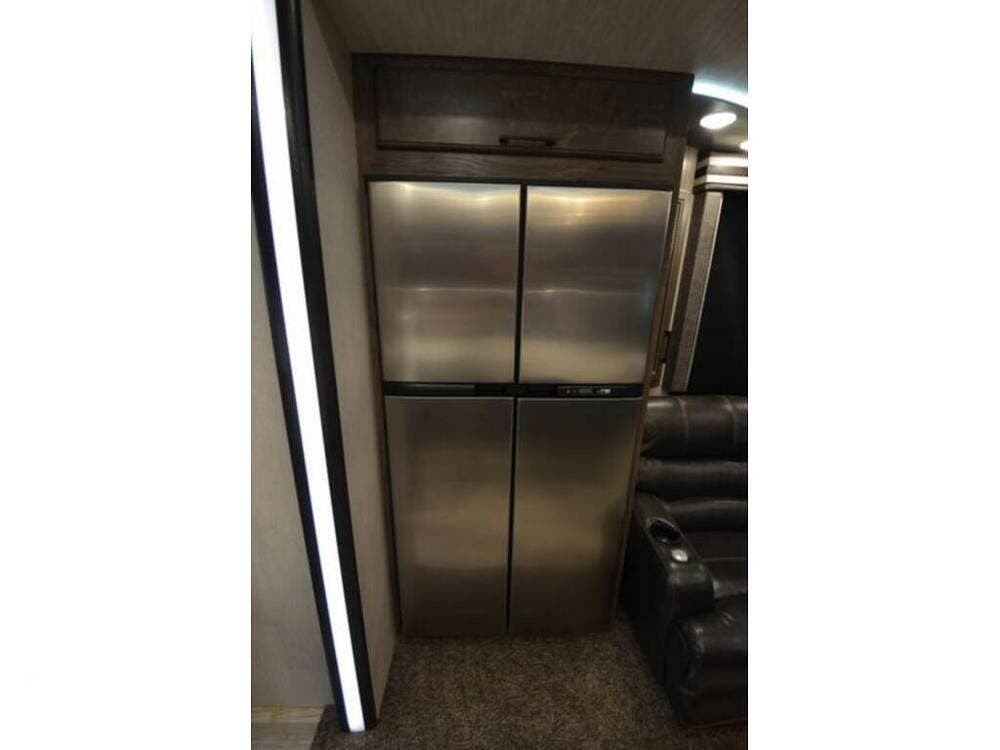 It also has a 20-gallon auxiliary fuel tank, a central vacuum, three awnings, four TVs (one outside), an outside fridge, washer/dryer prep, a fireplace, two skylights, hydraulic jacks, and much more.