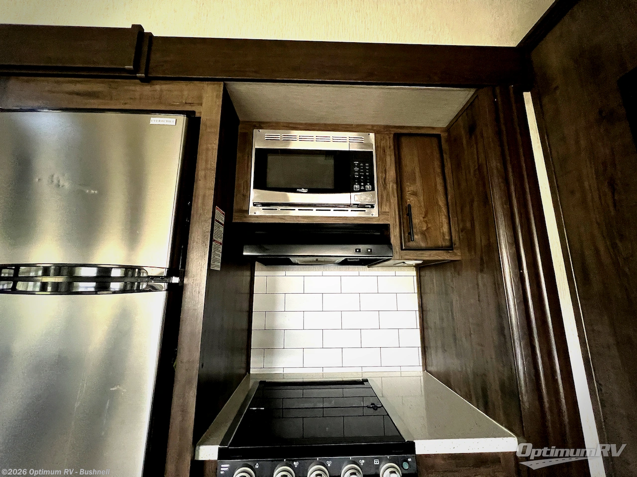 Imagine the kids laughing and visiting about their day as they sleep in the middle bunkhouse which also includes a half bath and storage for their things in this Milestone fifth wheel. If they invited their friends, the loft offers more sleeping space. You will have your own master suite with a walk-around bed and a wardrobe slide out that extends into the dual-entry bathroom. The rear living area provides a sofa and theater seating to relax on, and you will find all the kitchen appliances you will need including a residential refrigerator to store lots of cold food for everyone. The kitchen peninsula countertop is a great place to prepare and serve meals, and the large pantry will hold lots of ingredients and snacks.