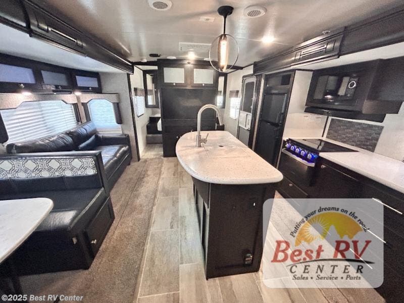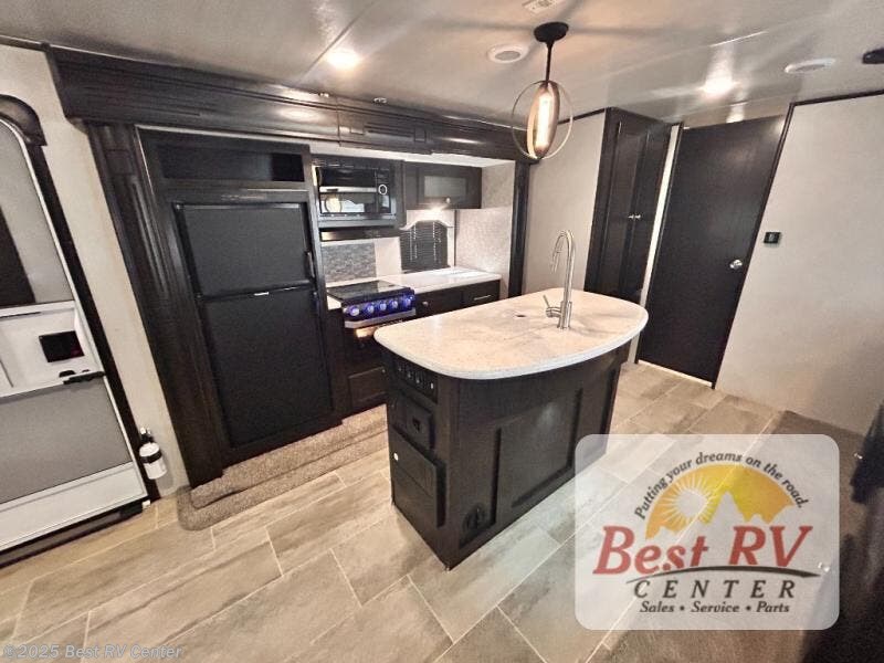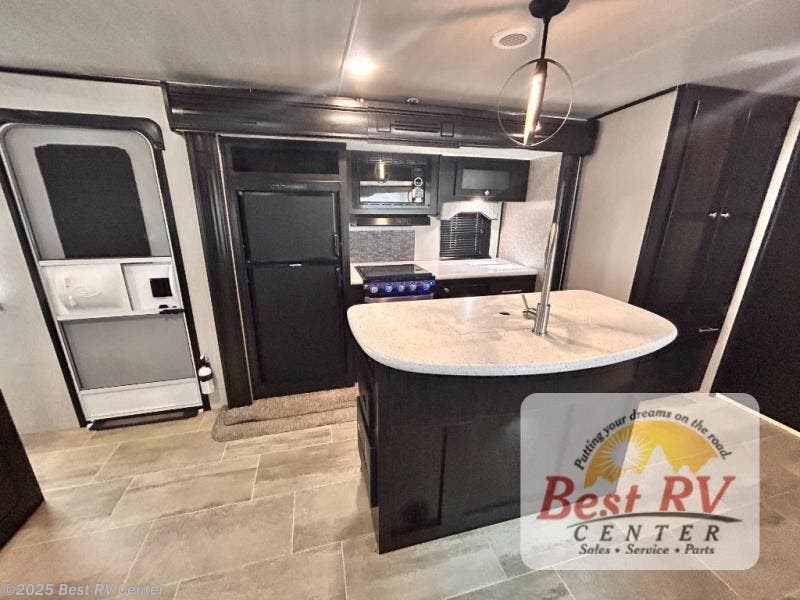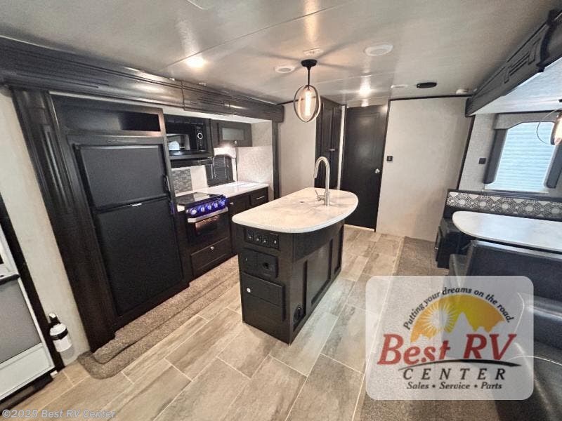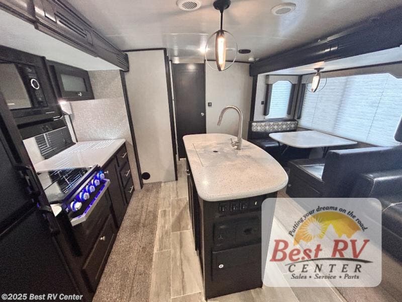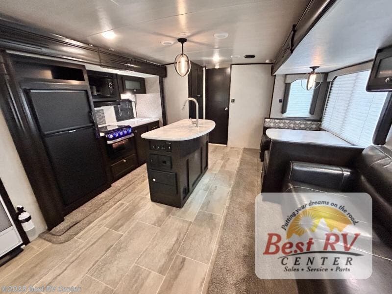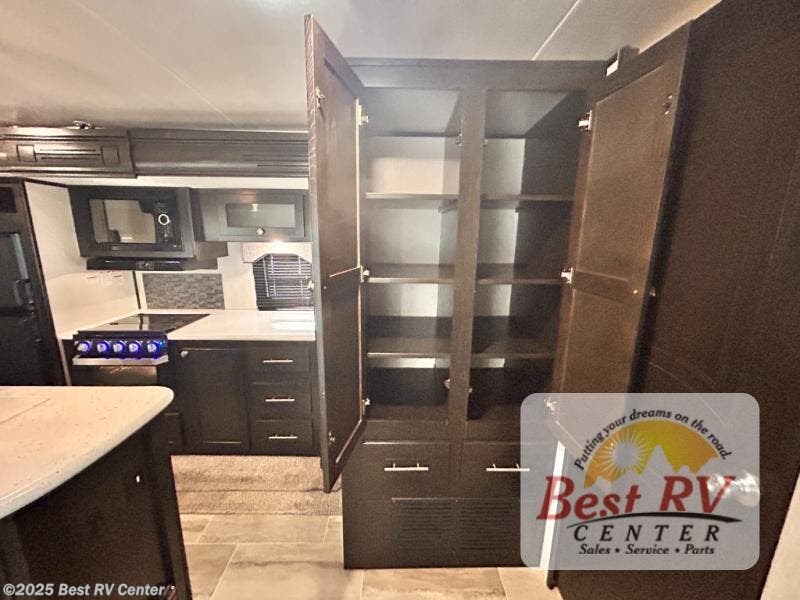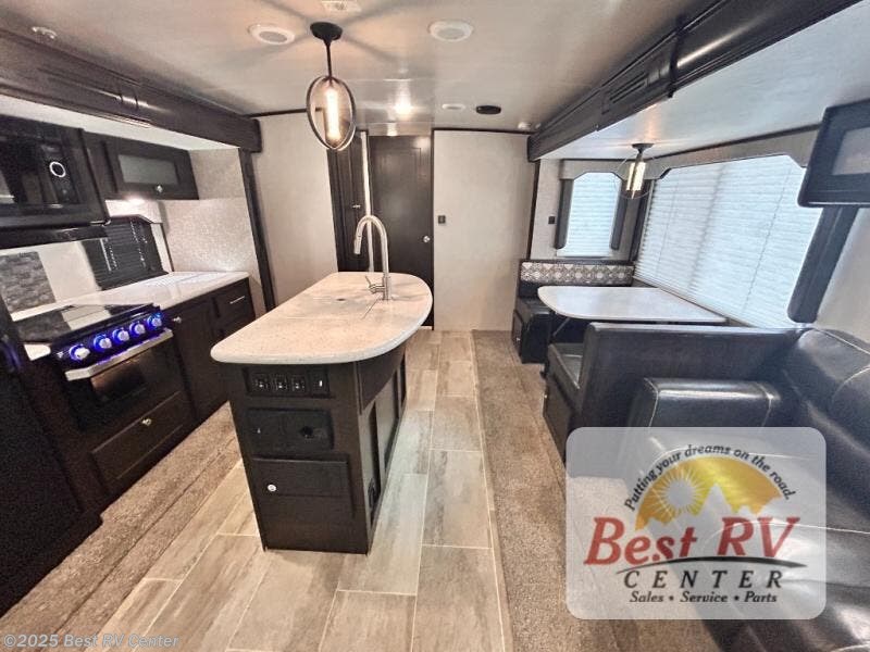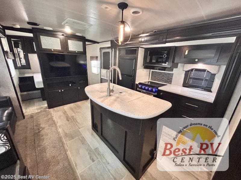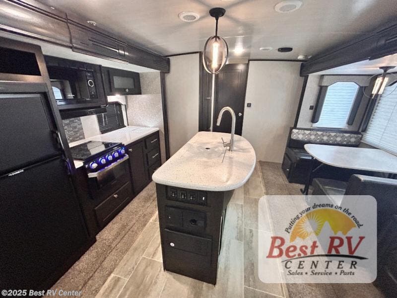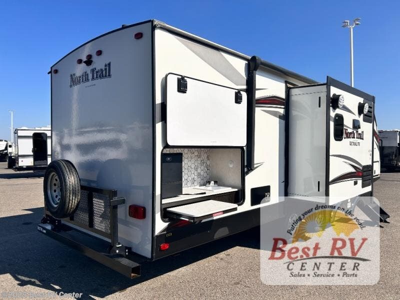 This North Trail travel trailer by Heartland RV has everything you need to enjoy your time away from home. There are two slides in the main living area for the maximum amount of floor space. The island with a double sink is also a nice area to prepare meals or clean up after dinner. In the front bedroom there is a queen bed plus extra storage space with the overhead cabinet and wardrobes. If you choose to add the optional TV, then you can enjoy watching a little TV in bed thanks to the swivel entertainment center. When the weather is nice, prepare your meals outside since there is an outside kitchen with a bumper-mount grill!