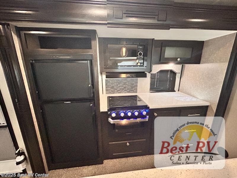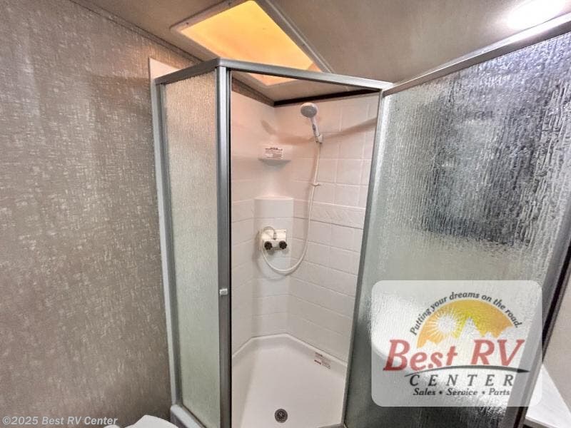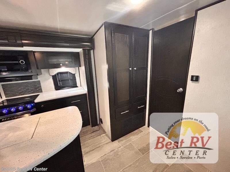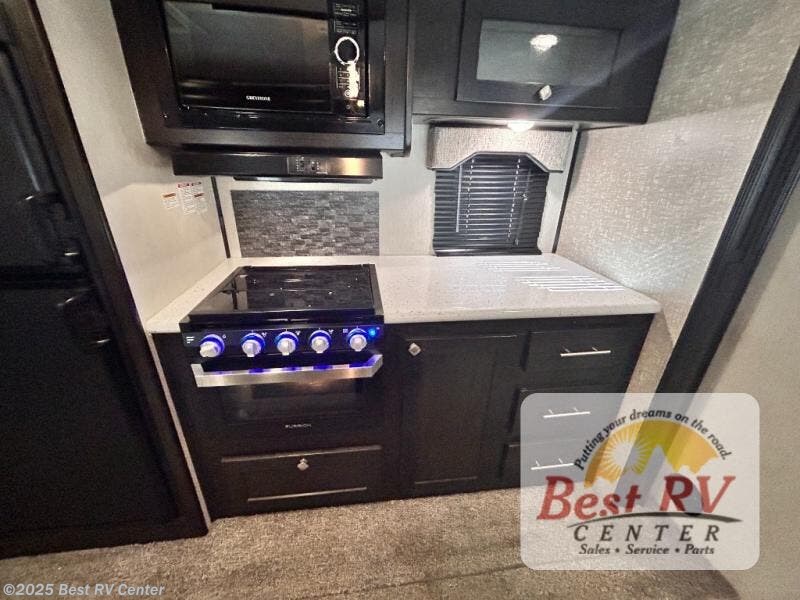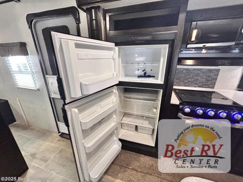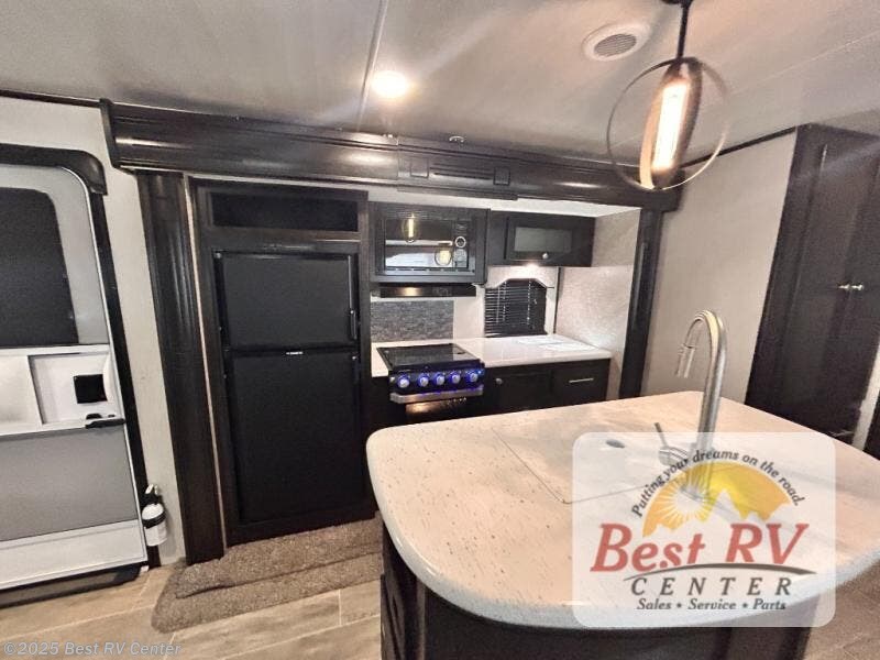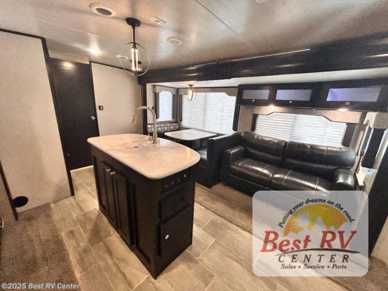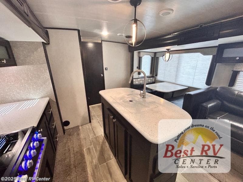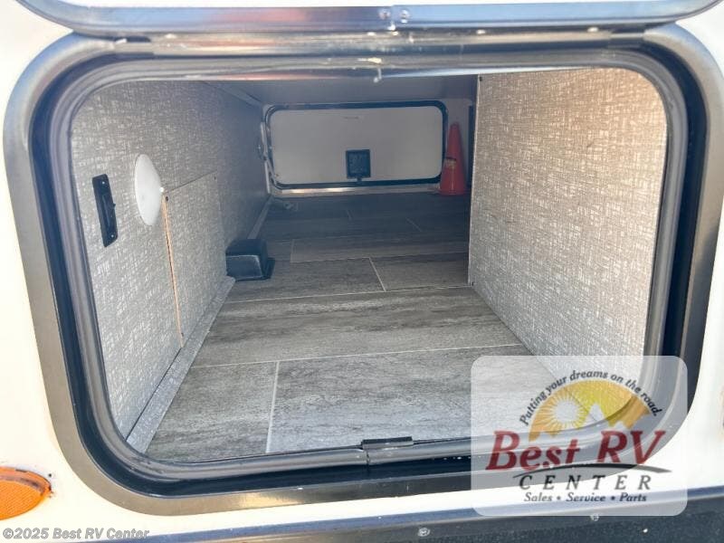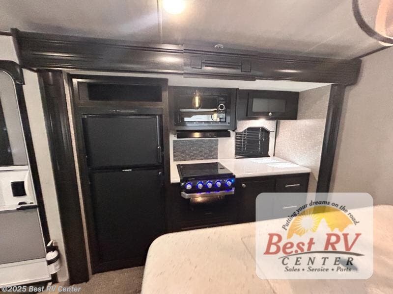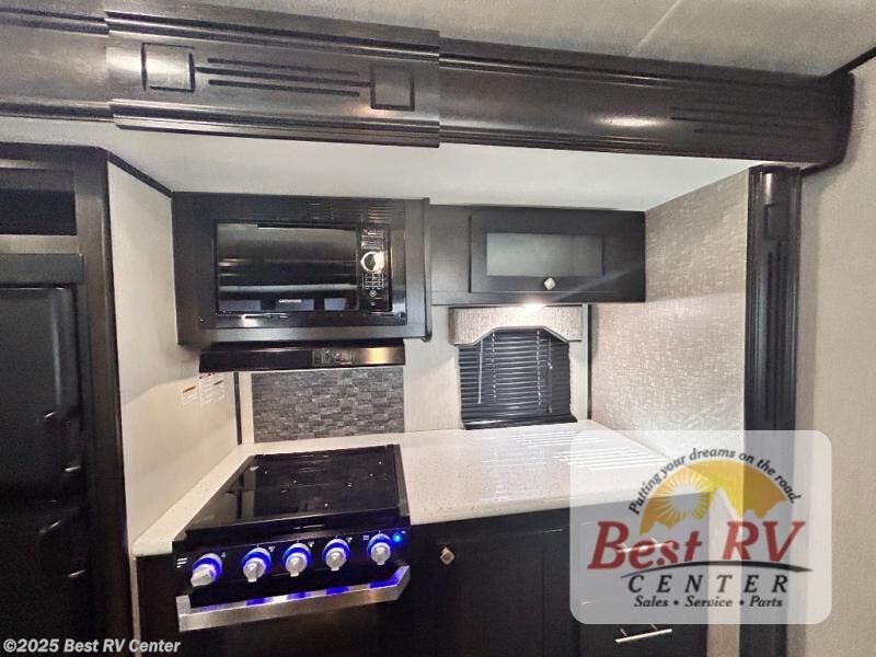 This North Trail travel trailer by Heartland RV has everything you need to enjoy your time away from home. There are two slides in the main living area for the maximum amount of floor space. The island with a double sink is also a nice area to prepare meals or clean up after dinner. In the front bedroom there is a queen bed plus extra storage space with the overhead cabinet and wardrobes. If you choose to add the optional TV, then you can enjoy watching a little TV in bed thanks to the swivel entertainment center. When the weather is nice, prepare your meals outside since there is an outside kitchen with a bumper-mount grill!