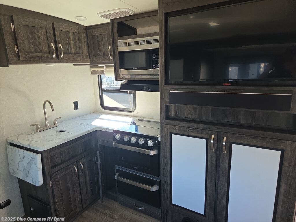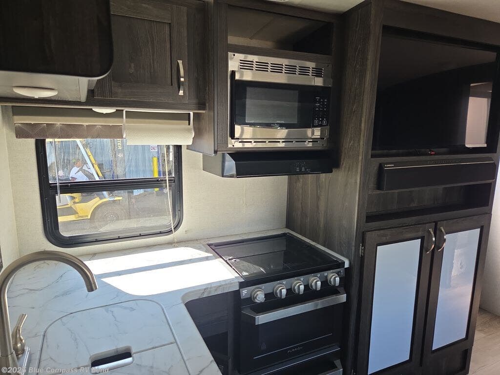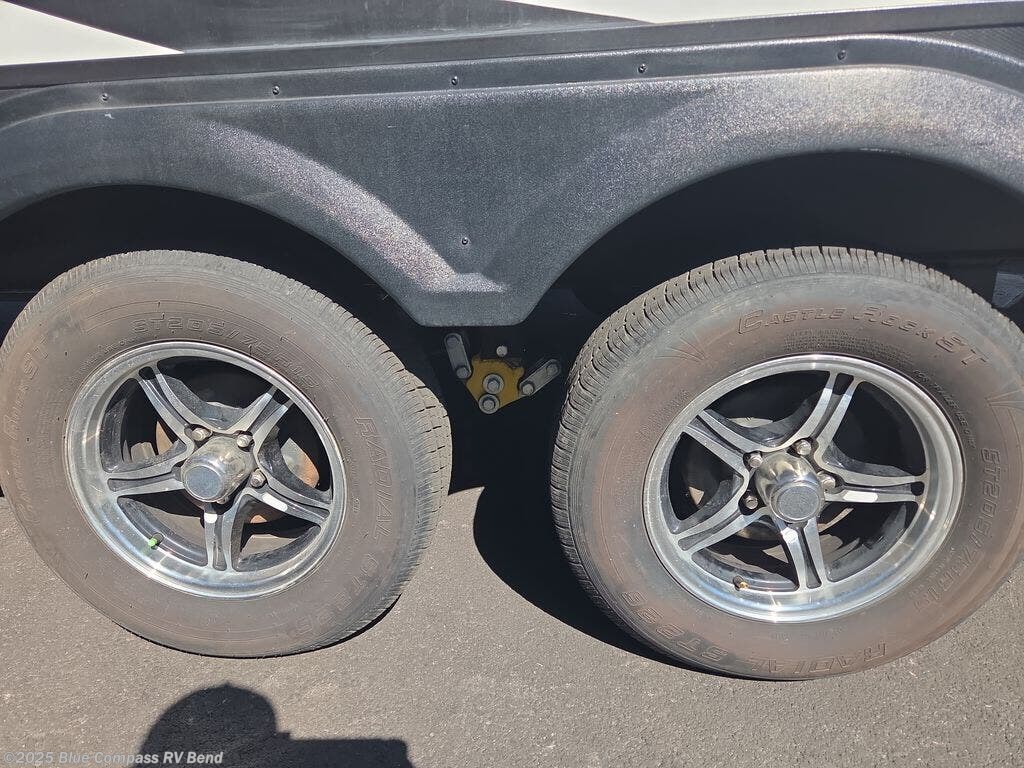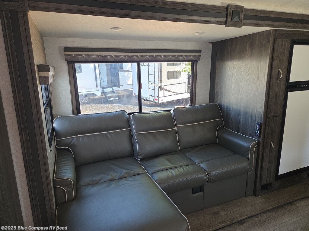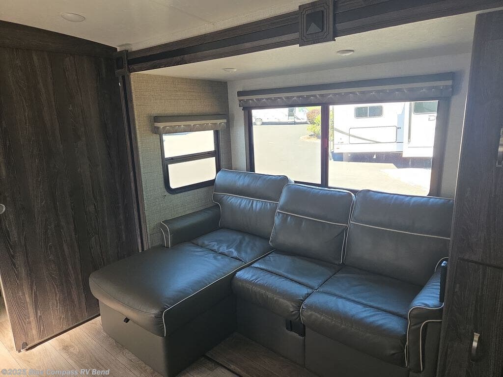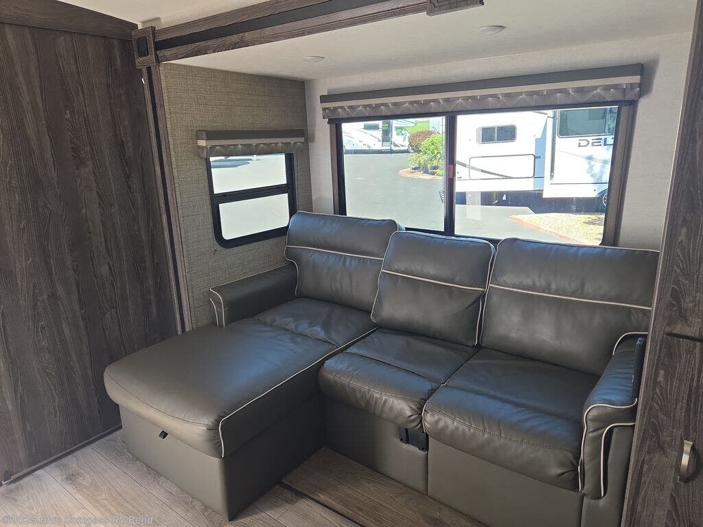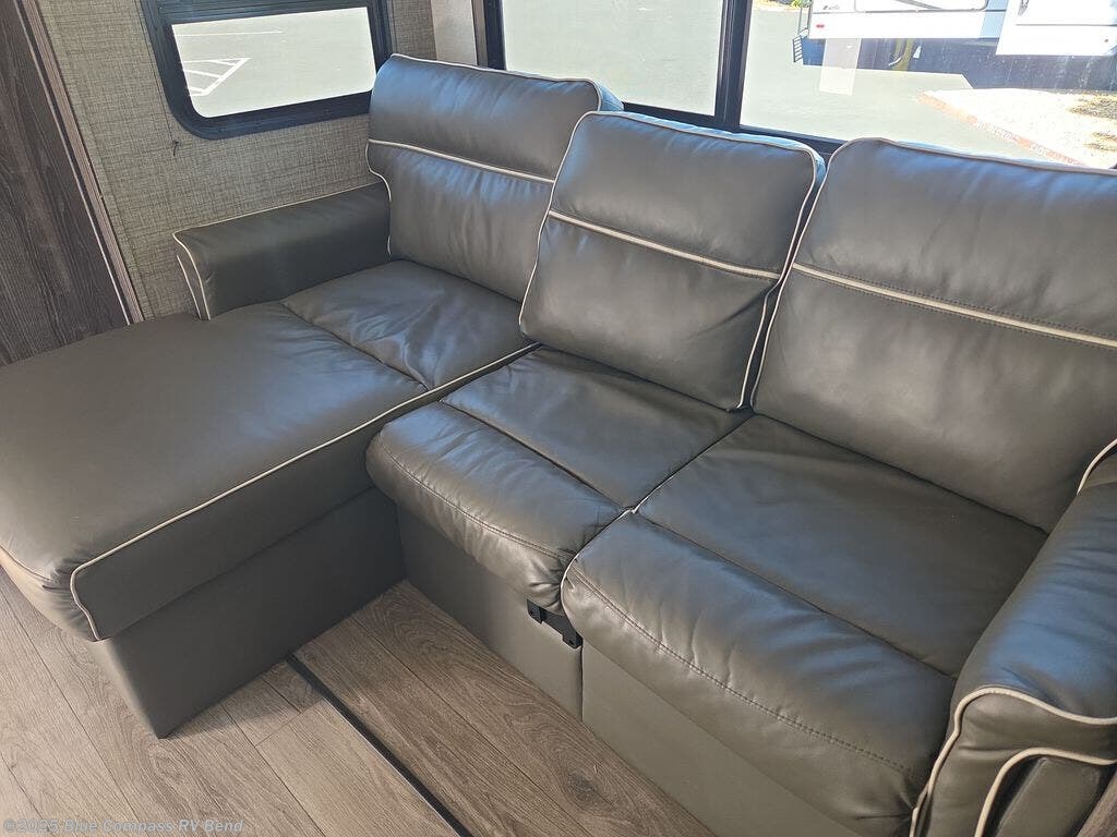 After a fun day outdoors playing horseshoes, walking around the campgrounds or relaxing under the power awning, you can head inside to the main living area to watch the 39" LED TV, or play a card game at the dinette table while relaxing on the chaise lounge. The cook will surely enjoy using the stainless steel appliances to make meals, and the rear full bathroom allows you to stay clean wherever you go plus includes wardrobe/linen storage. Inside you will also find two pantries, a front bedroom with a queen bed and plenty of clothing storage, plus a pet kennel under the bed.