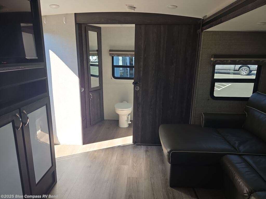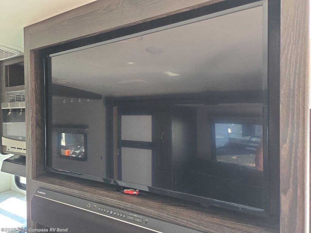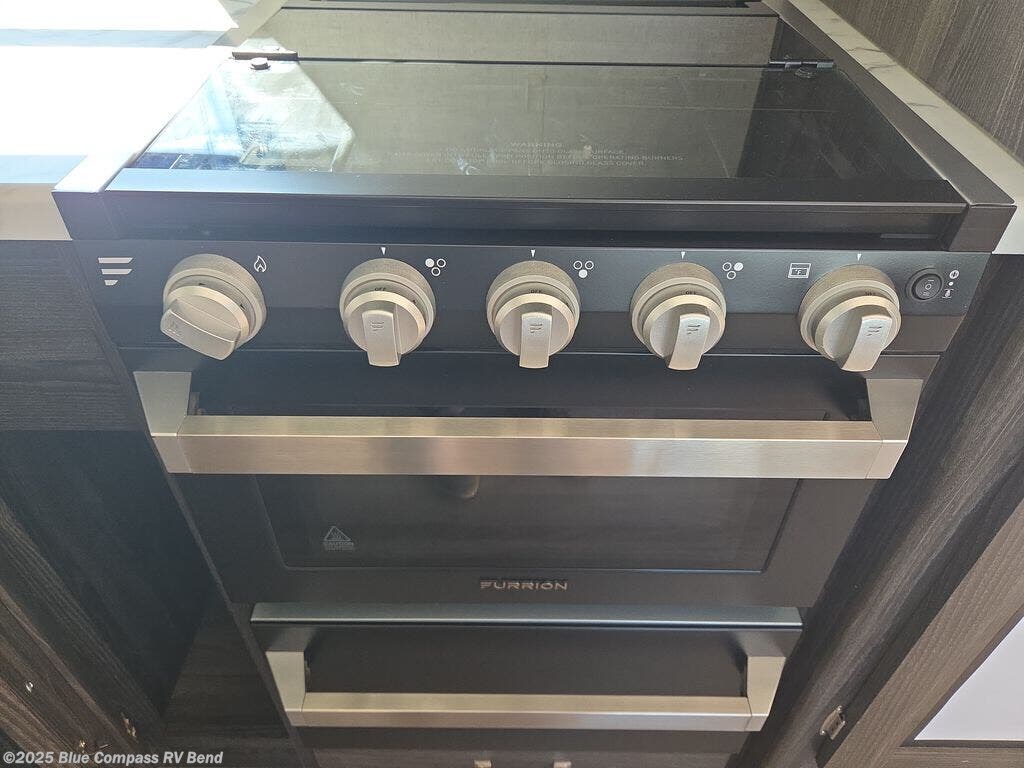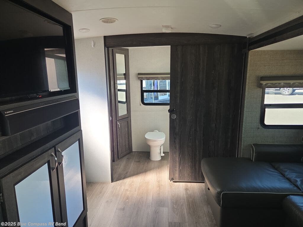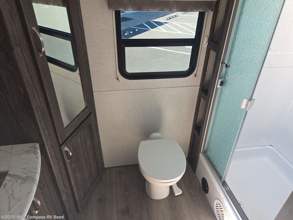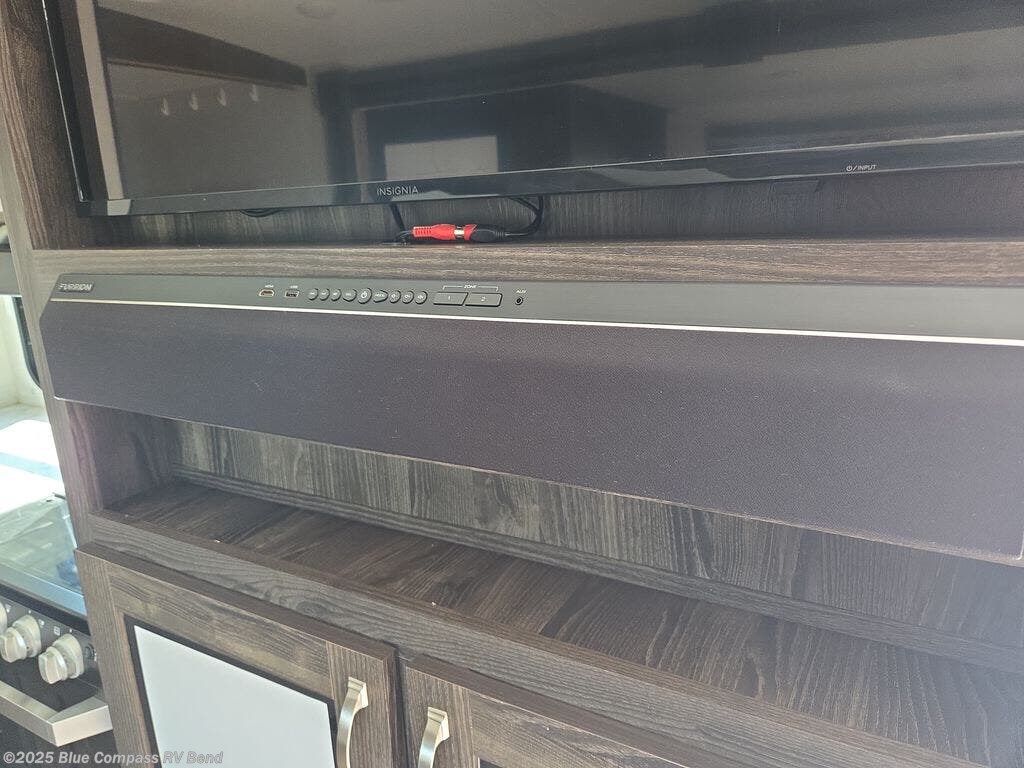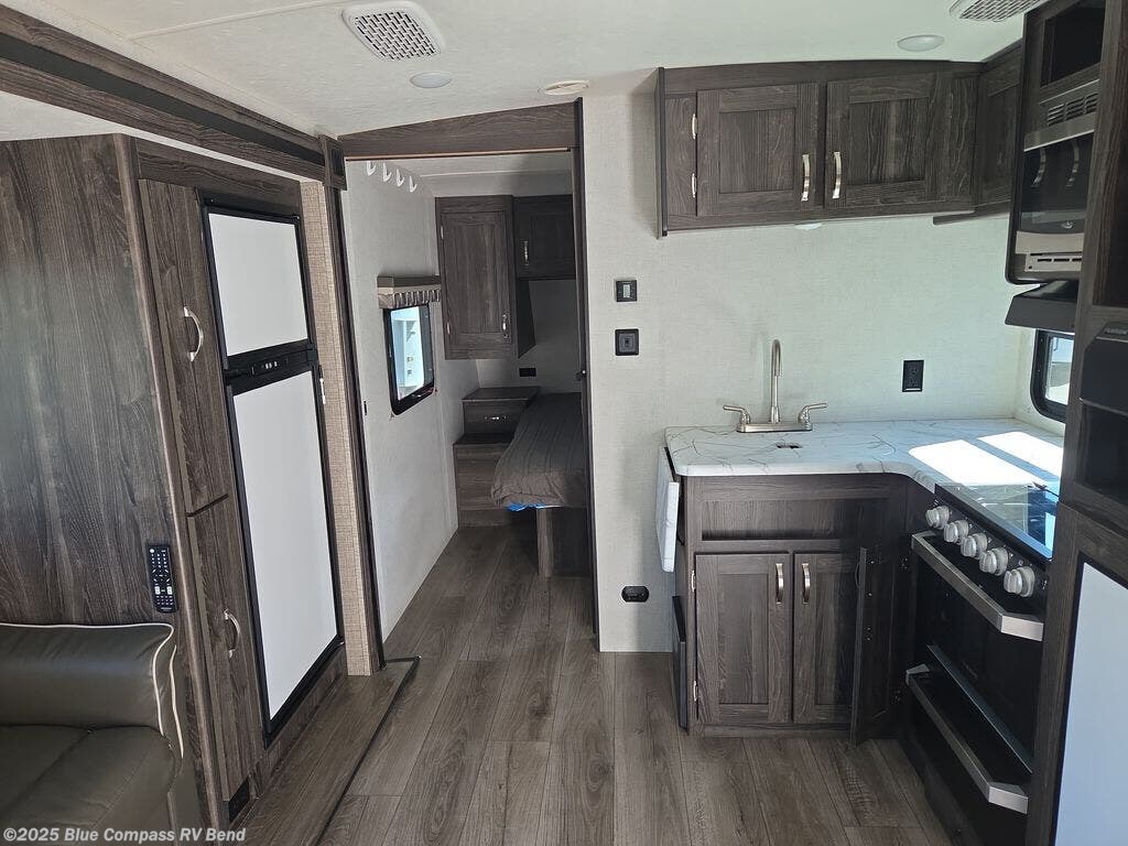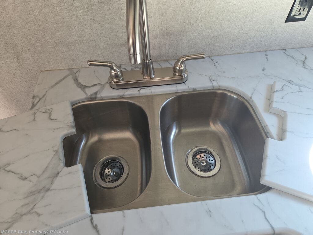 After a fun day outdoors playing horseshoes, walking around the campgrounds or relaxing under the power awning, you can head inside to the main living area to watch the 39" LED TV, or play a card game at the dinette table while relaxing on the chaise lounge. The cook will surely enjoy using the stainless steel appliances to make meals, and the rear full bathroom allows you to stay clean wherever you go plus includes wardrobe/linen storage. Inside you will also find two pantries, a front bedroom with a queen bed and plenty of clothing storage, plus a pet kennel under the bed.