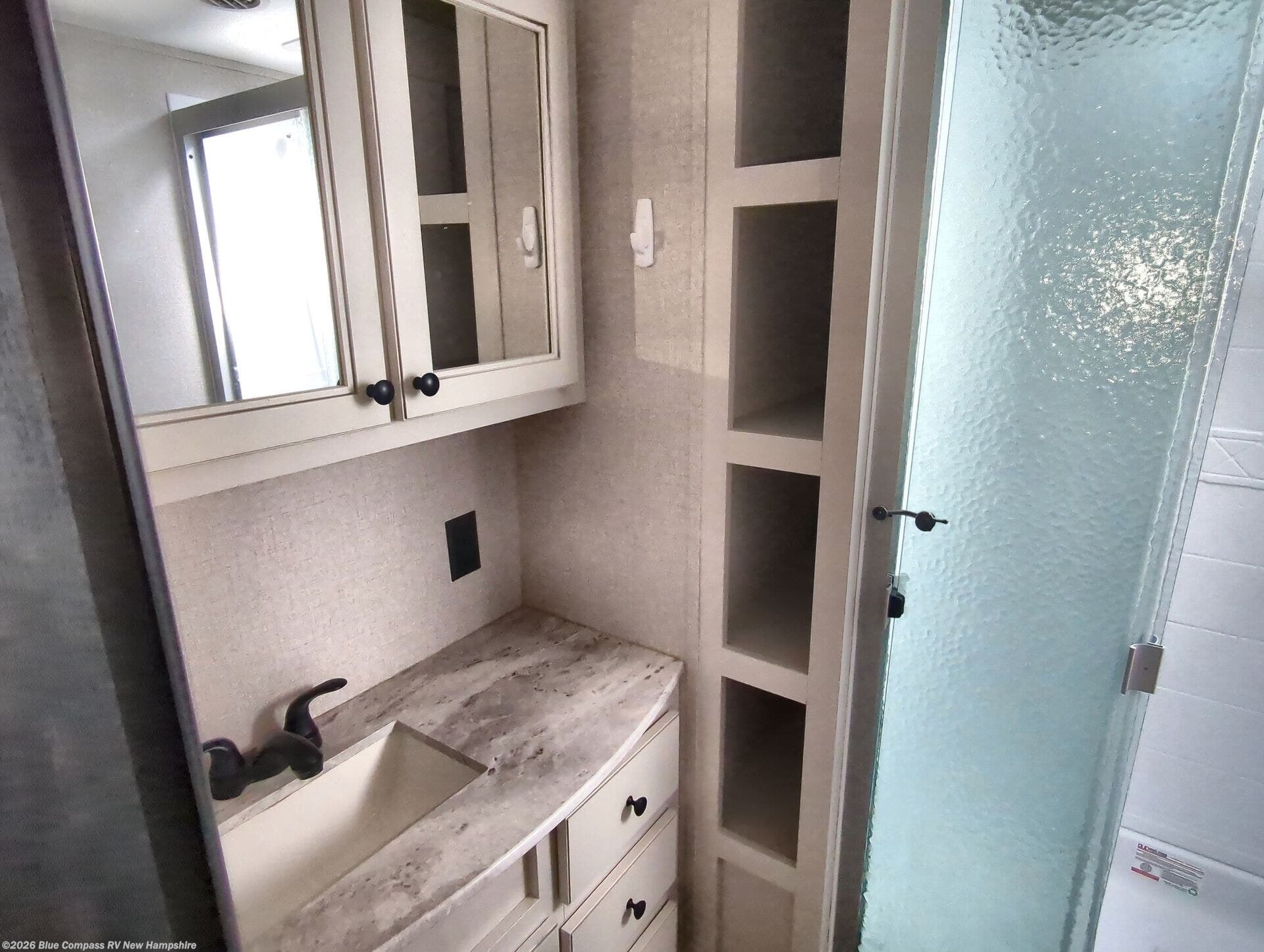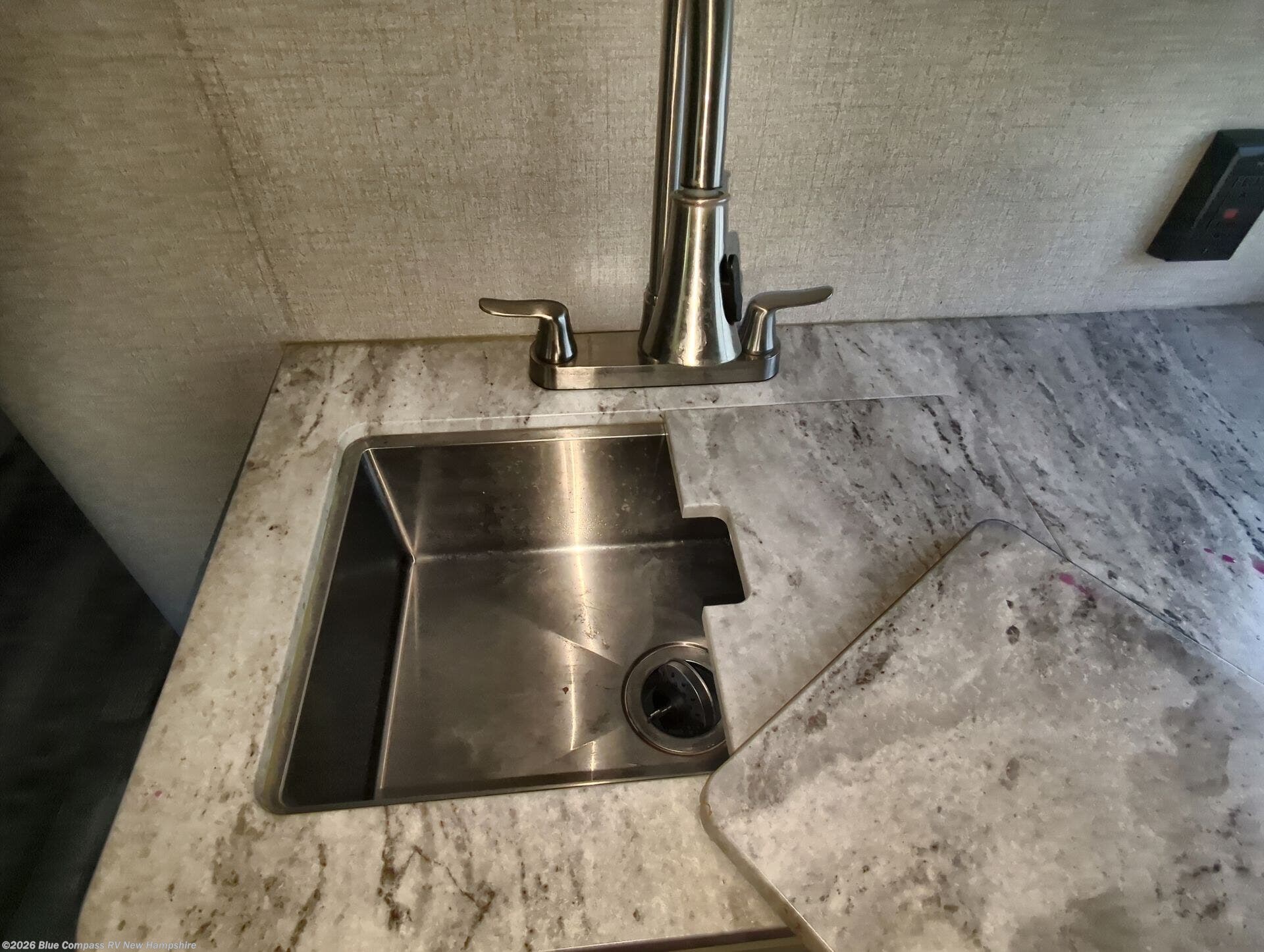 If you enjoy inside comforts as much as exploring outdoors, you will love all the features in this travel trailer. Imagine a U-shaped dinette with windows to see the lake or campsite of choice, and a tri-fold sofa in the rear next to the main entry allowing you to quickly relax after a bike ride, hike or just sitting under the awning outside. The full kitchen even includes a pull-out pet dish drawer for your best friend, and a counter extension giving you more space to prepare food and dry your dishes. Be sure to get cleaned up in the full bathroom before retiring to your own queen bed in the private front bedroom while your pet sleeps underneath you in the kennel. And the laundry chute plus the second exterior entry/exit door are added conveniences.