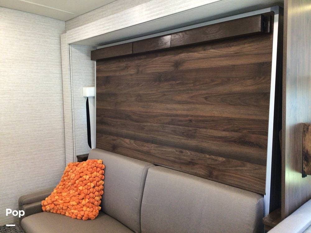The highly popular 24D floorplan features a versatile design centered around a power operated Murphy bed system and a comfortable U-shaped dinette, maximizing living space during the day. This design provides a cozy sofa when the bed is stowed and a queen-size bed when lowered, so you never have to convert your dinette for sleeping. The rear of the coach boasts a surprisingly spacious full bathroom with a large shower and ample wardrobe space.