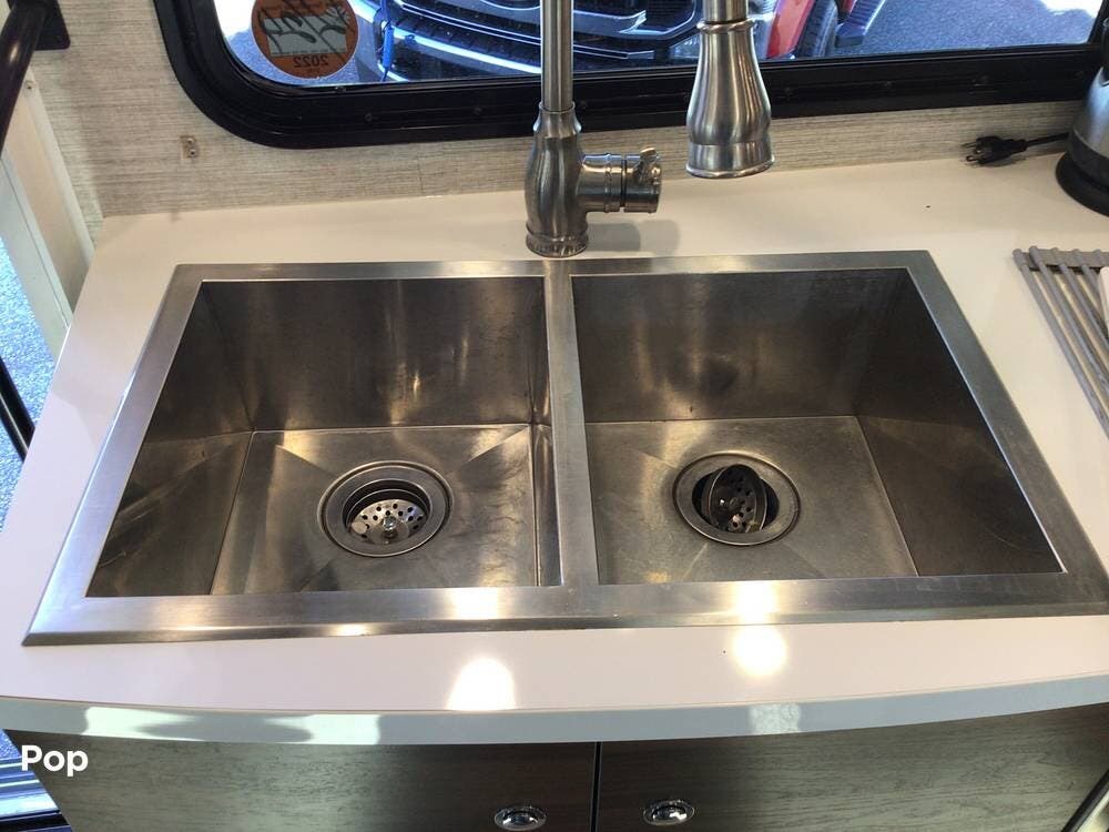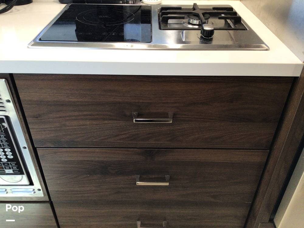 You'll find generous storage throughout the coach, including cross-coach exterior compartments and interior overhead cabinets, perfect for all your gear. The interior features upscale laminate countertops, soft-close galley drawers, and dimmable LED lighting, creating a comfortable and modern living environment.