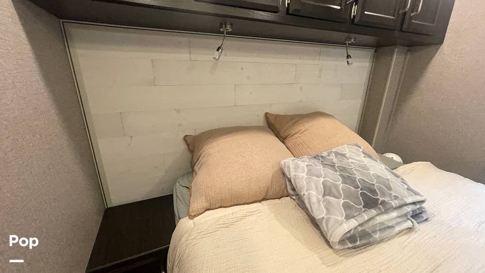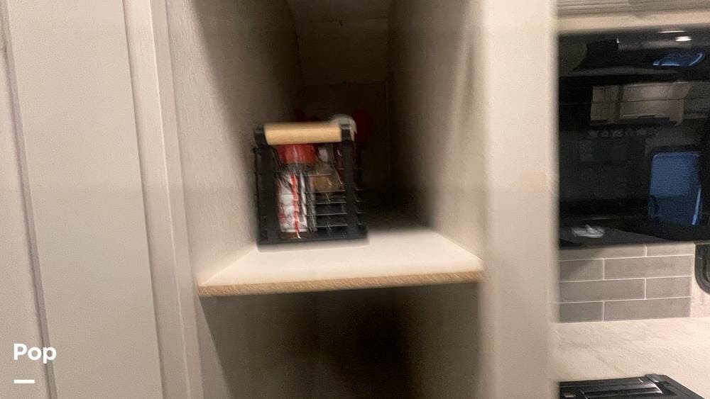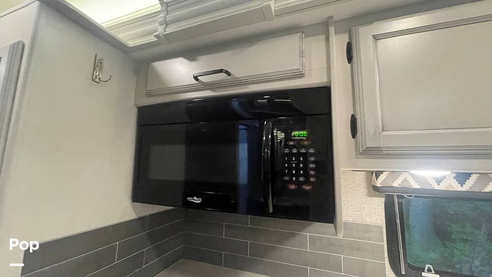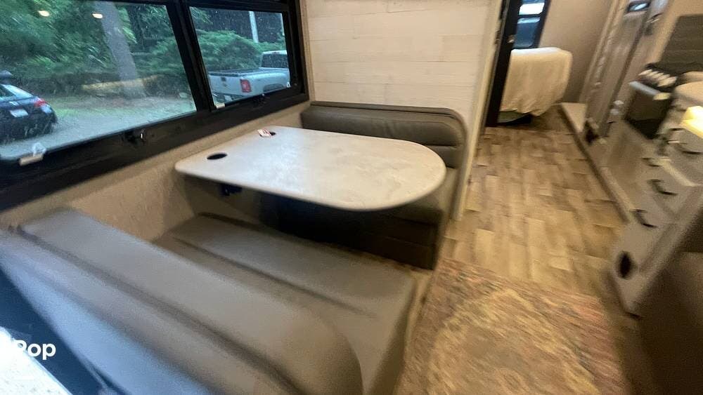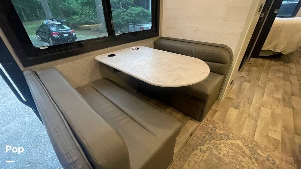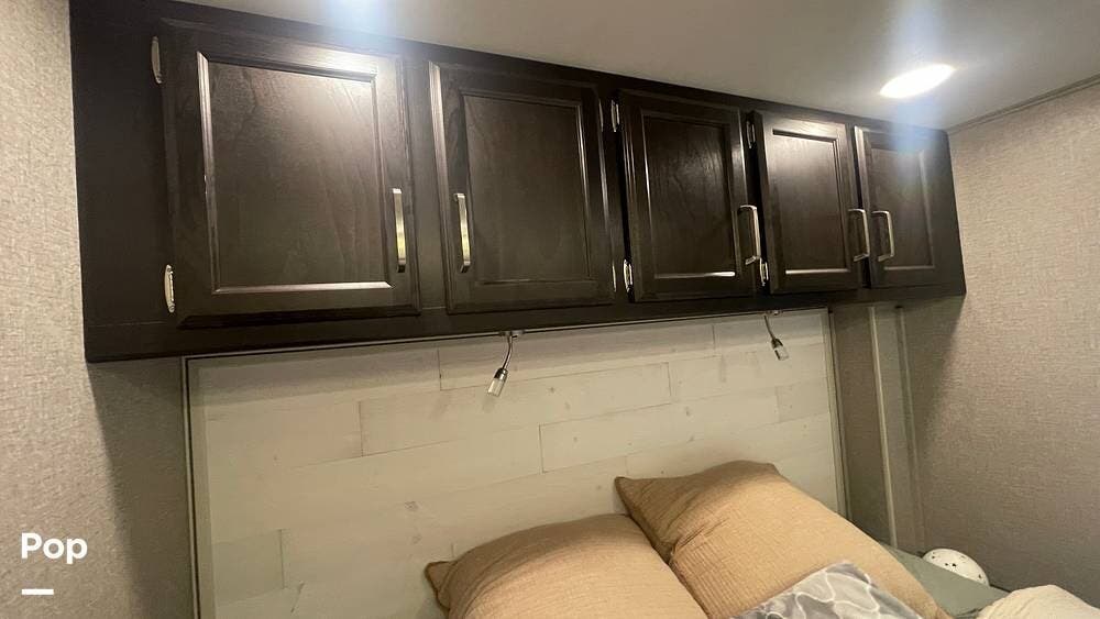 Inside, you'll find a modern farmhouse design that exudes comfort, with chic accent lighting and a legless dinette that creates an open, inviting space for meals and relaxation. Offers ample storage space above and below the deck, making organizing camping supplies and personal items for your travels easy. Keeps you warm with an efficient furnace featuring auto ignition and a thermostat for easy temperature control.