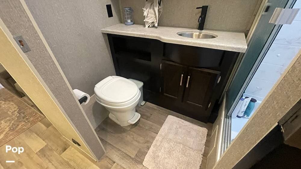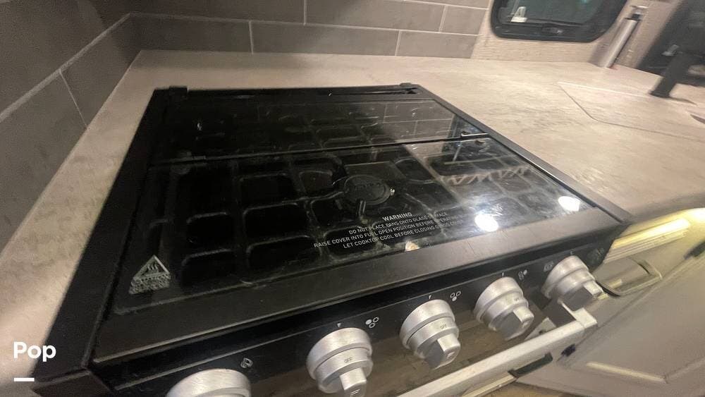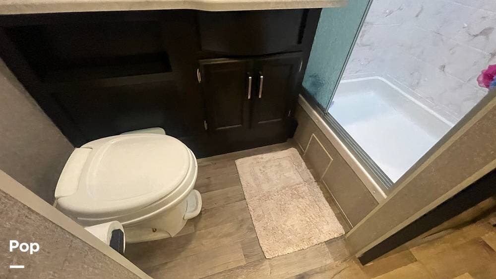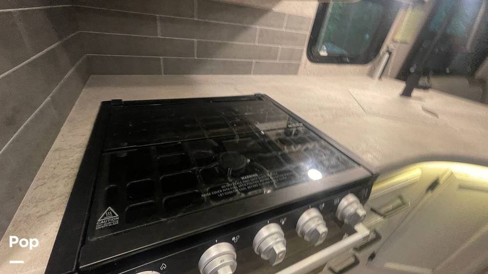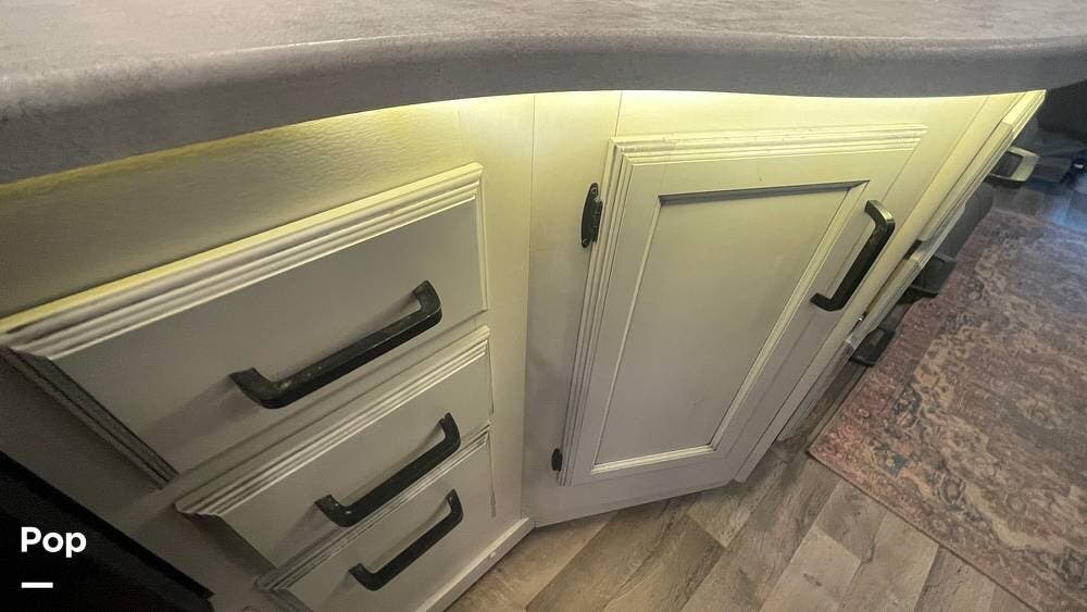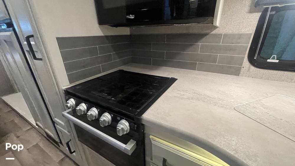 Inside, you'll find a modern farmhouse design that exudes comfort, with chic accent lighting and a legless dinette that creates an open, inviting space for meals and relaxation. Offers ample storage space above and below the deck, making organizing camping supplies and personal items for your travels easy. Keeps you warm with an efficient furnace featuring auto ignition and a thermostat for easy temperature control.