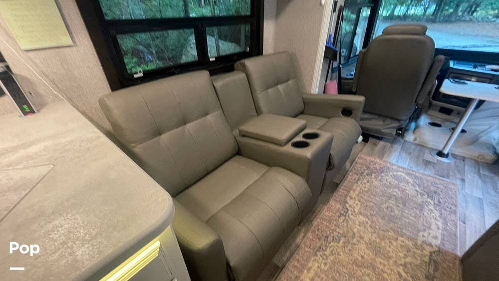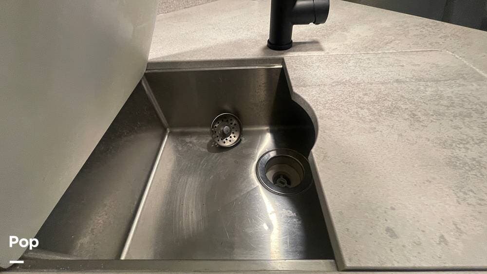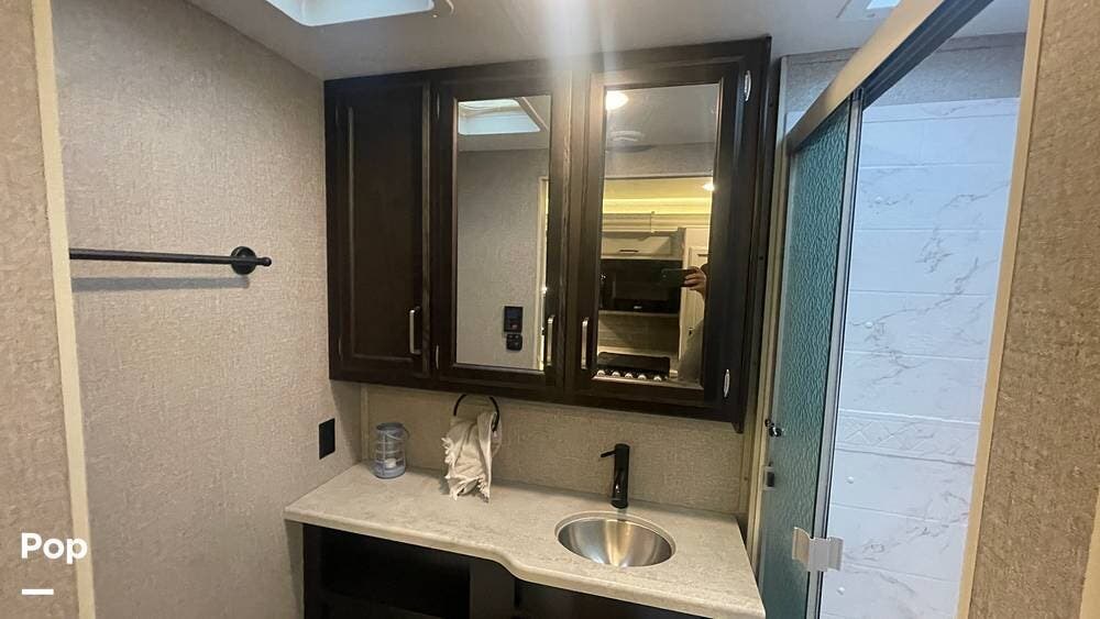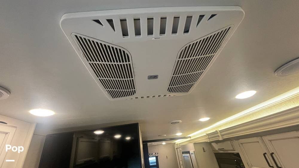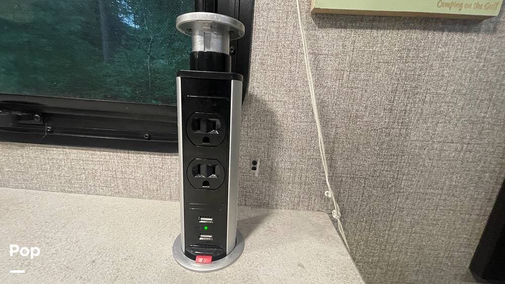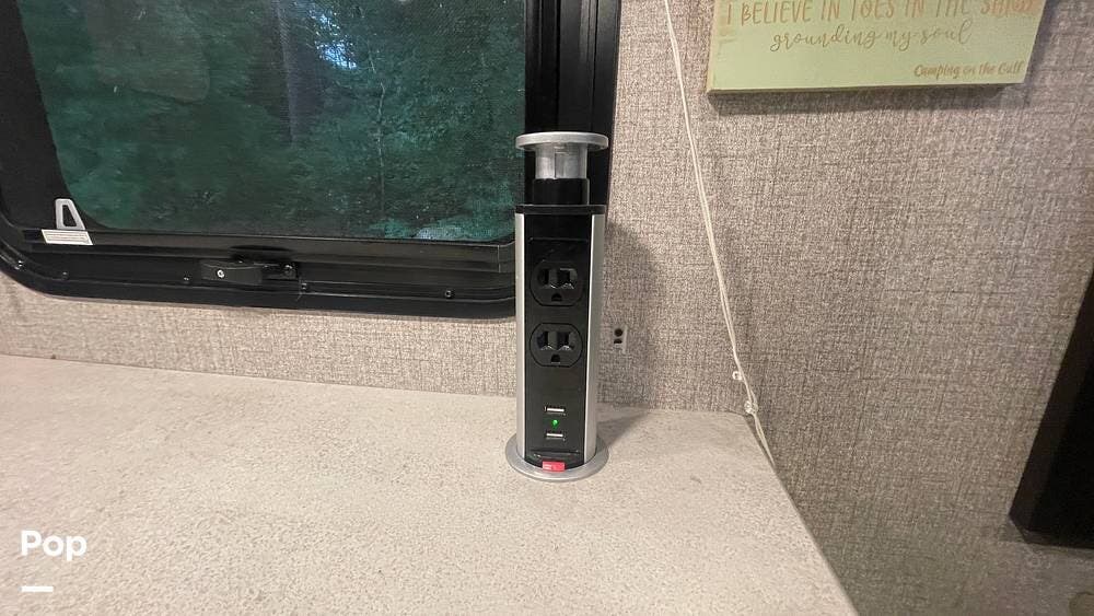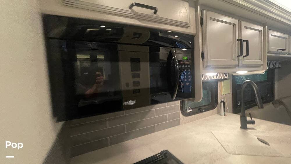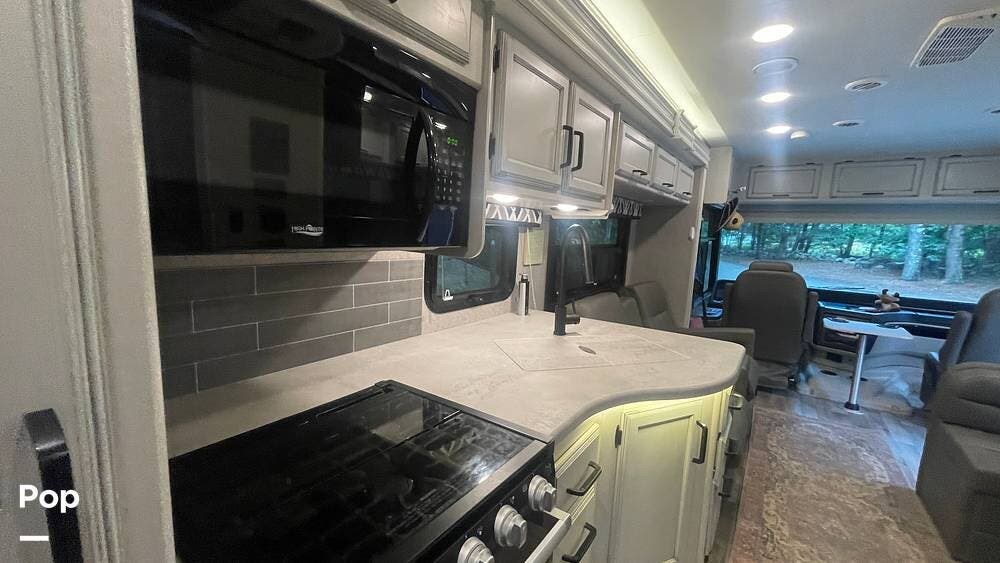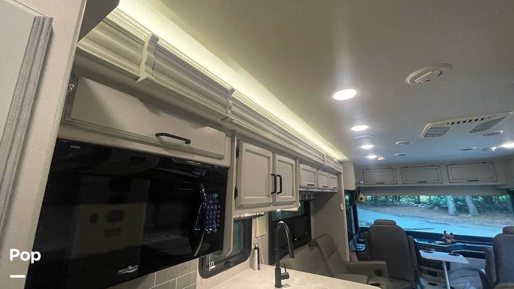 It also boasts an impressive exterior entertainment center and kitchen, perfect for enjoying nature while dining or watching shows outdoors. This feature enhances your experience, whether entertaining friends or relaxing with family.
