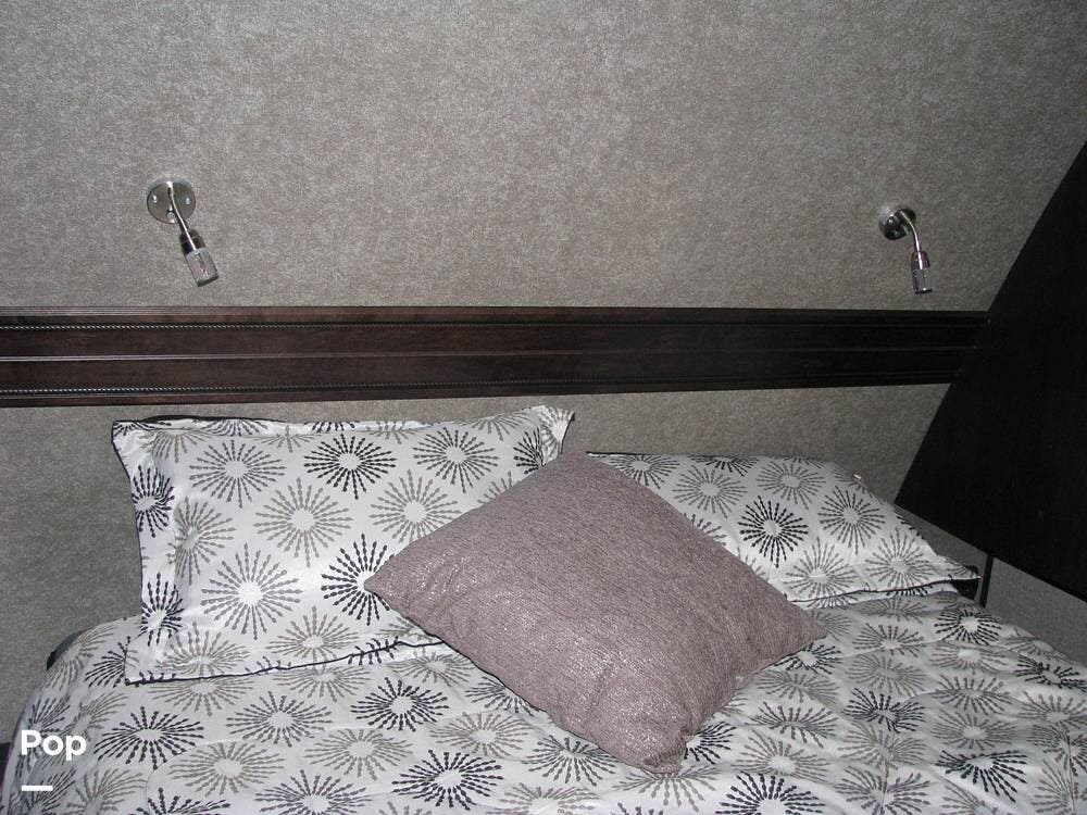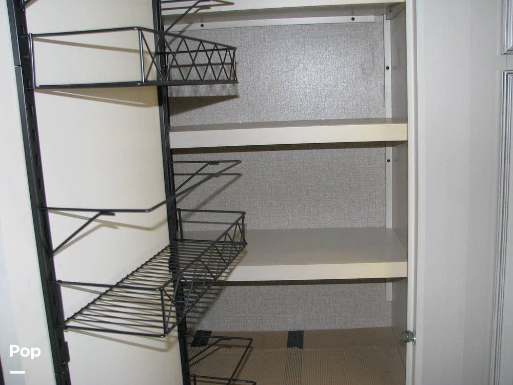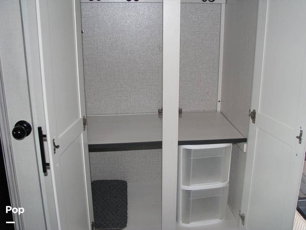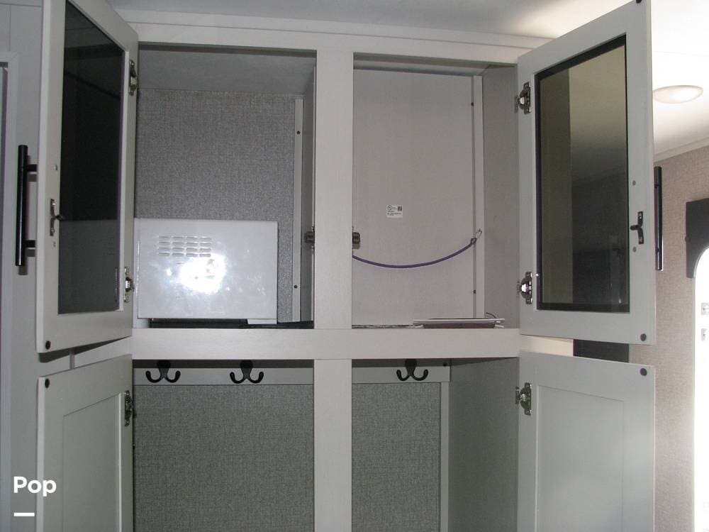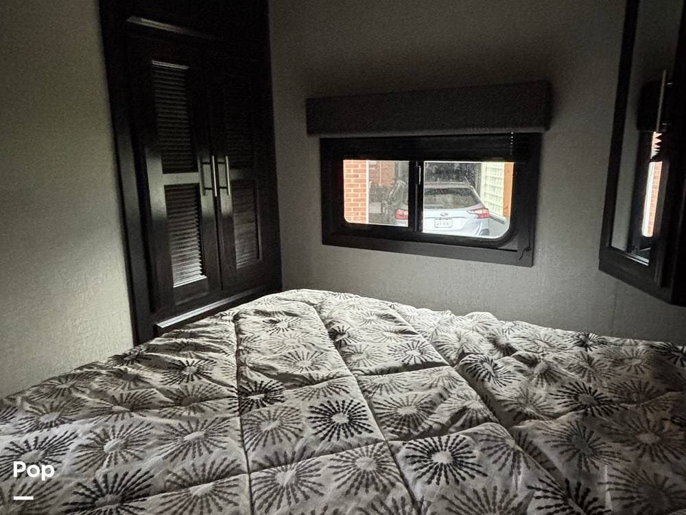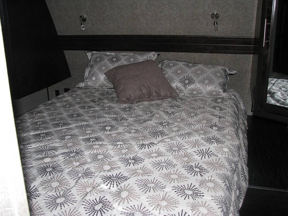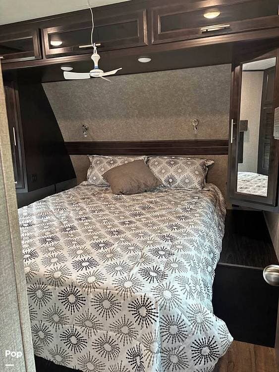 As you enter the unit from the entry door and look to your right, you will find a 60x80 queen-size bed with under-bed storage, overhead cabinets, and pre-wiring for cable or satellite.