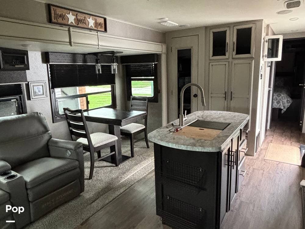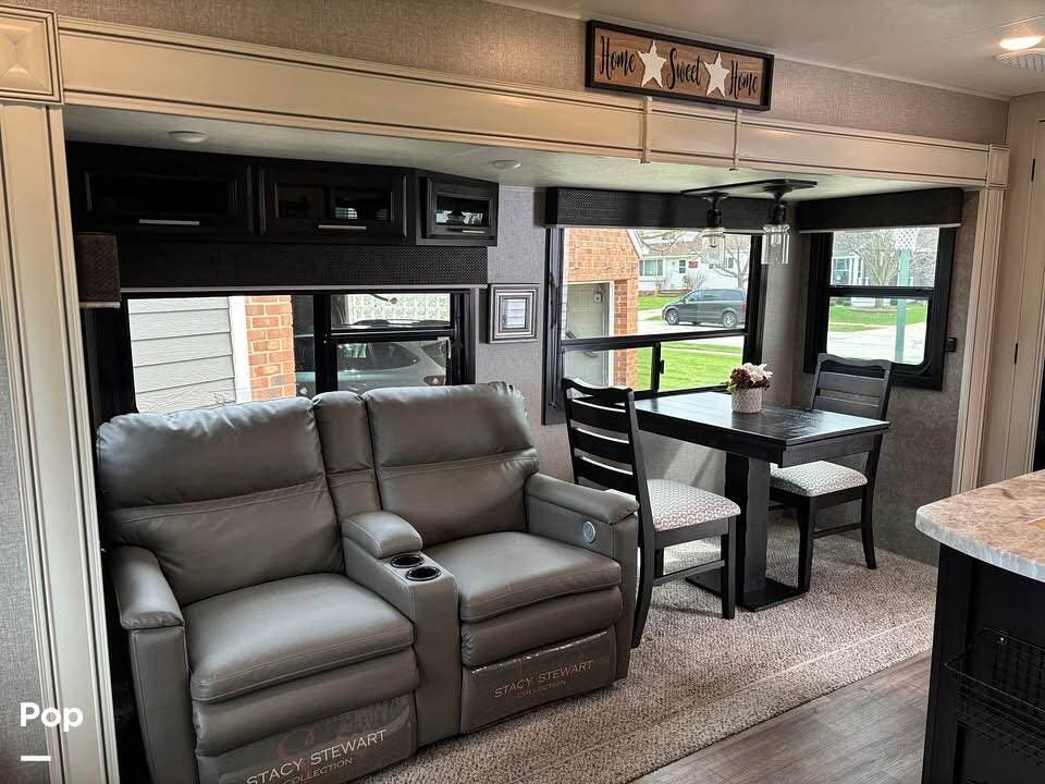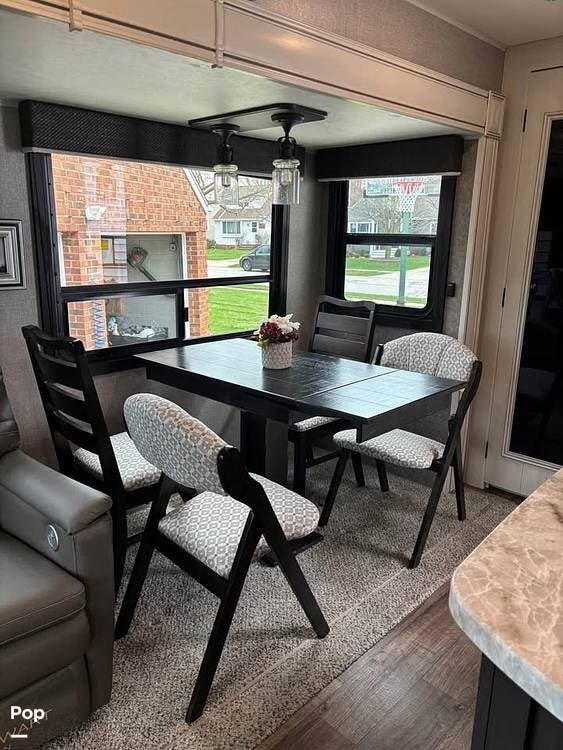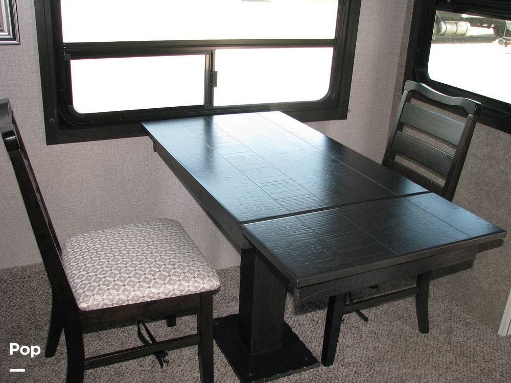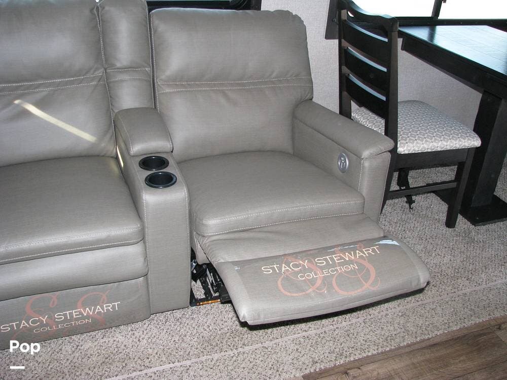 On the right side of the trailer, you have a dining table with a leaf and four chairs, as well as two heated and massaging recliners.