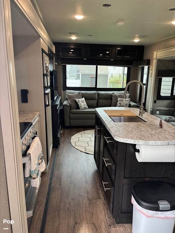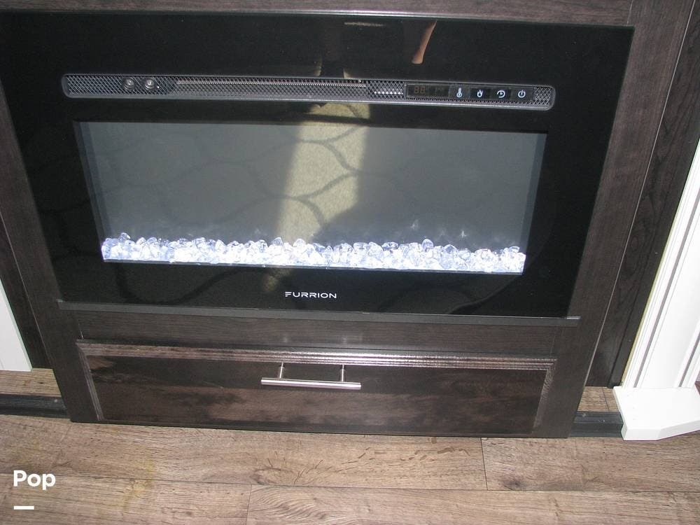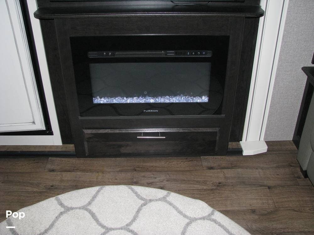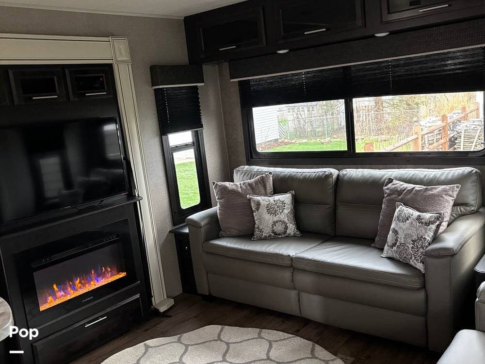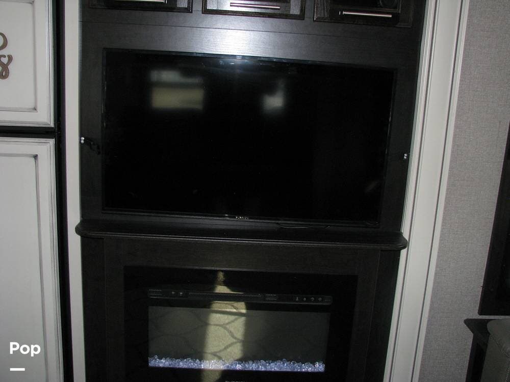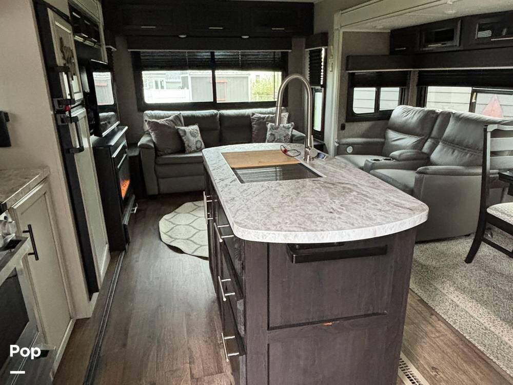 On the right side of the trailer, you have your entertainment area and kitchen, which features an LED TV with HDMI ports, AM/FM radio, DVD player, and CD player with auxiliary connections, overhead speakers, and an electric fireplace with heat. Full-size refrigerator, microwave, three-burner cooktop, and a center island with a double kitchen sink.