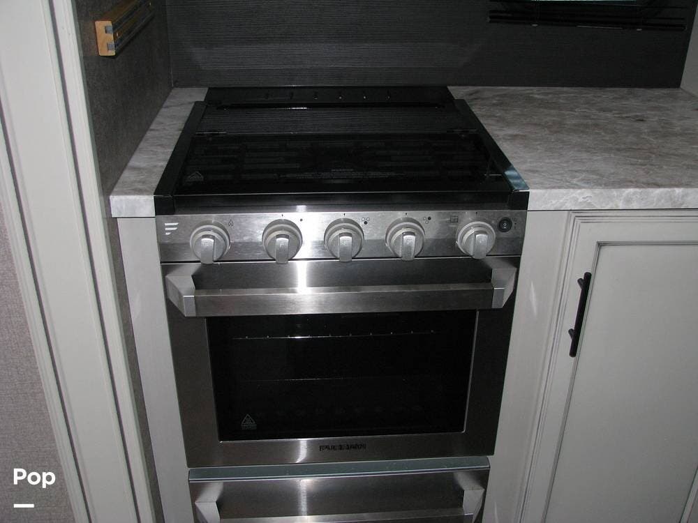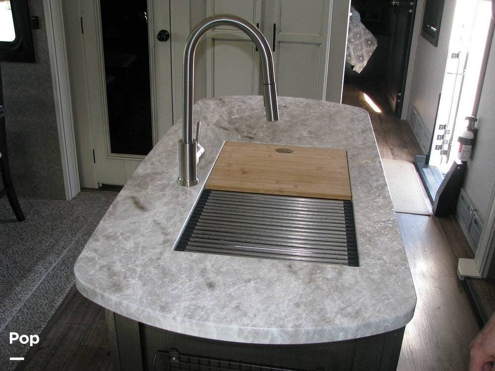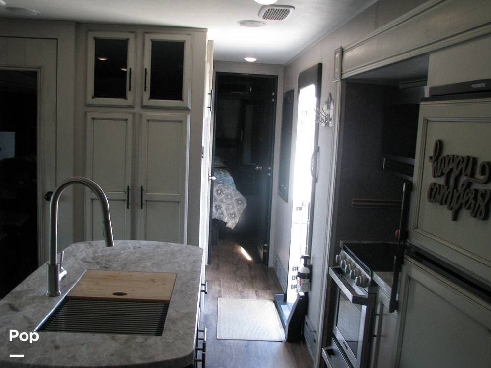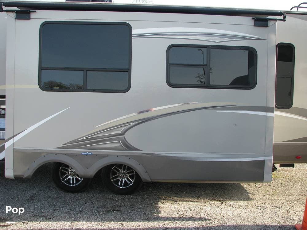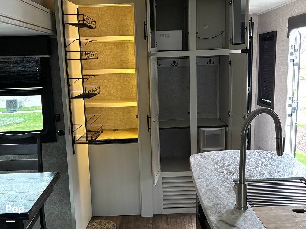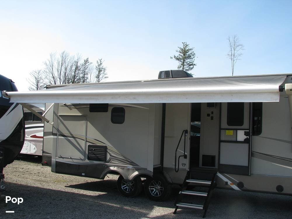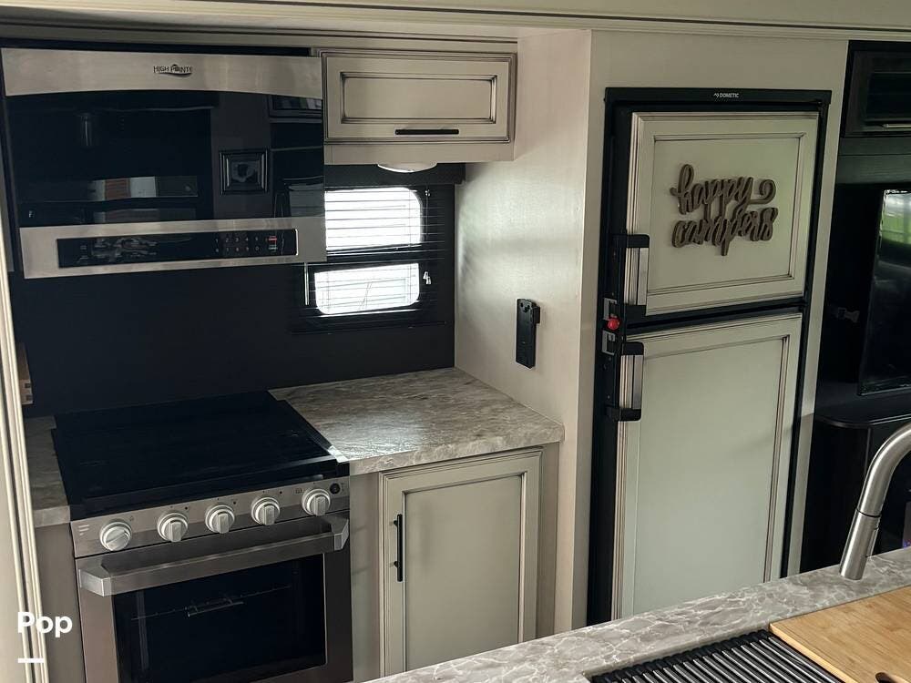 The exterior of the trailer features two slide-outs, a fiberglass cap rear access ladder, a 21-foot power awning with LED lights, an outdoor kitchen area, pre-wiring for an outdoor television, and two quick-connect propane connections for a gas grill or Blackstone.