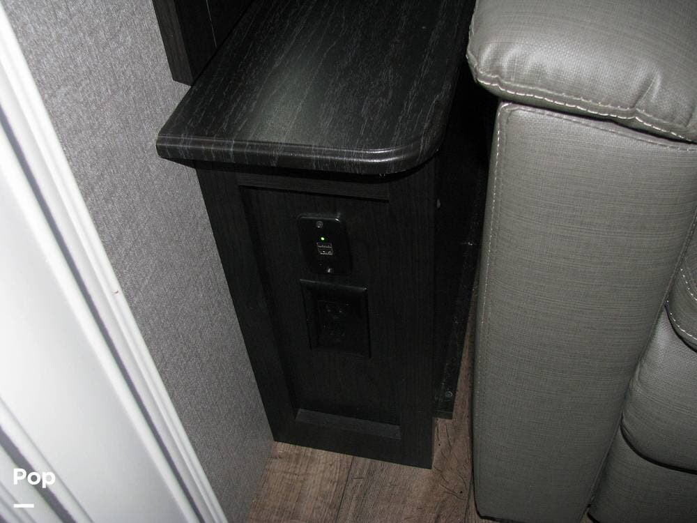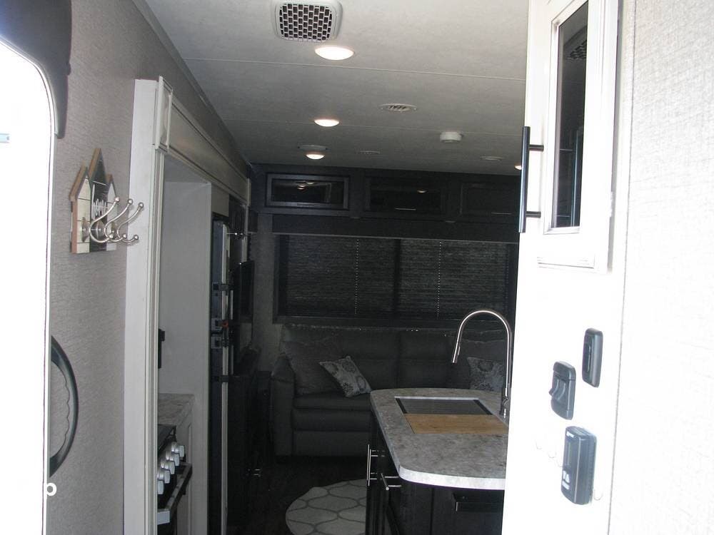 Rear and side cameras, 2" rear receiver, cable and satellite connections, power tongue jack, utility center, black tank sprayer, and heated and enclosed underbelly with plenty of storage.