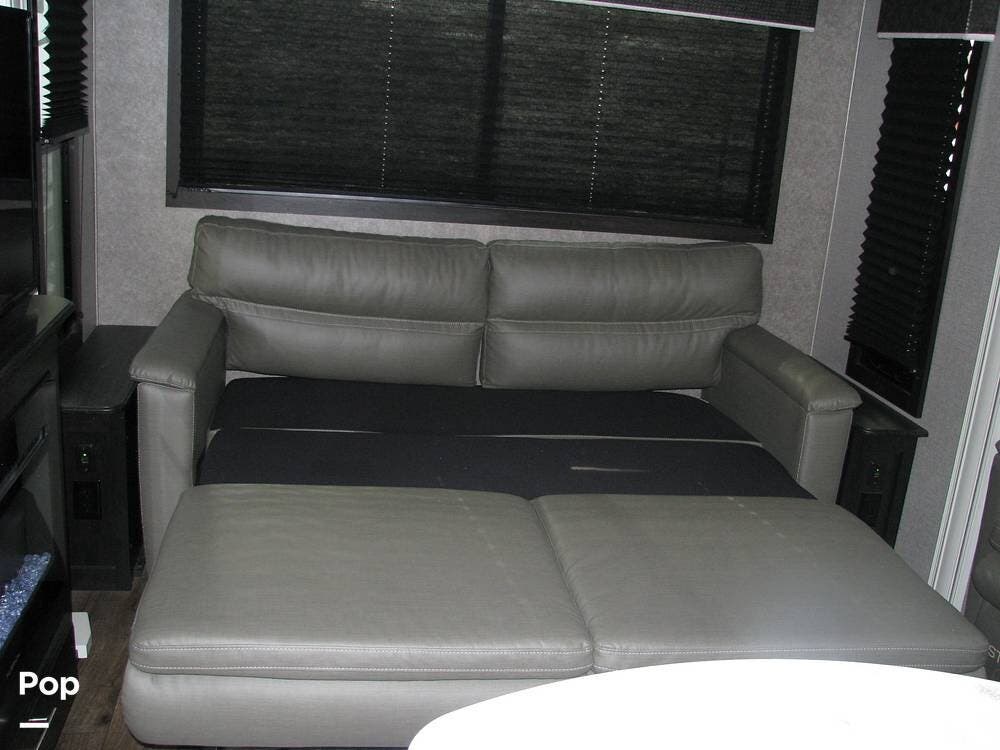 In the rear of the trailer, you have a tri-fold sofa that converts to a queen-size bed, and overhead cabinets.