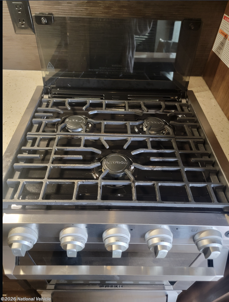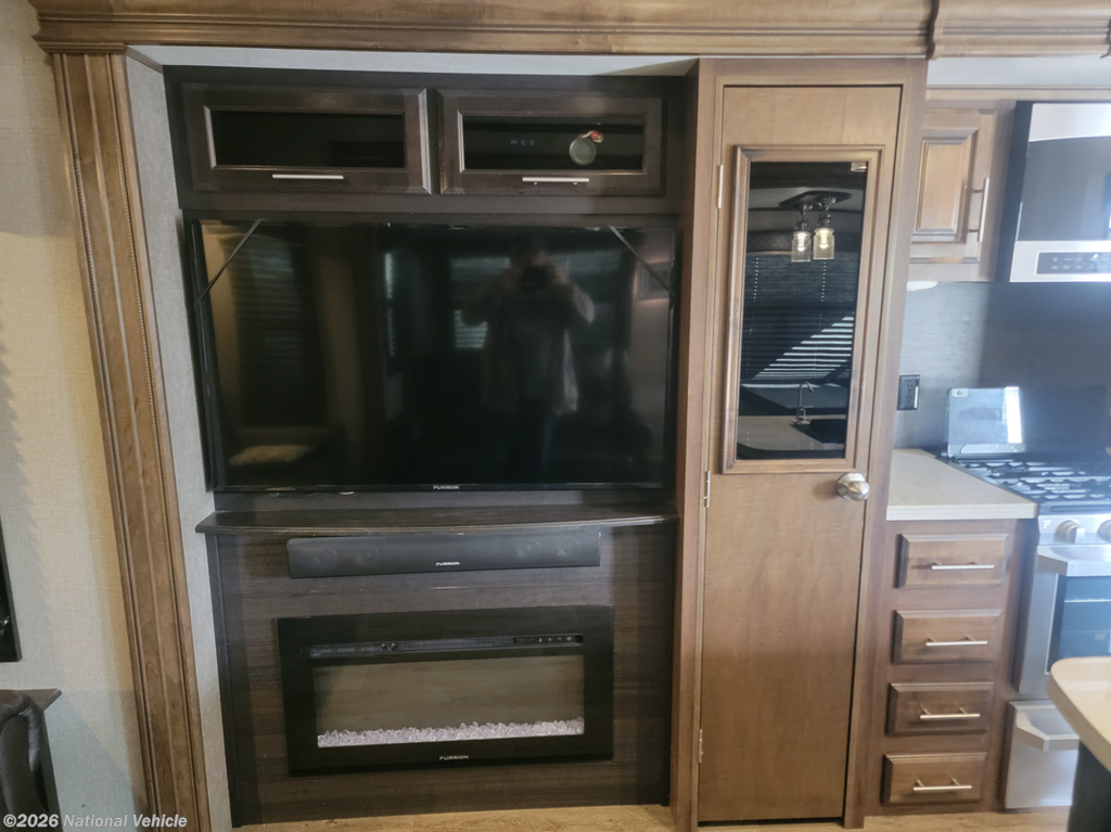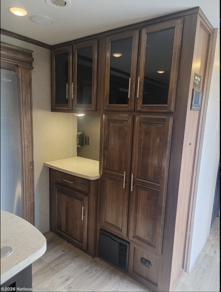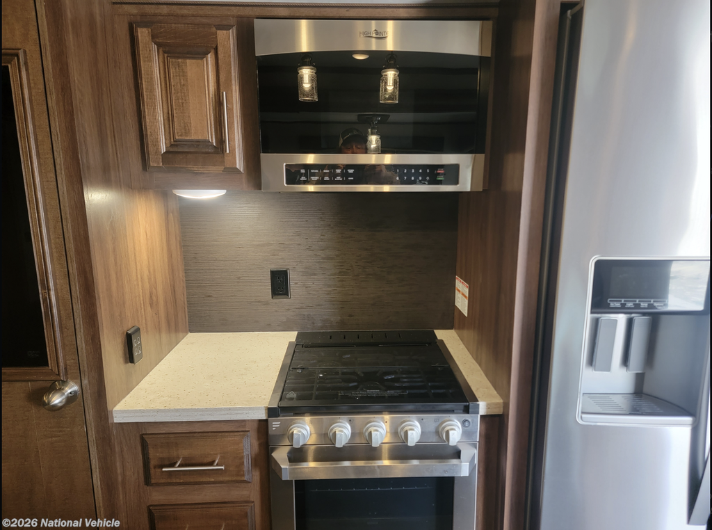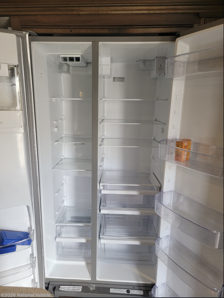 The rear living floorplan features opposing slides that create a true great-room feel, complete with theater seating, a tri-fold sofa, a large entertainment center, and a cozy fireplace?perfect for relaxing nights at camp. The gourmet kitchen impresses with solid-surface countertops, a residential refrigerator, microwave, three-burner cooktop, oven, pantry storage, and a center island that provides both prep space and additional storage.