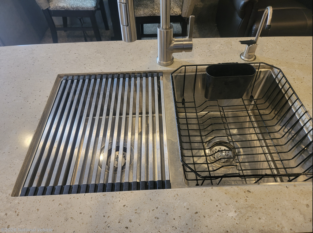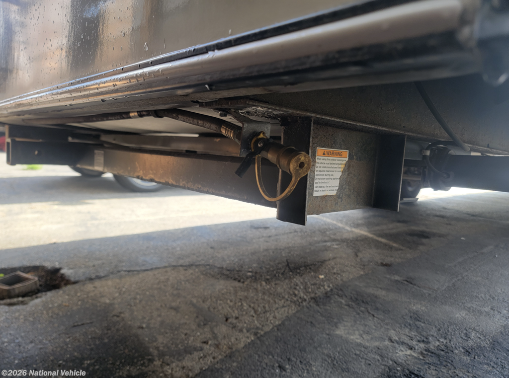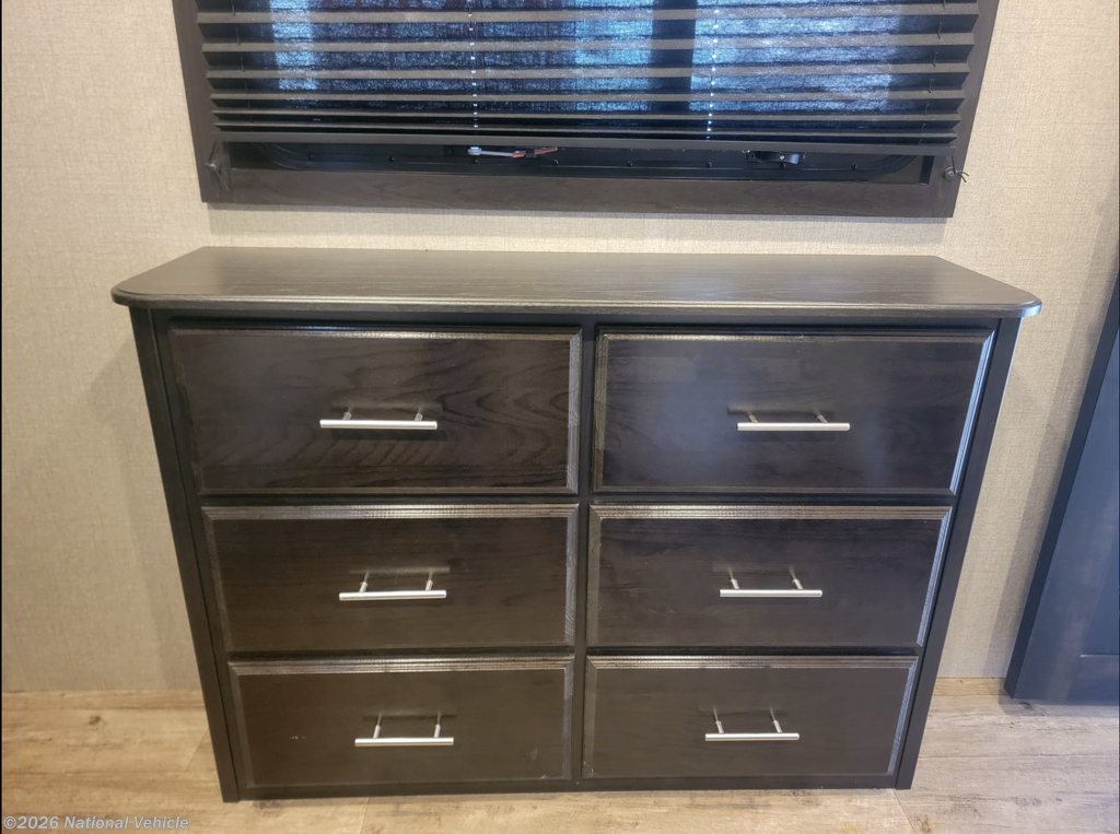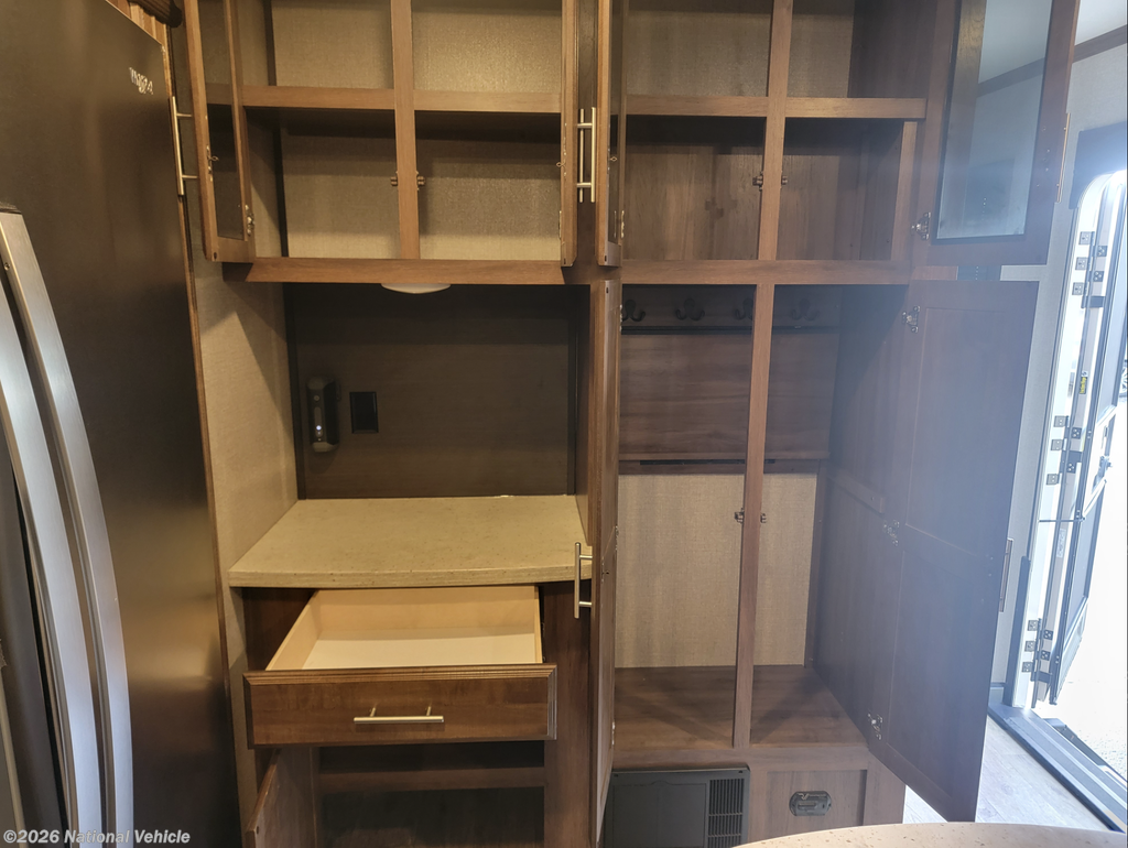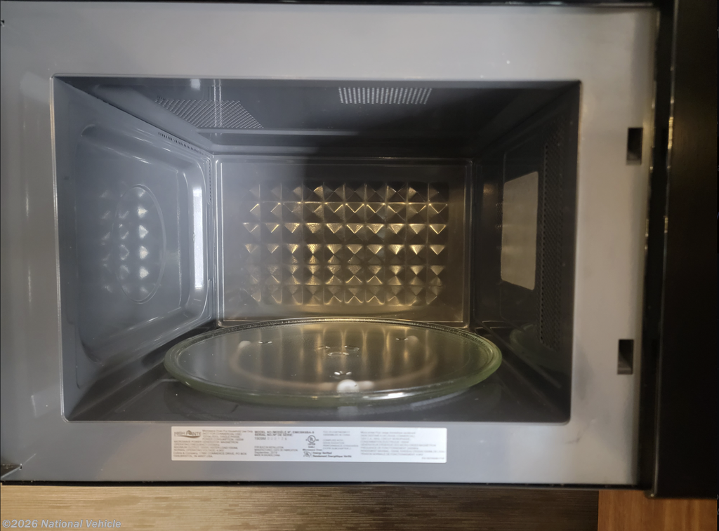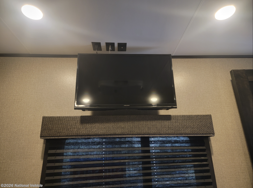 The rear living floorplan features opposing slides that create a true great-room feel, complete with theater seating, a tri-fold sofa, a large entertainment center, and a cozy fireplace?perfect for relaxing nights at camp. The gourmet kitchen impresses with solid-surface countertops, a residential refrigerator, microwave, three-burner cooktop, oven, pantry storage, and a center island that provides both prep space and additional storage.