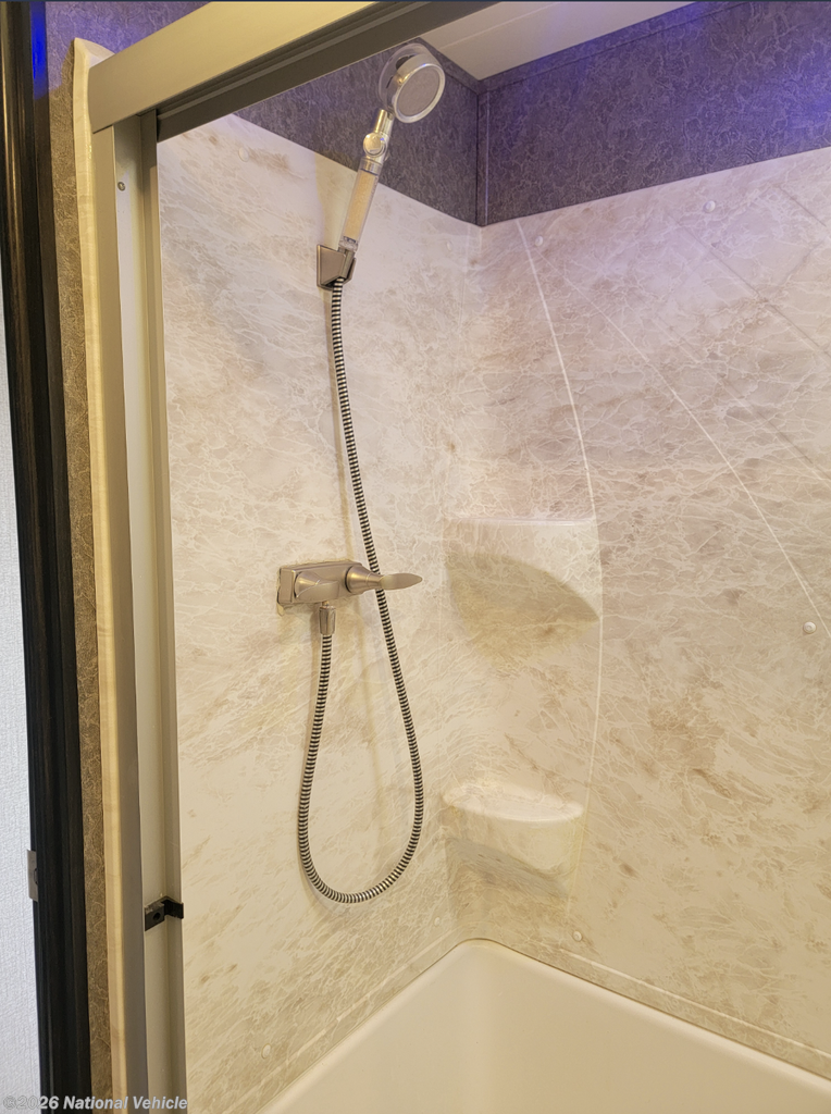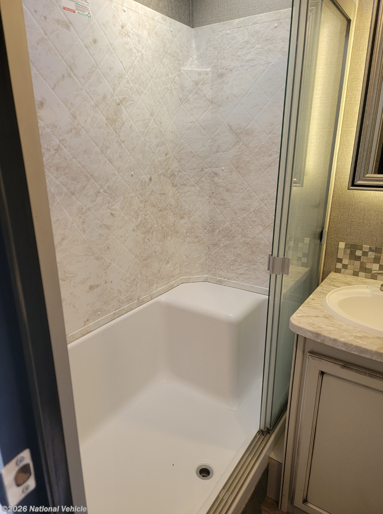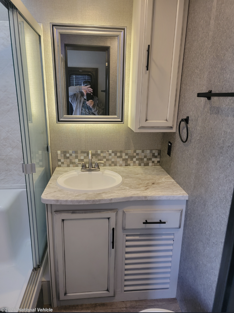 Toward the front, the private master suite offers a walk-around king bed, a spacious wardrobe, and a dresser. The bathroom includes a residential-style shower, linen storage, and a well-designed vanity for everyday comfort.