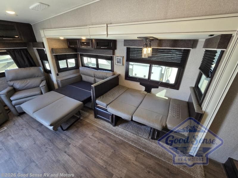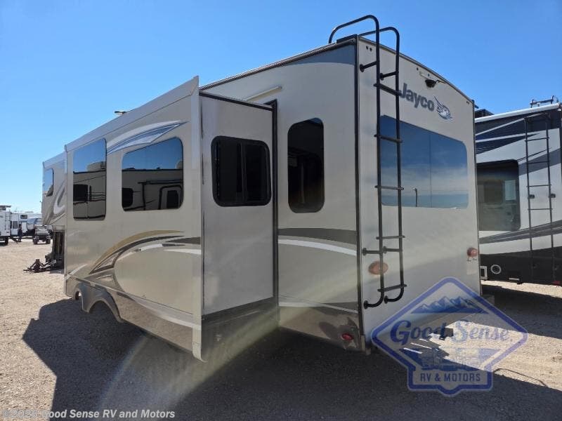 Enjoy every camping trip with this Jayco Eagle HT fifth wheel in tow! Model 26.5RLDS features a rear living layout with two recliners and an entertainment center with a LED TV, plus you can add an optional fireplace. The double slide outs help to open up the floor space, and within the rear slide out there is a tri-fold sofa and a free-standing table for you to enjoy a relaxing evening with friends and family. The private master bedroom features a queen bed plus a convenient entry door which leads into the bathroom. In the evening plan to grab your camp chair, a snack, and enjoy visiting with your family or friends while sitting under the 21' electric awning with LED lights.