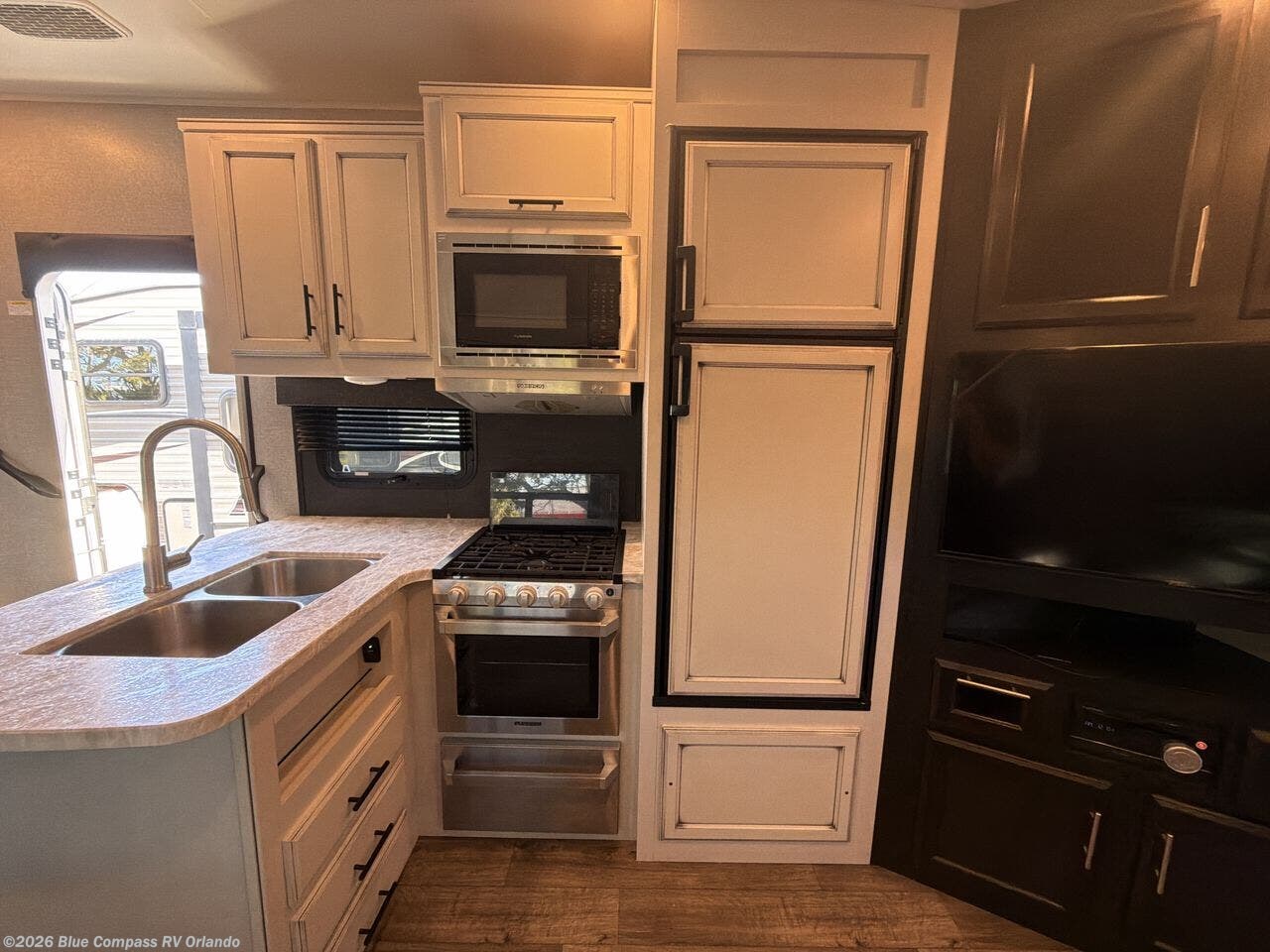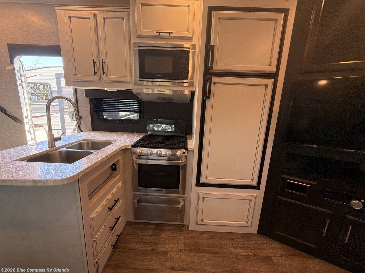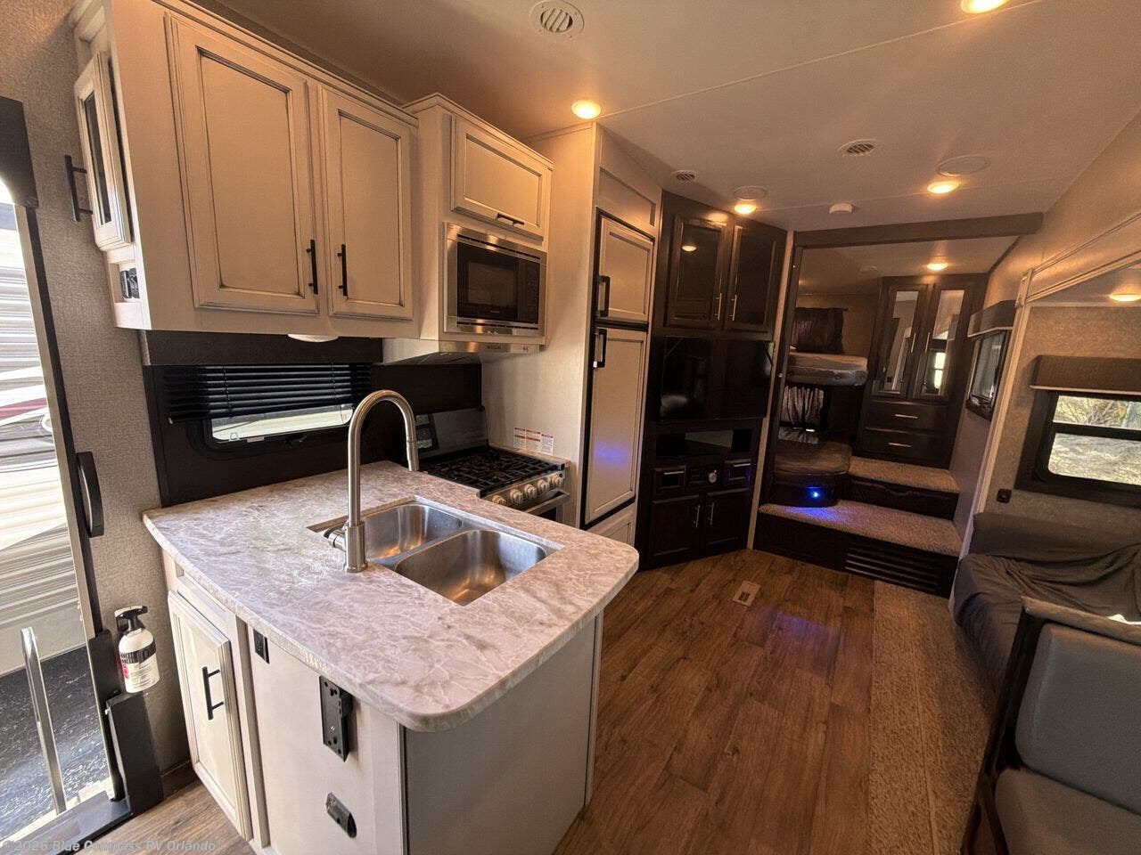 The kids will love walking up the steps to the double-size bunks in this Eagle HT fifth wheel when it's time for bed or a nap. The bunks support up to 600 pounds which would allow guests to use this space too. You will have your own master bedroom that has a walk-around queen bed with nightstands and wardrobes, plus a wardrobe slide for more space. You will also find an "Industry's Best" outside kitchen, and inside you will love the look of the stainless steel appliances and the L-shaped countertop that gives you plenty of space to prepare a meal and wash the dishes. The entertainment center includes an LED HDTV, and you can always add a few options such as 16" Goodyear tires, an LED fireplace, a free-standing table, a party sofa, and/or theater seating.