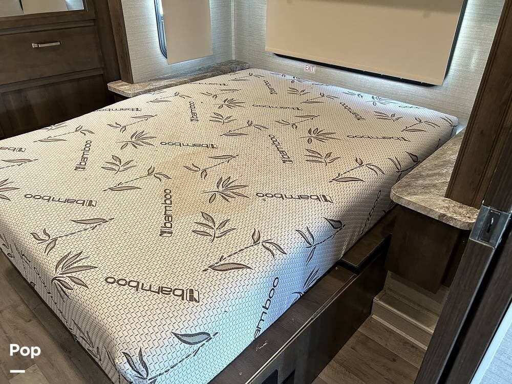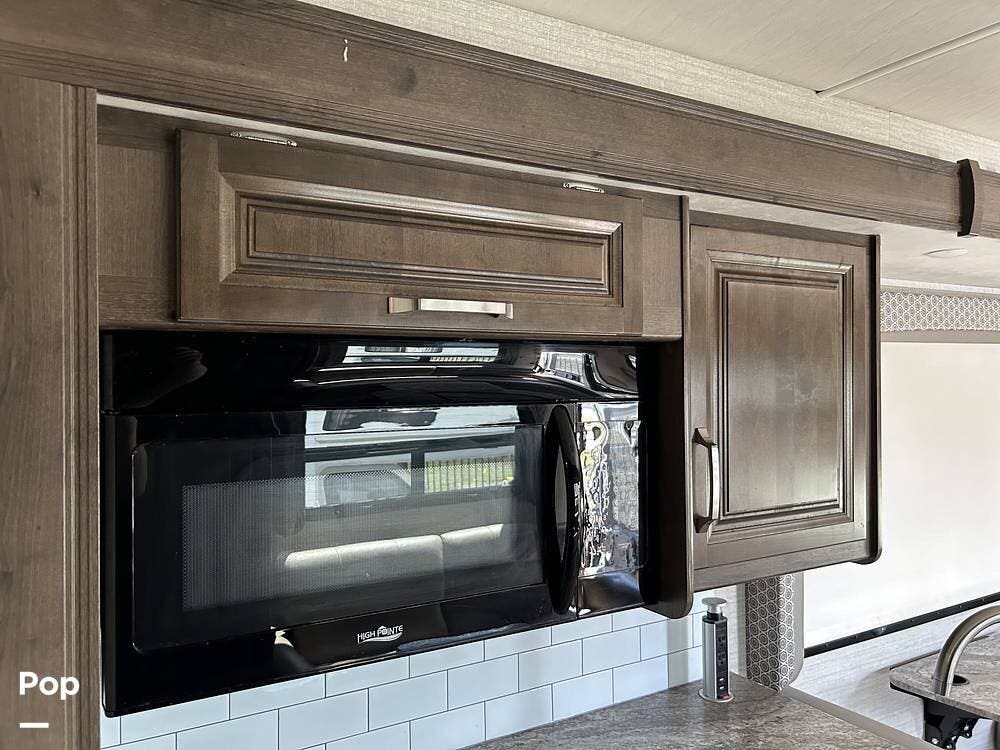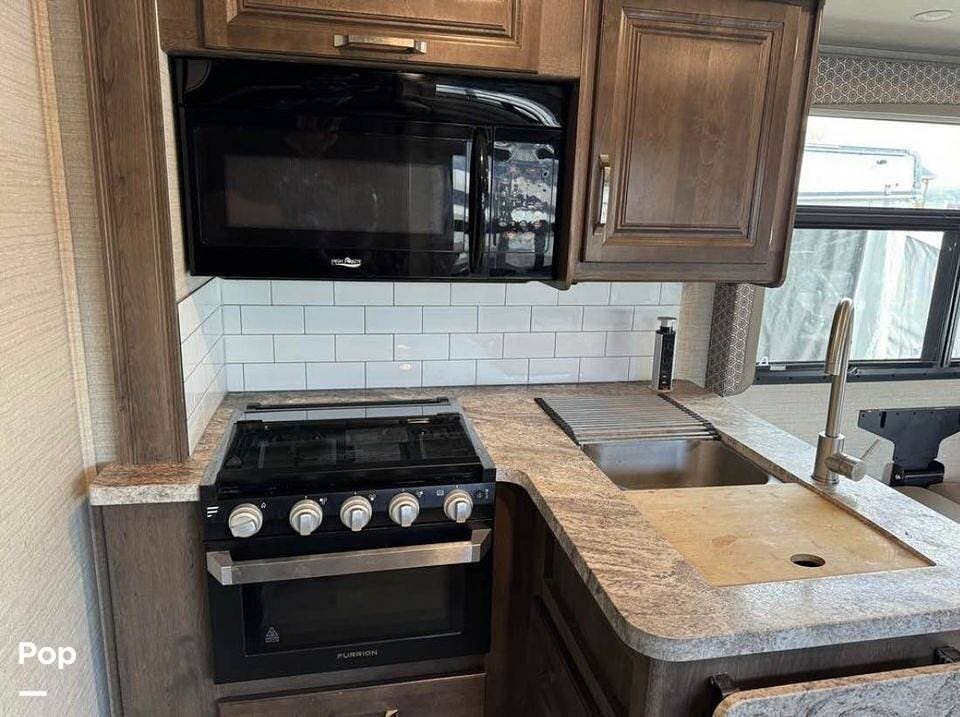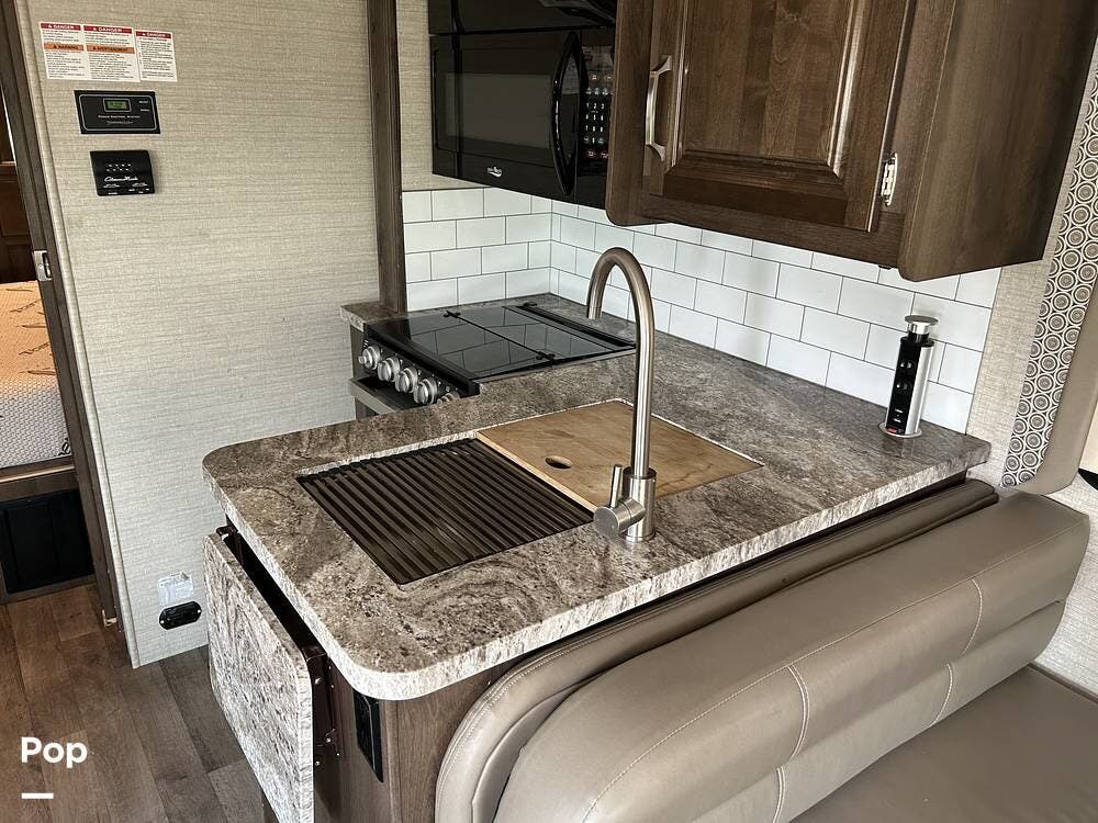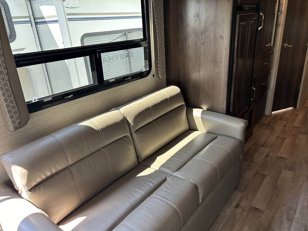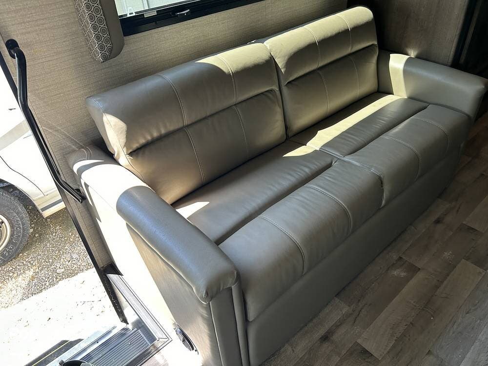 The living area has a kitchen with a convection microwave, stove, refrigerator, and sink. This motorhome's living area is a versatile space that can be easily converted into a bedroom. It features a queen Murphy bed with a comfortable mattress cover, ensuring a good night's sleep.