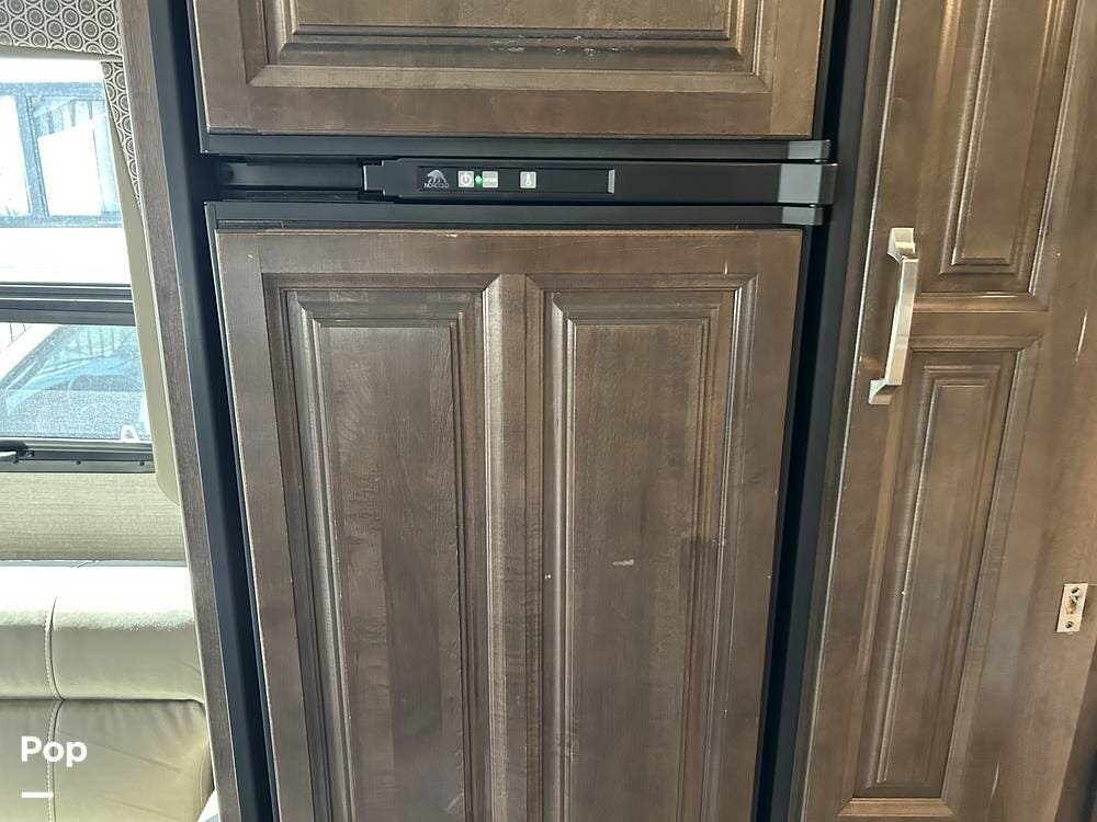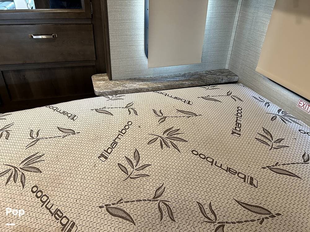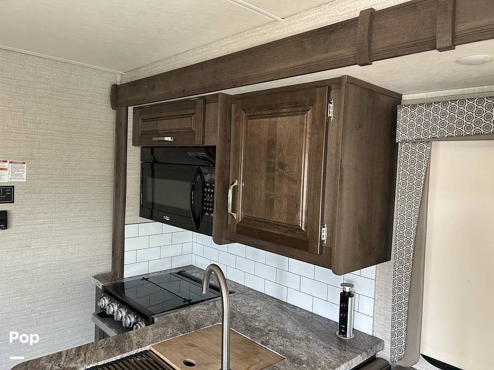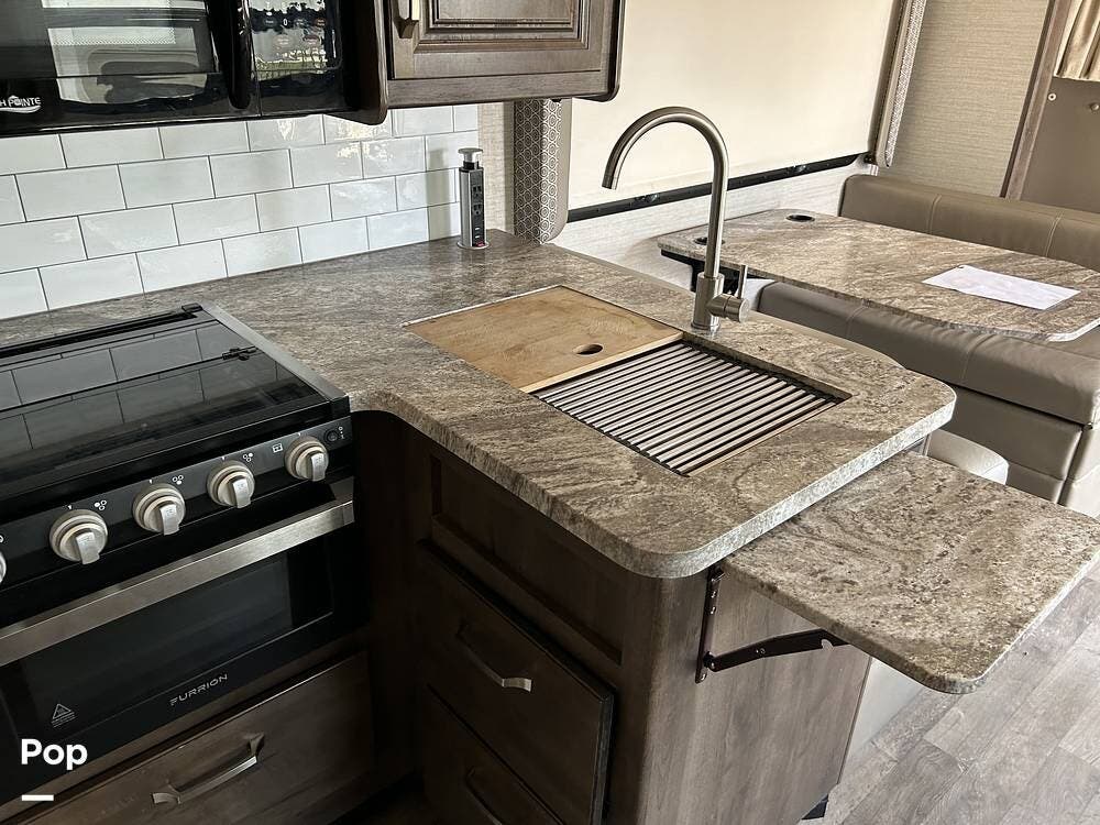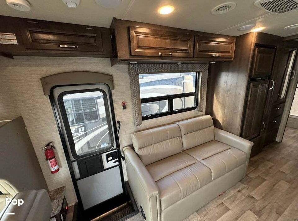 The living area has a kitchen with a convection microwave, stove, refrigerator, and sink. This motorhome's living area is a versatile space that can be easily converted into a bedroom. It features a queen Murphy bed with a comfortable mattress cover, ensuring a good night's sleep.