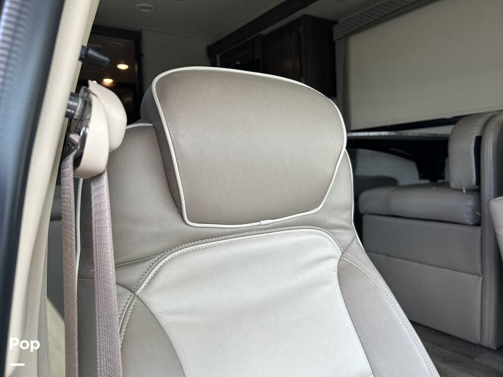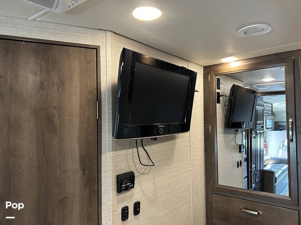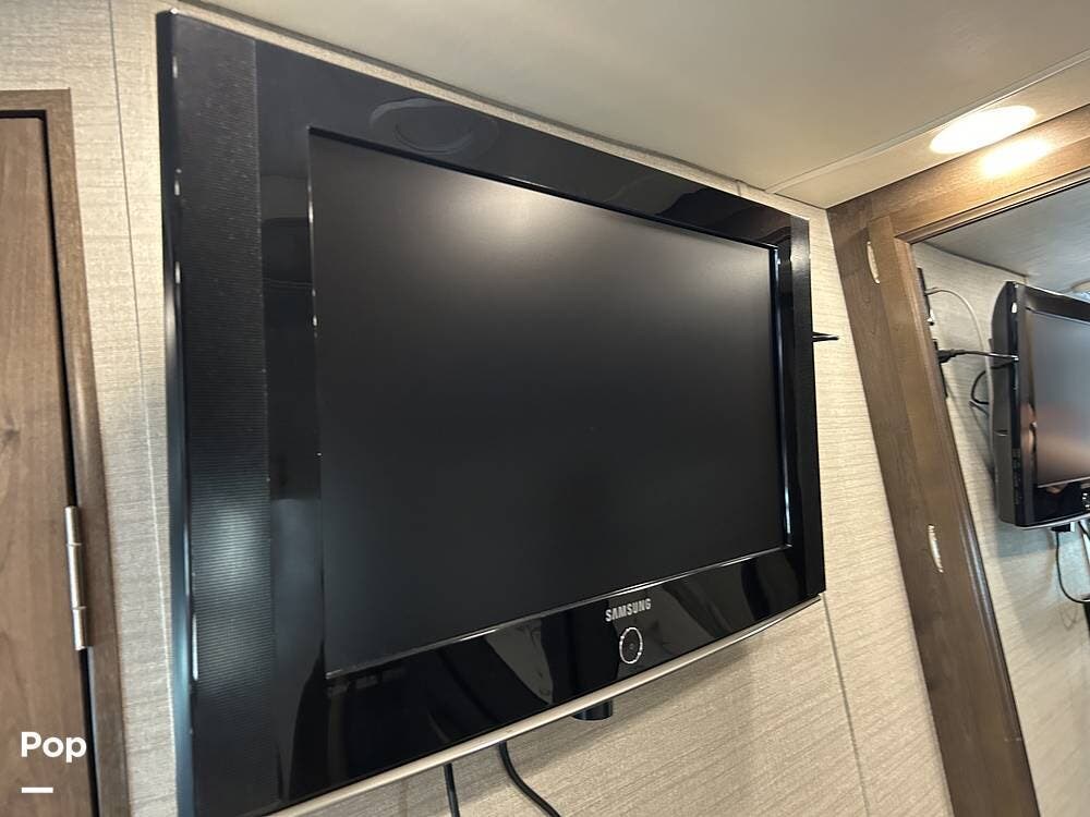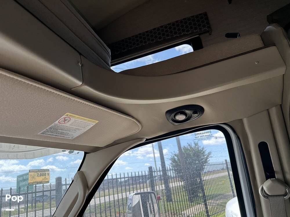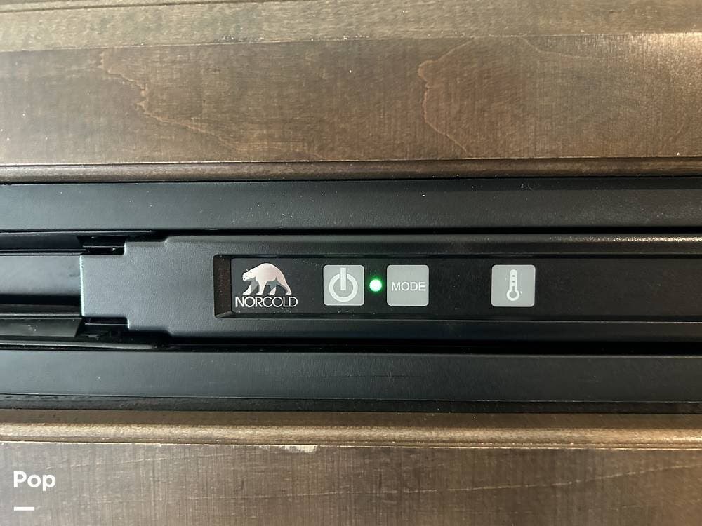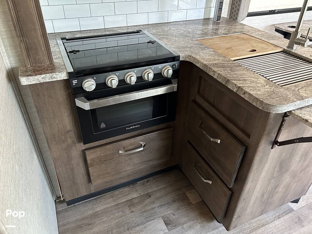 The living area has a kitchen with a convection microwave, stove, refrigerator, and sink. This motorhome's living area is a versatile space that can be easily converted into a bedroom. It features a queen Murphy bed with a comfortable mattress cover, ensuring a good night's sleep.