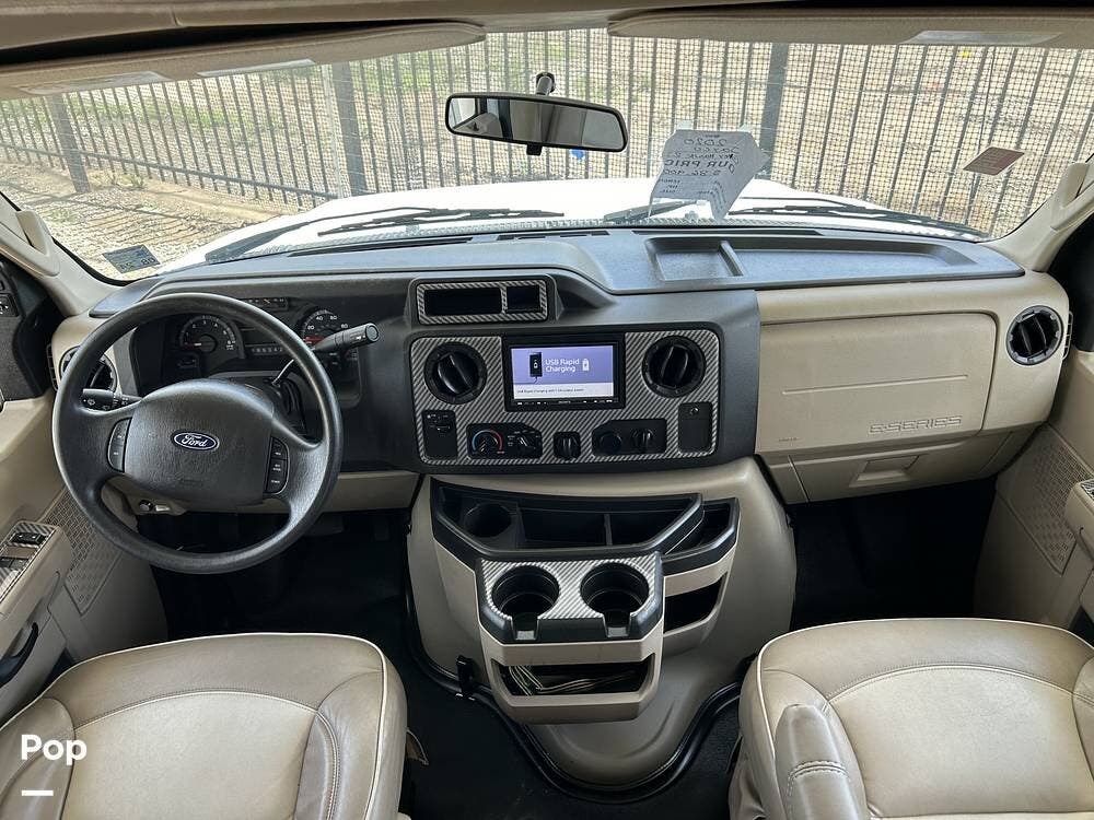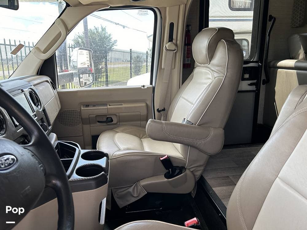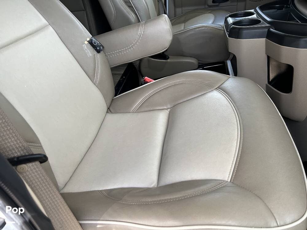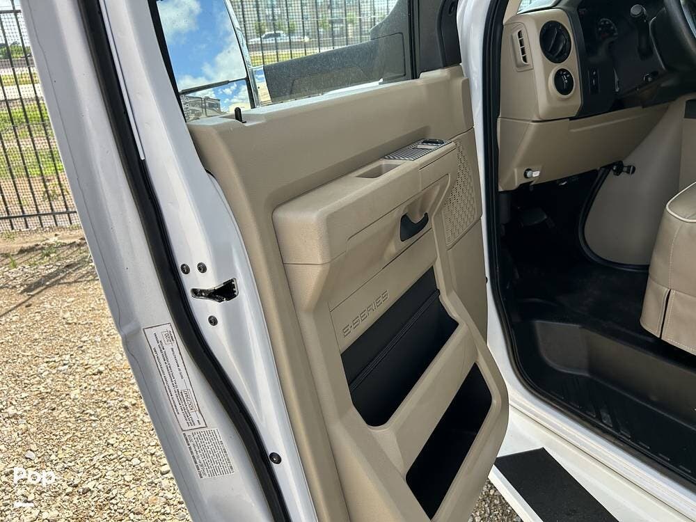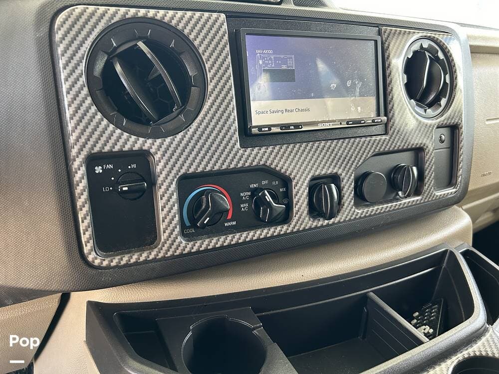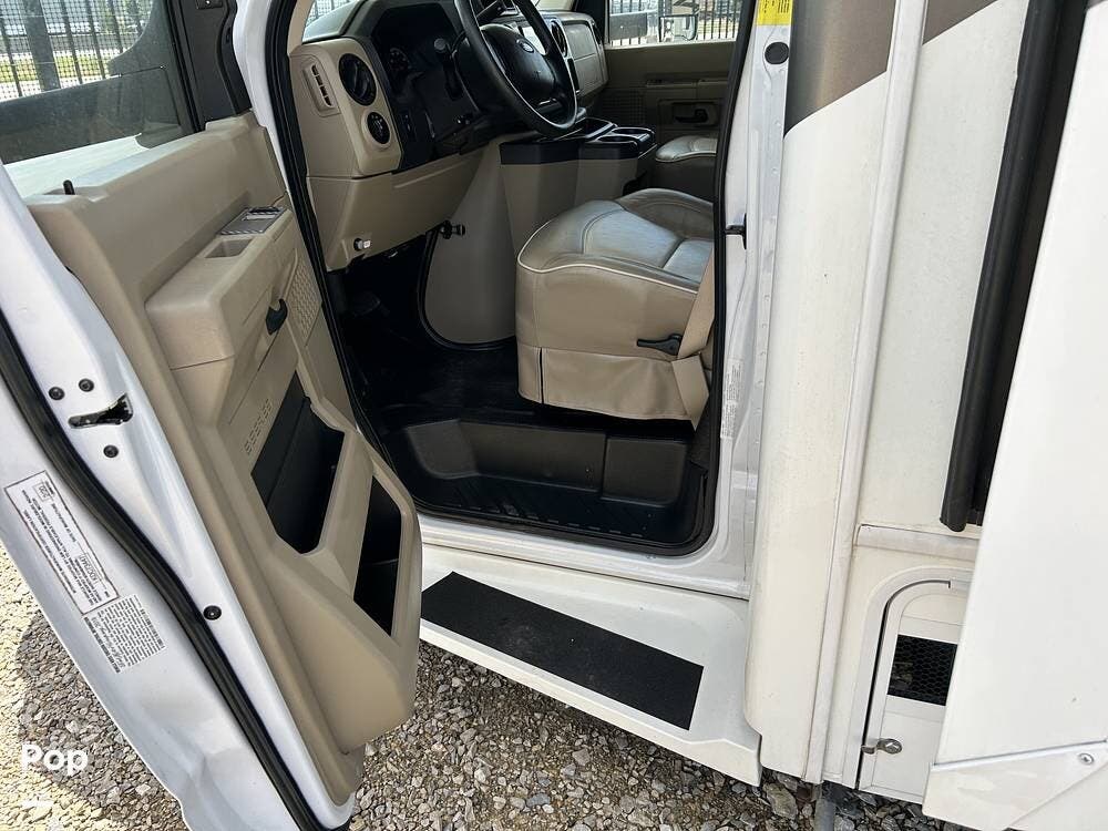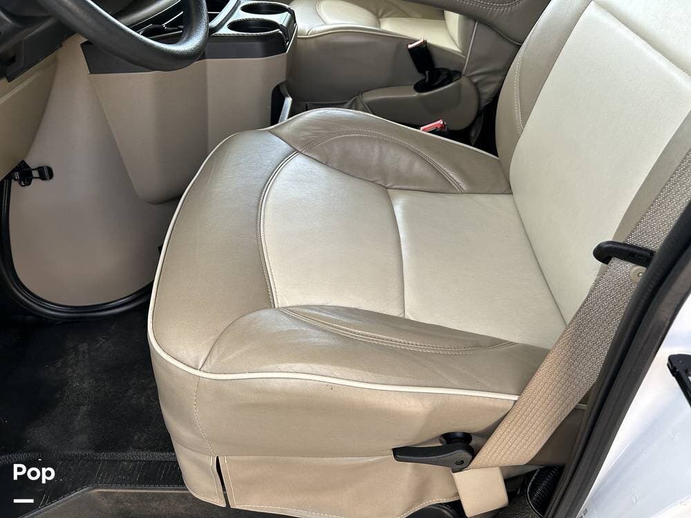 The cab area is very comfortable. It has a dash with all quality controls and bucket seats that swivel to the rear when parked for more seating in the living area.