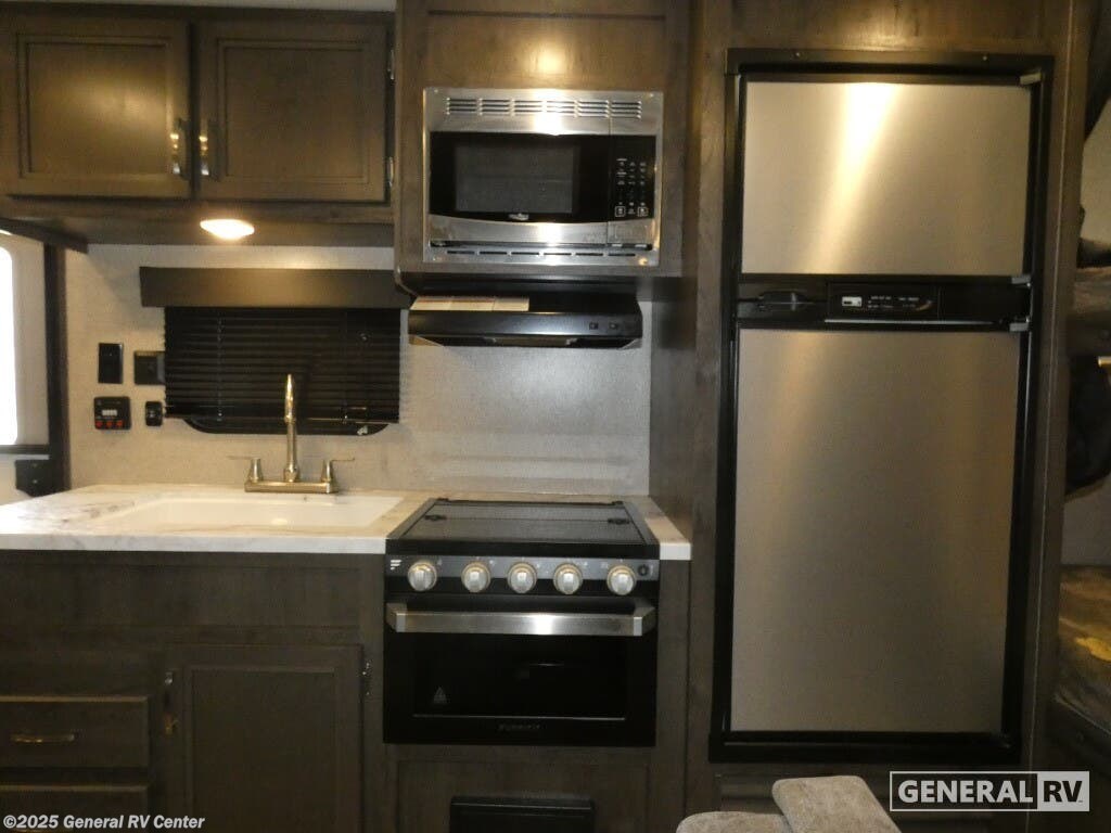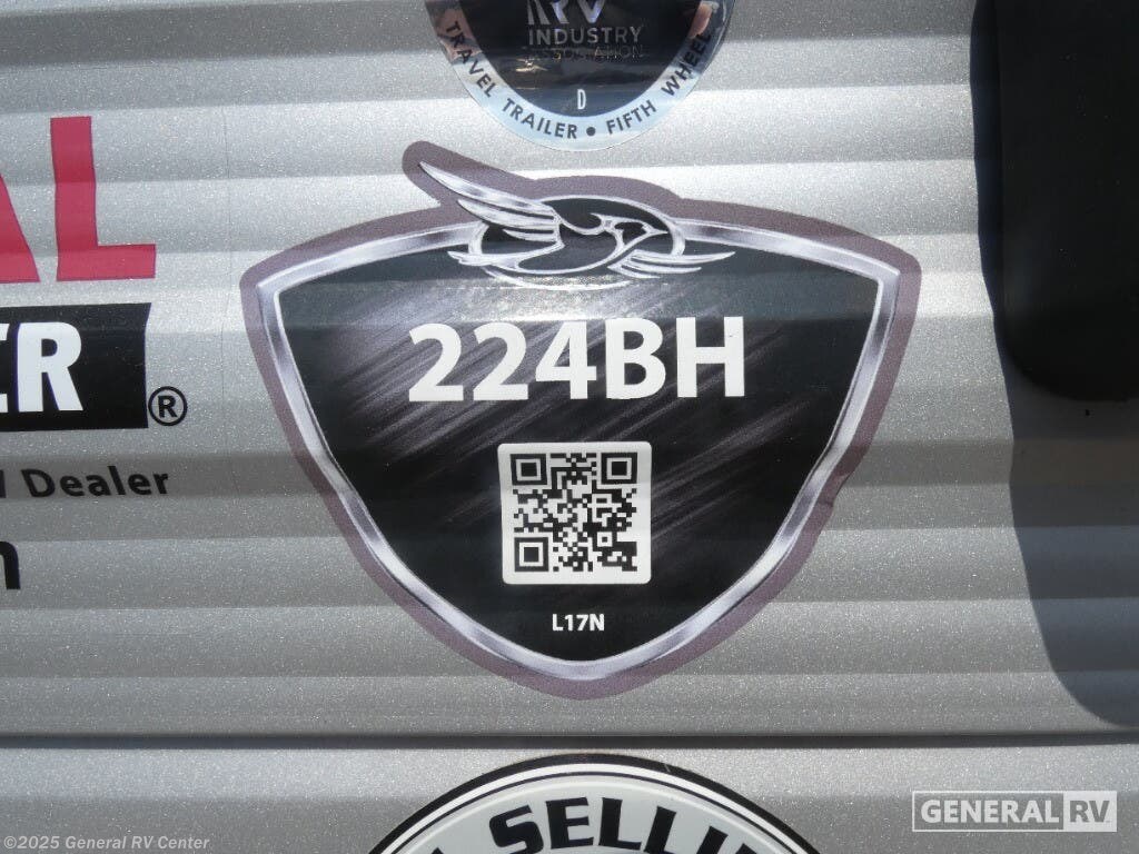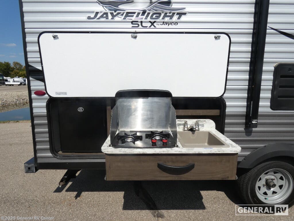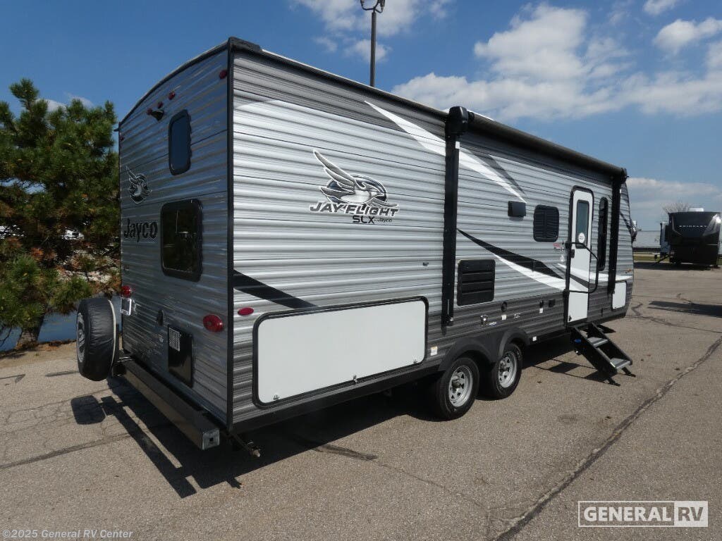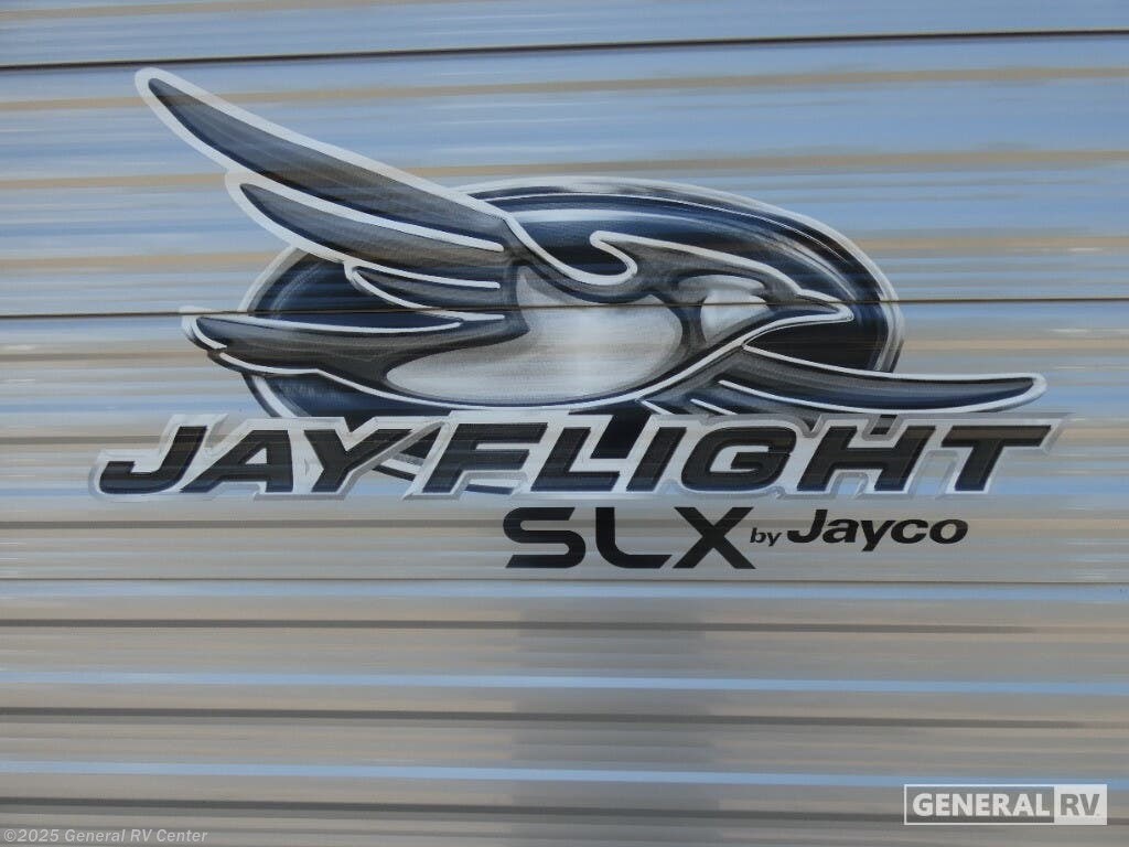 Jayco Jay Flight SLX 8 travel trailer 224BH highlights: Double Size Bunks Semi-Private Bedroom Booth Dinette Outside Kitchen Pass-Through Storage Relax and listen to the music under the 13' power awning with LED lights and speakers while the cook makes a meal on the outside kitchen. You can even grab a drink from the outdoor fridge. When you are ready for some air conditioning, the booth dinette will be a great place to play cards and visit. At night, the kids will love the double size bunks beds and you will appreciate having your own walk-around queen bed with large shelving above to place your things, and solid wood cabinets on each side for your clothing, and a curtain to close for privacy when changing clothes. Each Jay Flight SLX 8 travel trailer by Jayco includes the Magnum Truss Roof system which provides seamless DiFlex II material on the roof and plywood decking, and a fully integrated A-frame and I-class cambered structural steel I-beams which is built to last! The roof-mounted air conditioner will come in handy during the hotter months, and the two propane bottles will help keep your showers hot and your meals warm! And when you need to rinse off yourself, your bikes, or the gear, the outdoor shower will do the trick. Choose the floorplan that fits your adventurous side, and load up the family for fun!