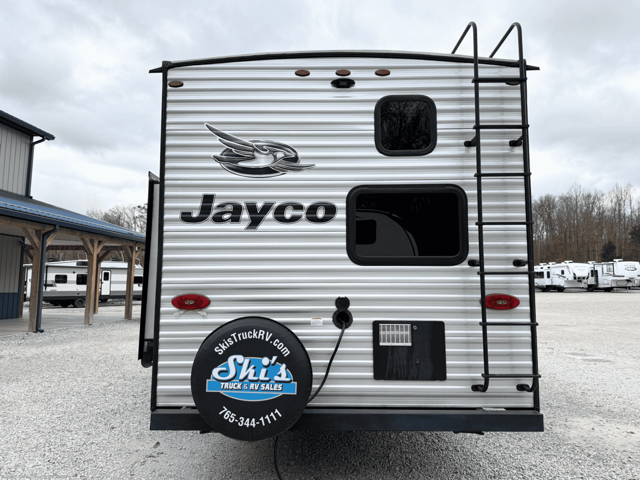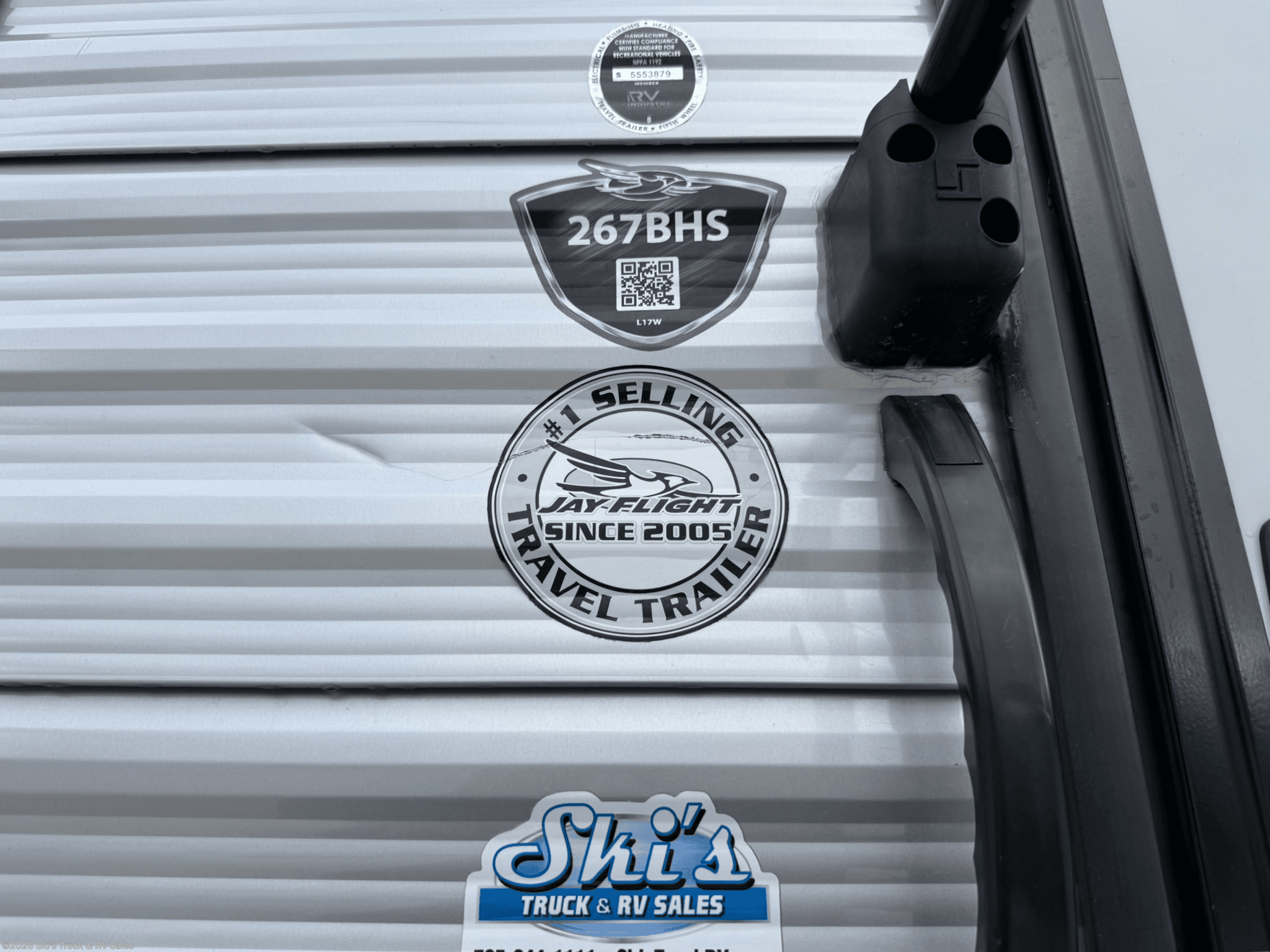 Pre-Owned 2020 Jayco JayFlight SLX-8 267BHS Bunkhouse Travel Trailer; 27 Foot; 1 Slide; Sleeps 8-10; Hitch Weight: 665 Lbs.; Dry Weight: 5870 Lbs.; 30 Amp; Power Tongue Jacks; Manual Stabilizer Jacks; 38 Gal. Fresh Water Cap.; 39 Gal. Black Water Cap.; 39 Gal. Gray Water Cap.; Two 20 Lbs. Propane Tanks; 13,500 BTU AC; 20,000 BTU Furnace; 6 C.F. Gas/Elec. Refrigerator; 6 Gal. Gas/Elec. Water Heater; Microwave; 3-Burner Stove/Oven; Two TV Jacks; AM/FM/CD/DVD; Speakers; Pantry; Booth Dinette; Jack-knife Sofa; Queen Bed; Twin Bunks; One Bathroom with Tub/Shower; 16 Foot Power Awning with LED Lights; Backup Camera Prep.; Outside Kitchen with Grill; Outside Shower; Exterior Storage; Foldup Steps; Roof Ladder; Climate Package; Tinted Windows; Spare Tire; Trade In Unit; Financing Available; Good Pre-Owned Bunkhouse Travel Trailer for the Price: $16,995. Call Skis Truck & RV Sales at 765-344-1111 or visit us at for more information.