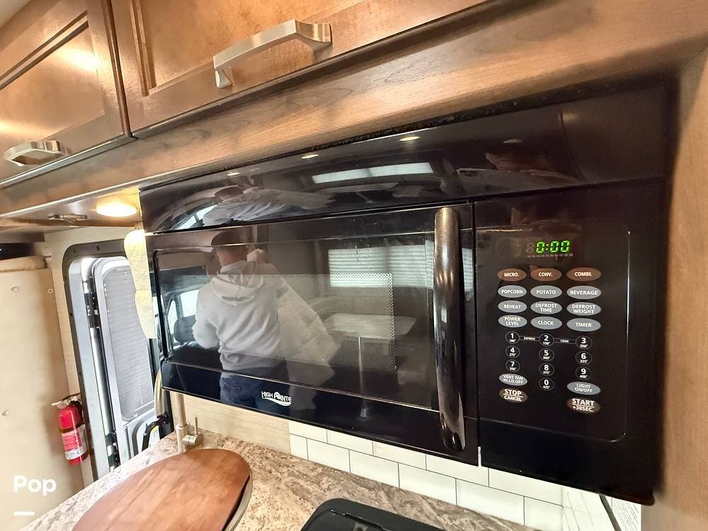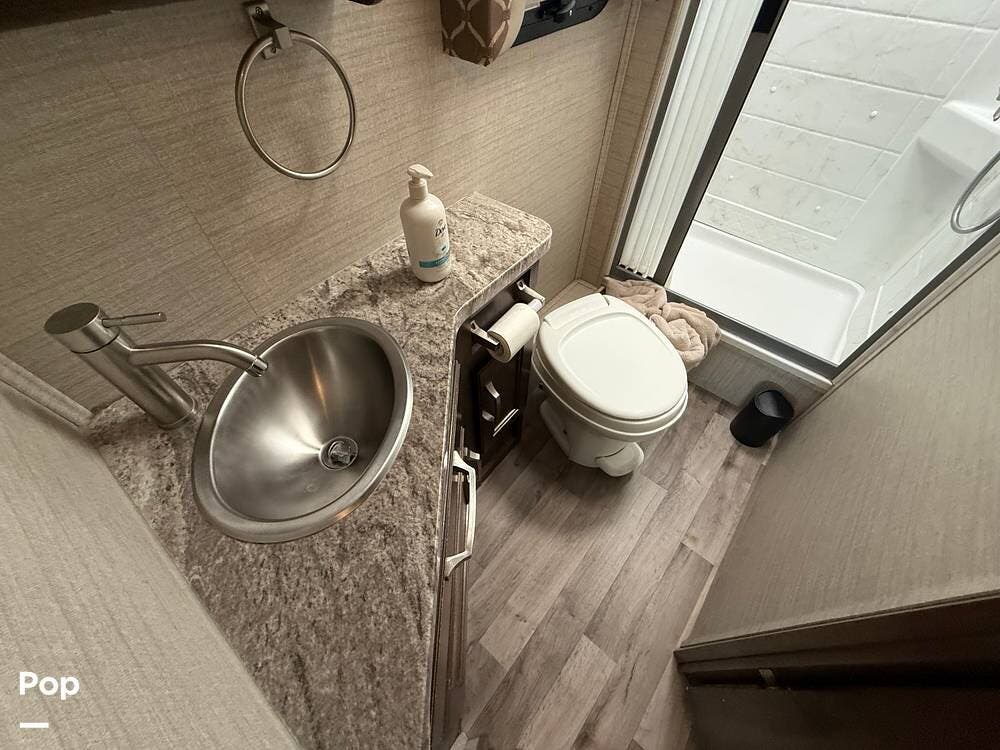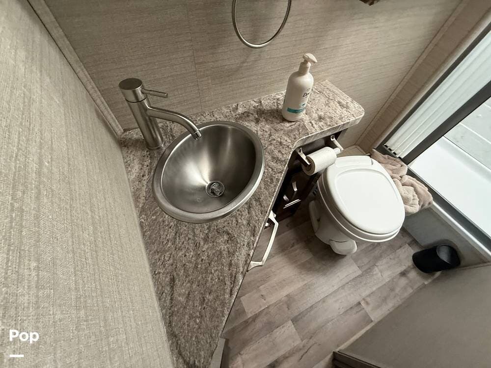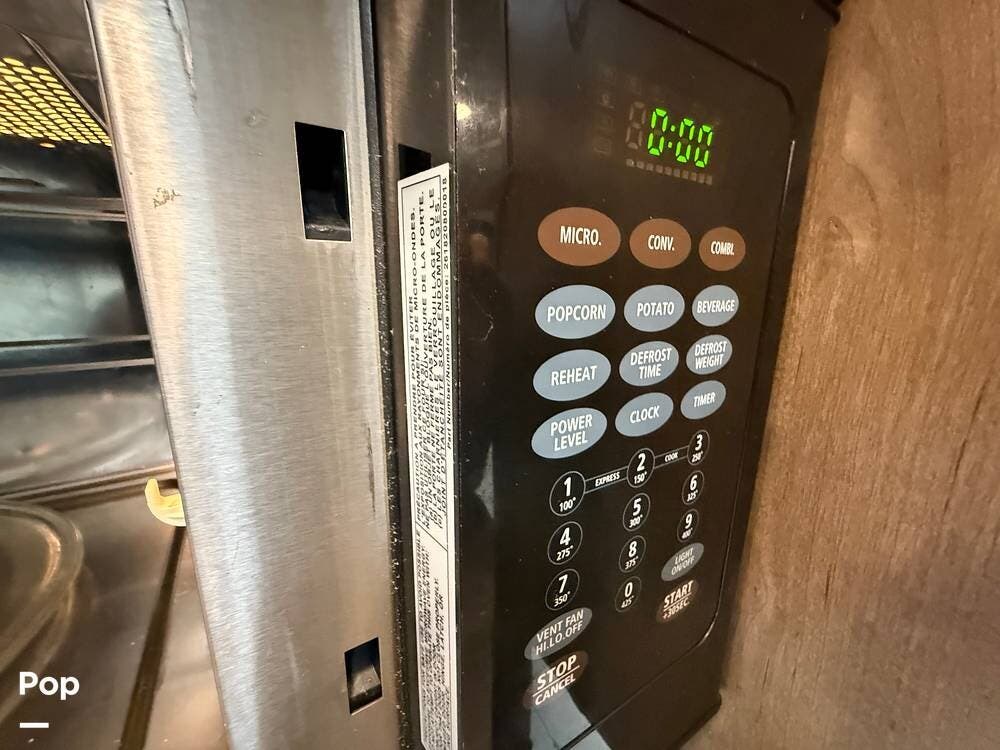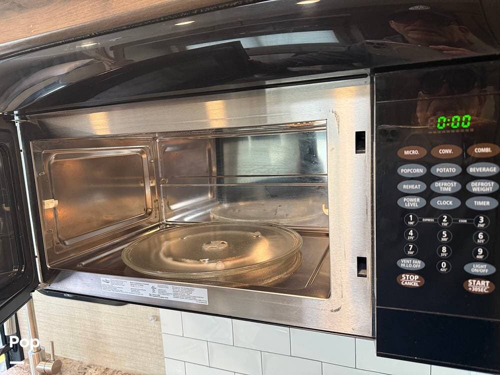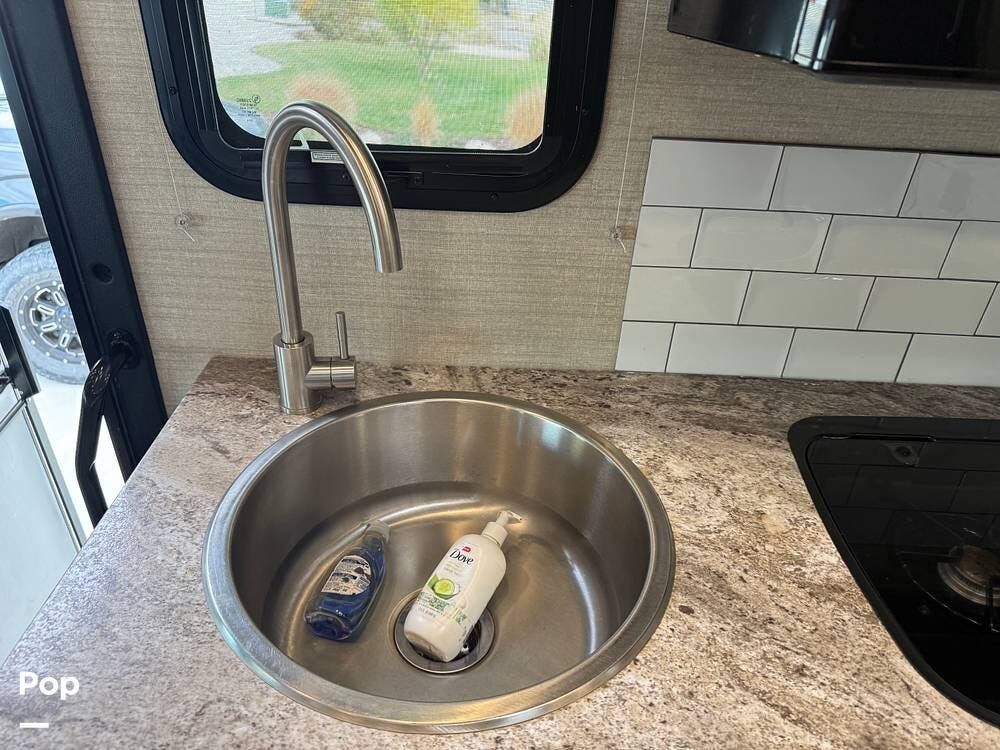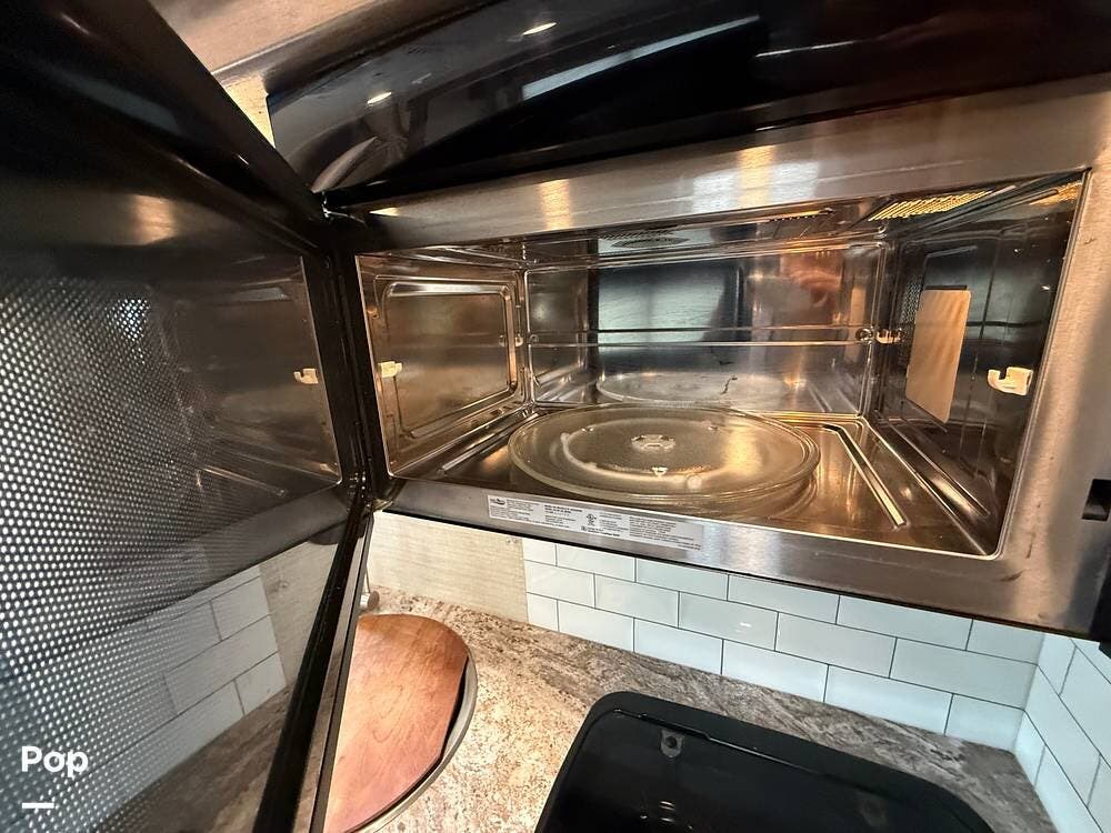 The kitchen is fully equipped with solid-surface countertops, a stainless-steel sink, a convection microwave, and a two-burner cooktop, making meal prep on the road effortless.