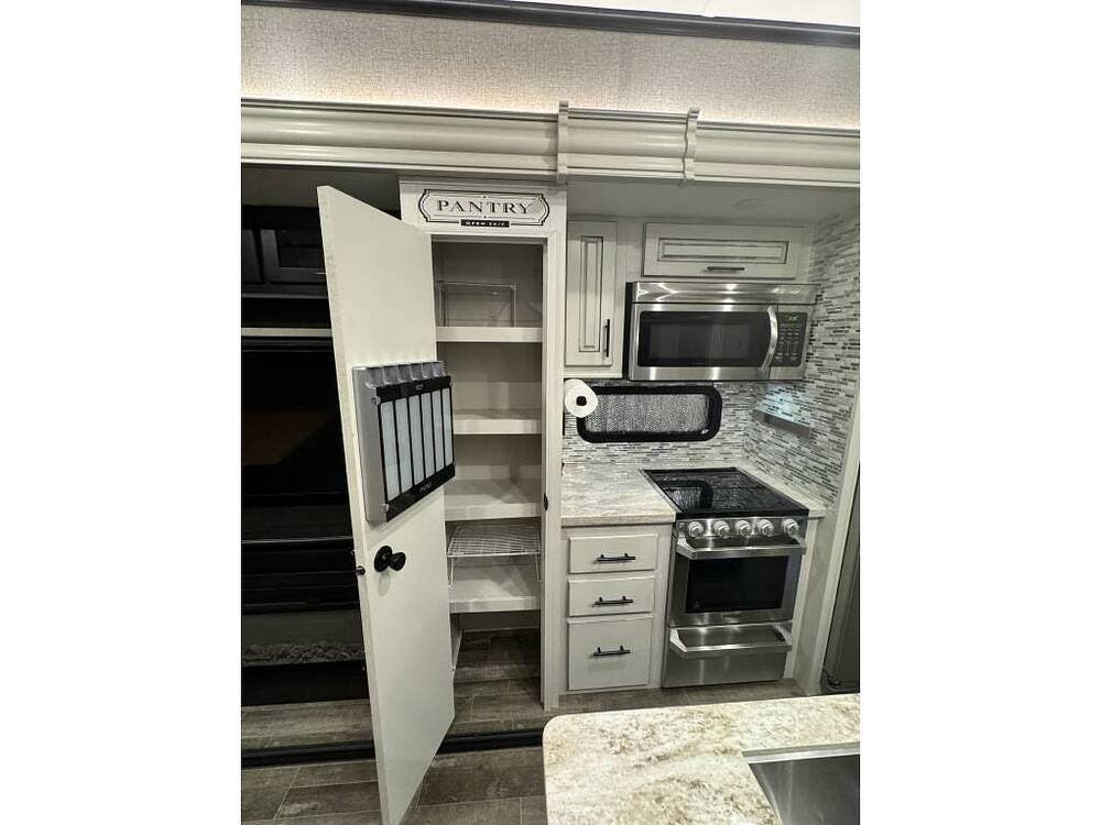 The opposing slideouts in the main living area lend this space a distinctly residential feel, and the fully equipped kitchen is ready for any meal occasion.