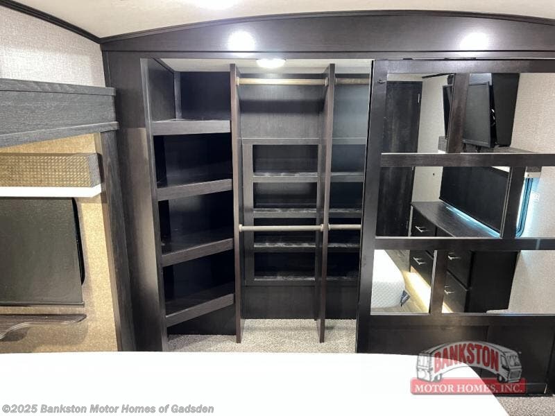 This North Point fifth wheel is too fabulous for words! There is a walk-in closet and 32" TV in the front private bedroom which will make you want to stay in there relaxing for hours on end. When you do decide to venture out, you'll find that the rear separate living room will be just as comfortable with its theater seats and hide-a-bed sofas, plus ottoman and full wall entertainment center with fireplace and a TV with lift. You won't have to worry about where to store things in this unit because it comes with an exterior pass-through storage, as well as a unique rear storage compartment with a sliding tray. You might like to choose a few options such as adding an exterior tailgate TV, a king bed in place of the queen, and maybe a different fridge.