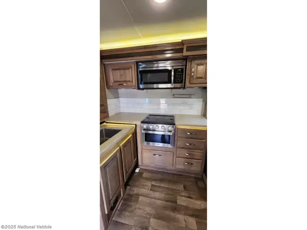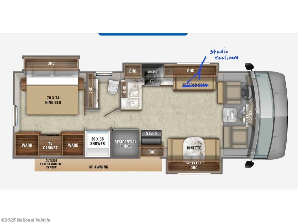 Inside, the 31UL offers a smart and spacious layout. A rear private bedroom includes an RV king bed, overhead storage, and wardrobe space, while the main living area features both automated studio recliners and a convertible dinette/bed for additional sleeping and lounging options and accent lighting option. You will also find more sleeping space with the front drop down oversized double bed. The kitchen is well-equipped with solid-surface countertops, a residential-style refrigerator with in-door water and ice dispensers, three-burner cooktop, microwave, and ample cabinetry. The bathroom provides a separate roomy shower and functional layout, keeping comfort and privacy in mind for longer stays.