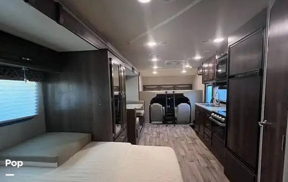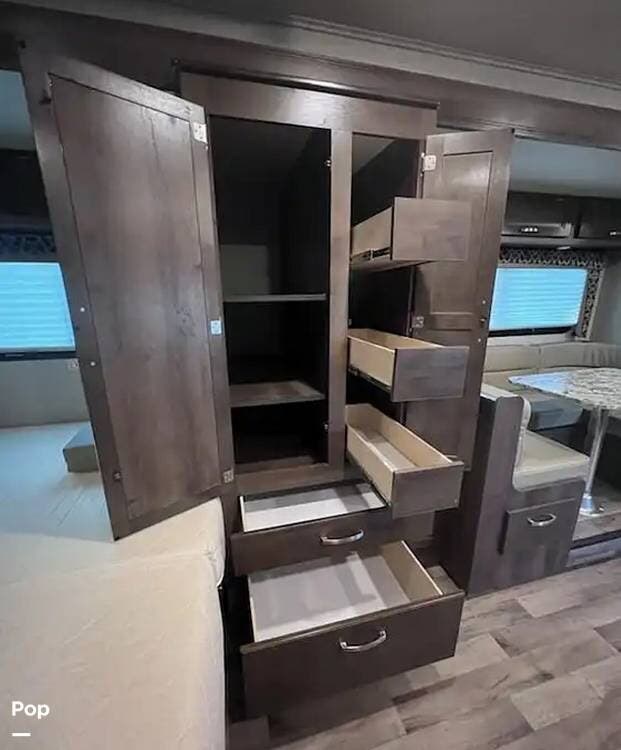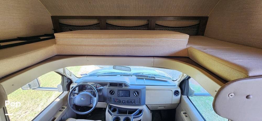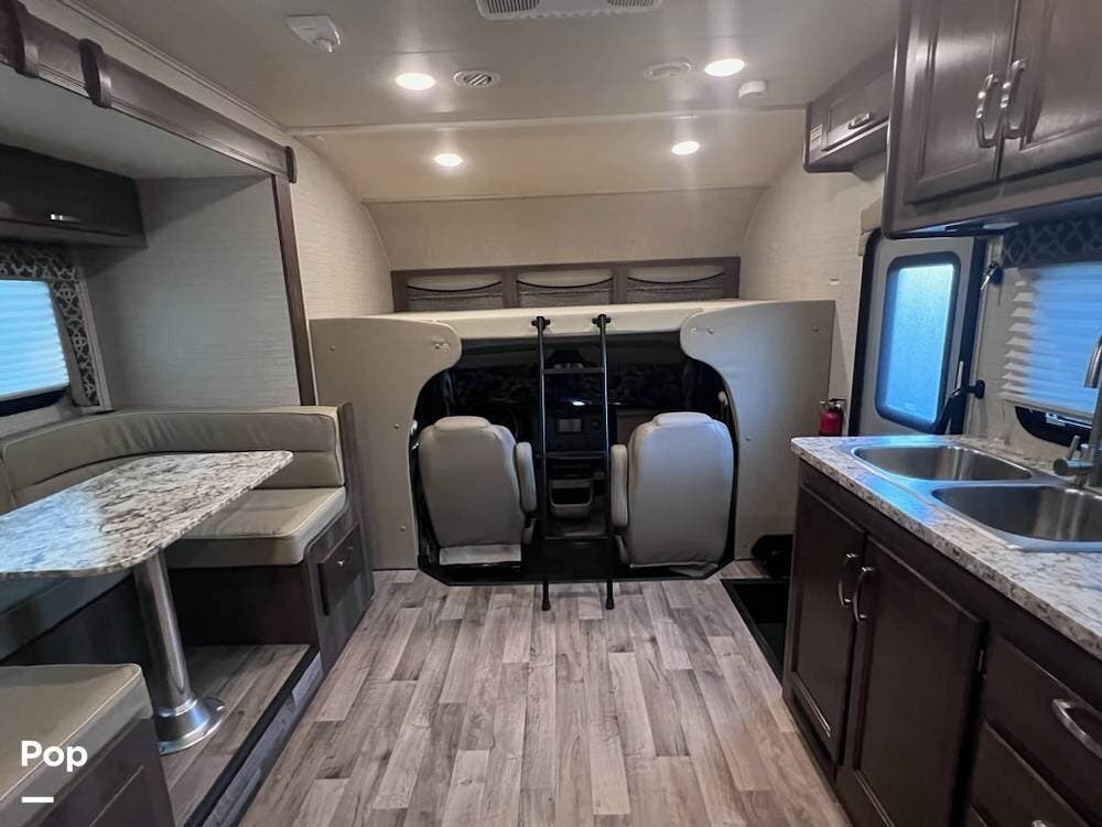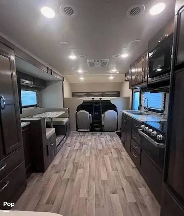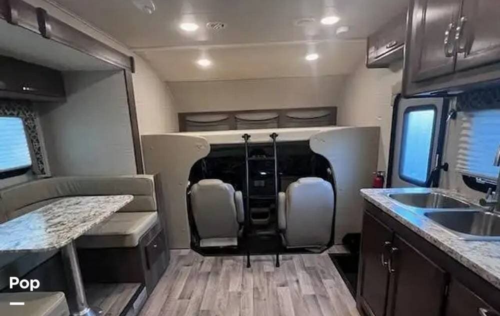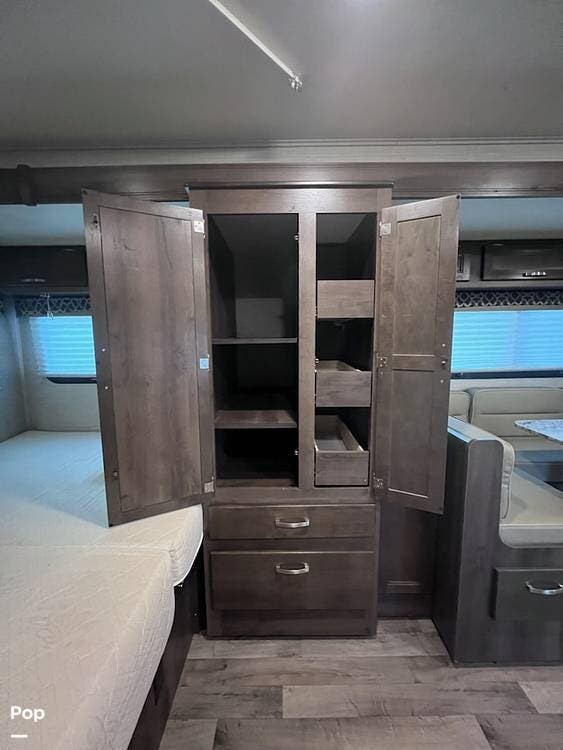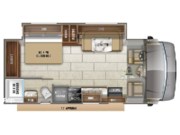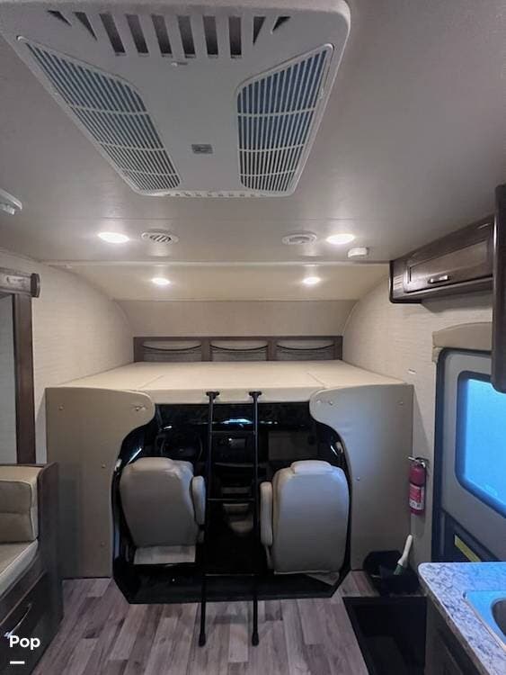 This 26-foot class C features three sleeping areas, a full kitchen with microwave, stove, and oven, and a backup camera/monitor for safe maneuvering in tight spaces.