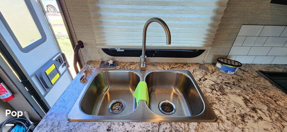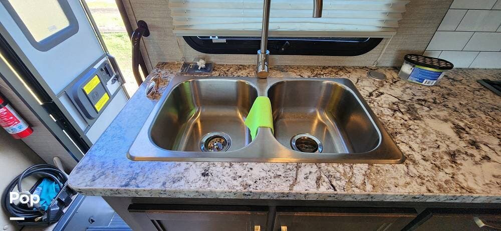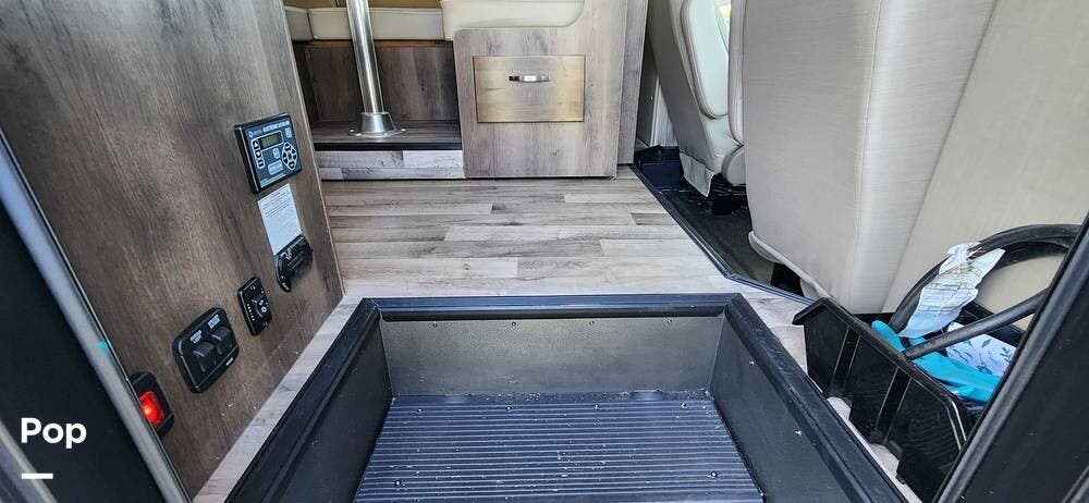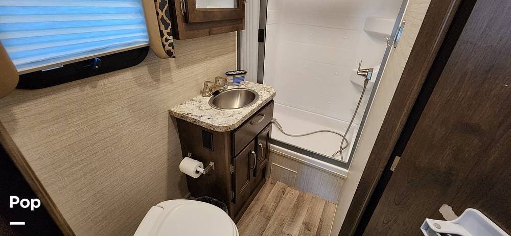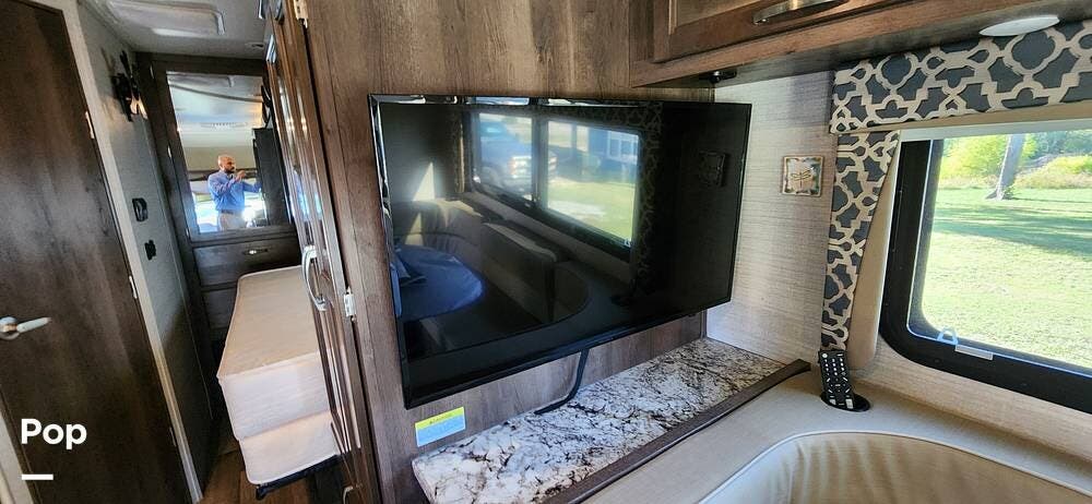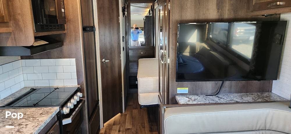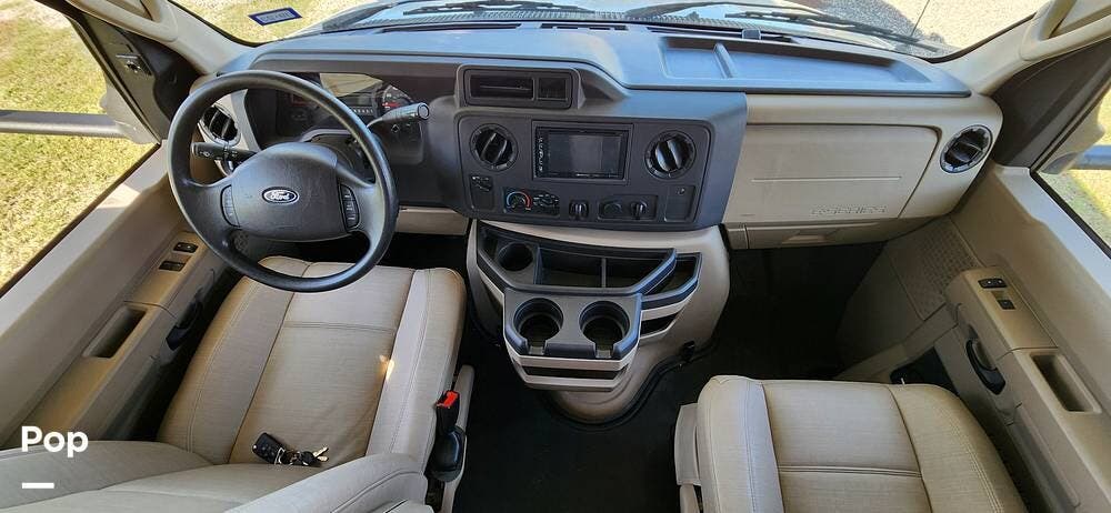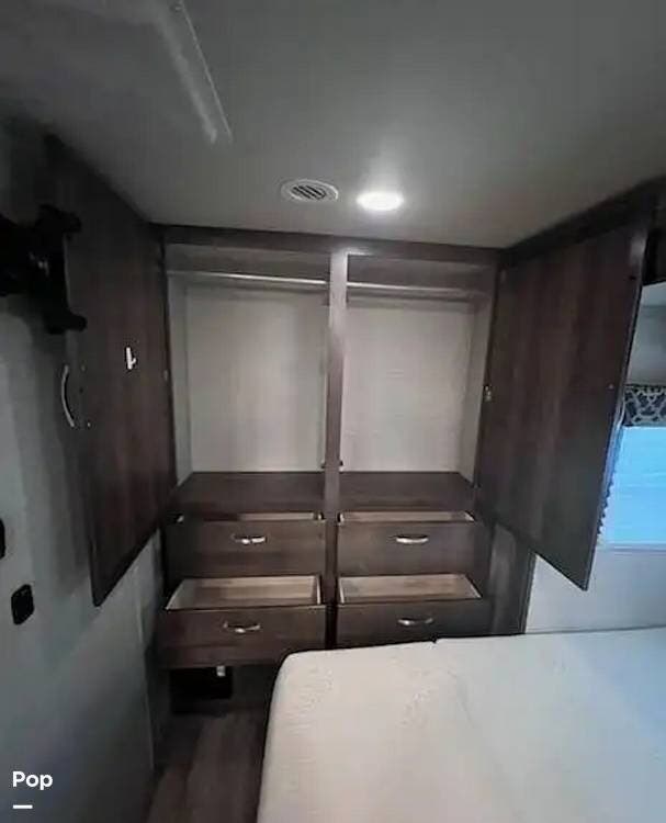 This 26-foot class C features three sleeping areas, a full kitchen with microwave, stove, and oven, and a backup camera/monitor for safe maneuvering in tight spaces.